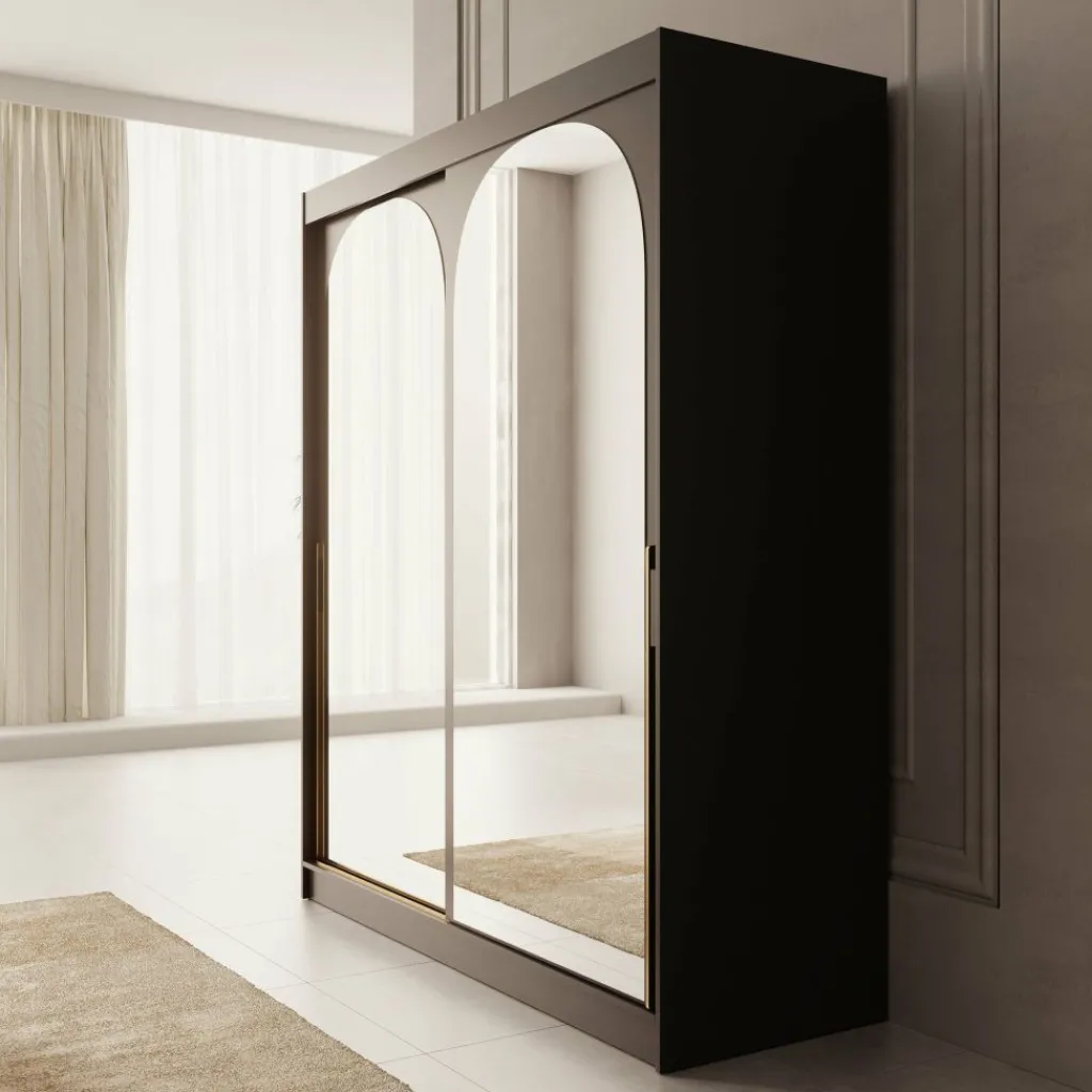 De Moniq kledingkast in zwart combineert stijl met functionaliteit. De spiegeldeuren zorgen voor meer licht en diepte in de kamer. Binnenin vind je meerdere legplanken en roedes voor het overzichtelijk opbergen van kleding en accessoires. De schuifdeuren bewegen soepel over stevige rails en de kast is eenvoudig schoon te houden.