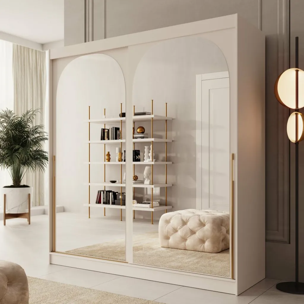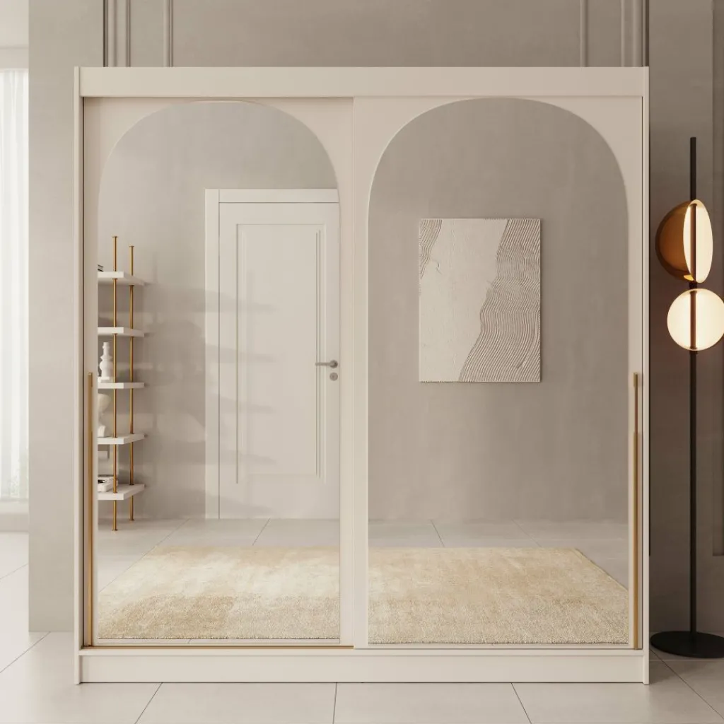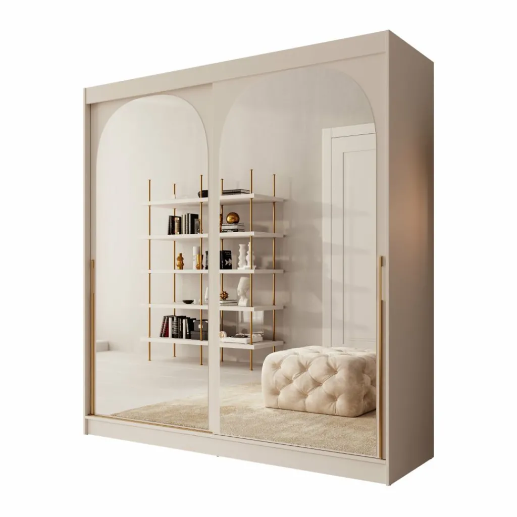 De Moniq kledingkast in beige is de grootste variant uit de serie. De brede schuifdeuren met spiegels zorgen voor een open en lichte uitstraling. Binnenin is de kast voorzien van meerdere vakken en roedes, waardoor kleding, schoenen en accessoires eenvoudig kunnen worden georganiseerd. De soepele schuifdeuren en stevige constructie maken de kast praktisch en duurzaam.