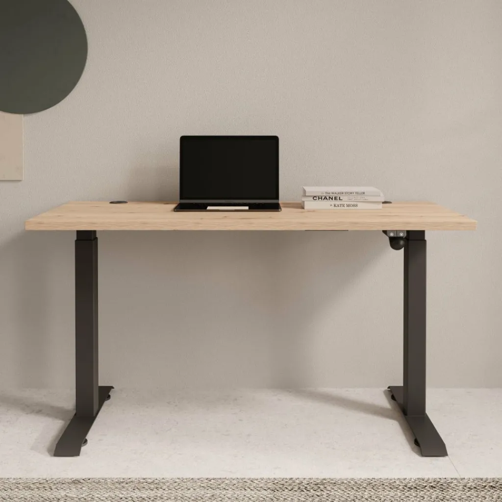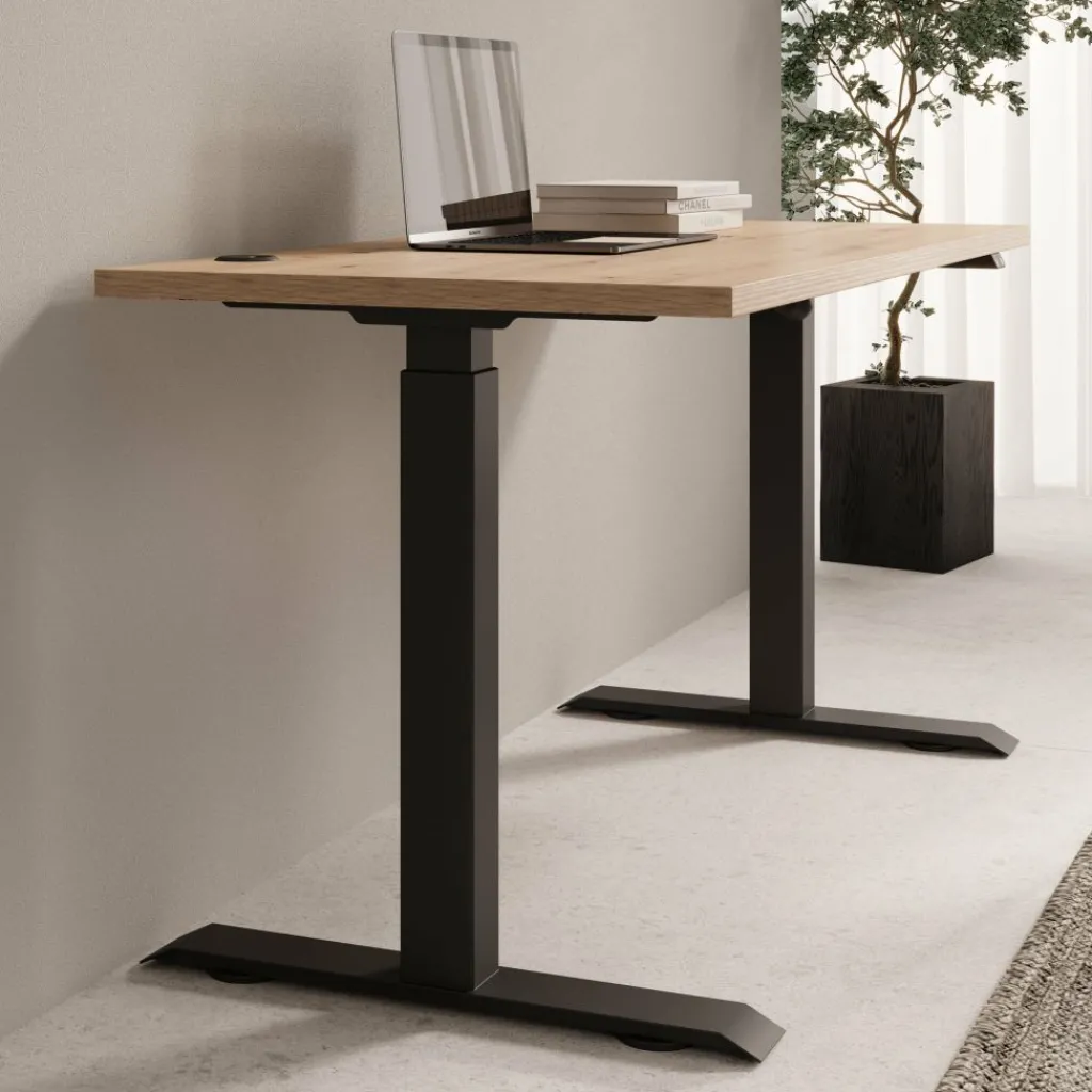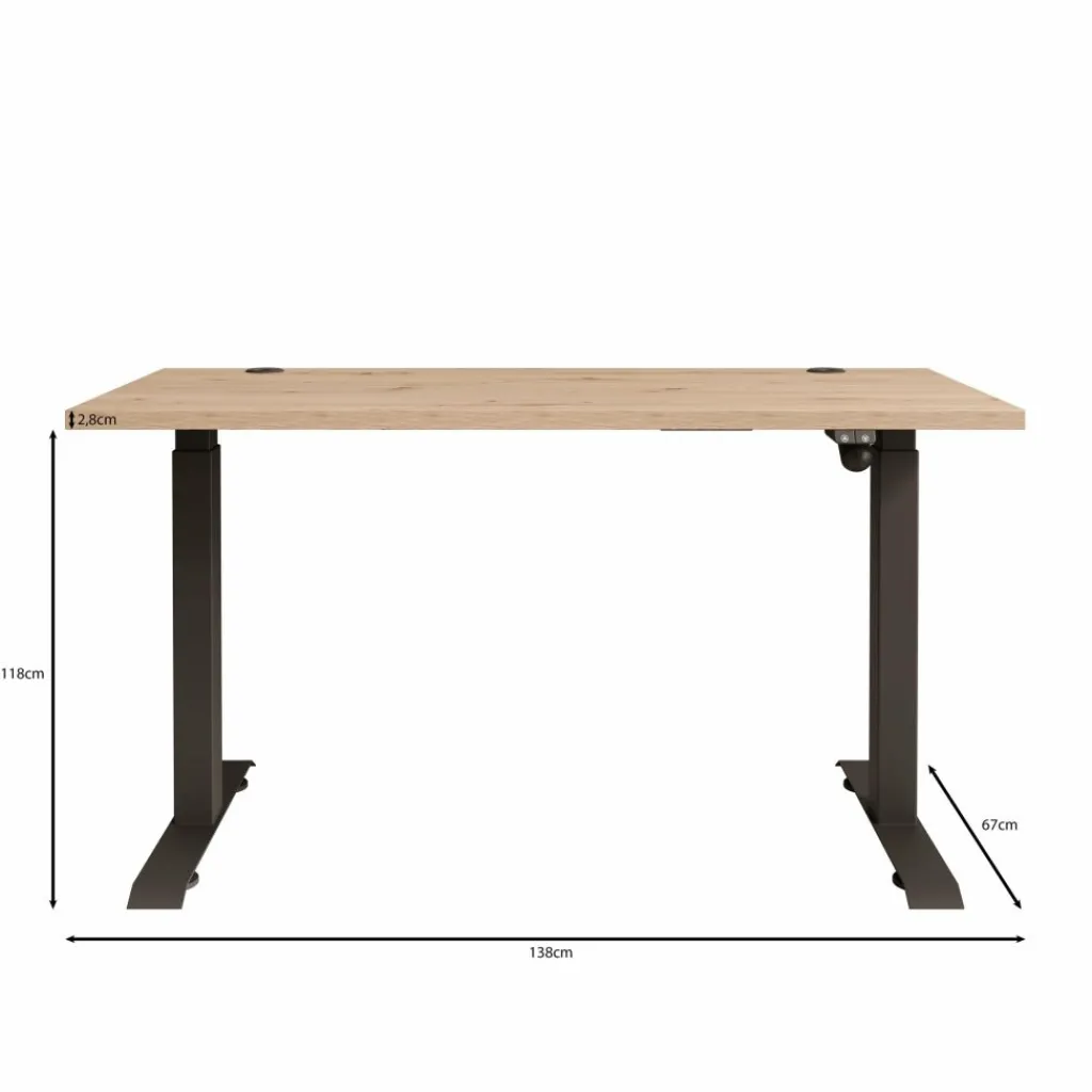 Het werkblad meet 138×67 cm en biedt voldoende ruimte voor je laptop, scherm en accessoires. De hoogte is verstelbaar van 70 tot 118 cm, zodat je altijd een ergonomische werkhouding hebt. Twee kabeldoorvoeren in het blad zorgen voor een opgeruimd bureau.