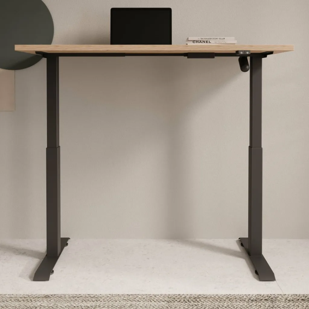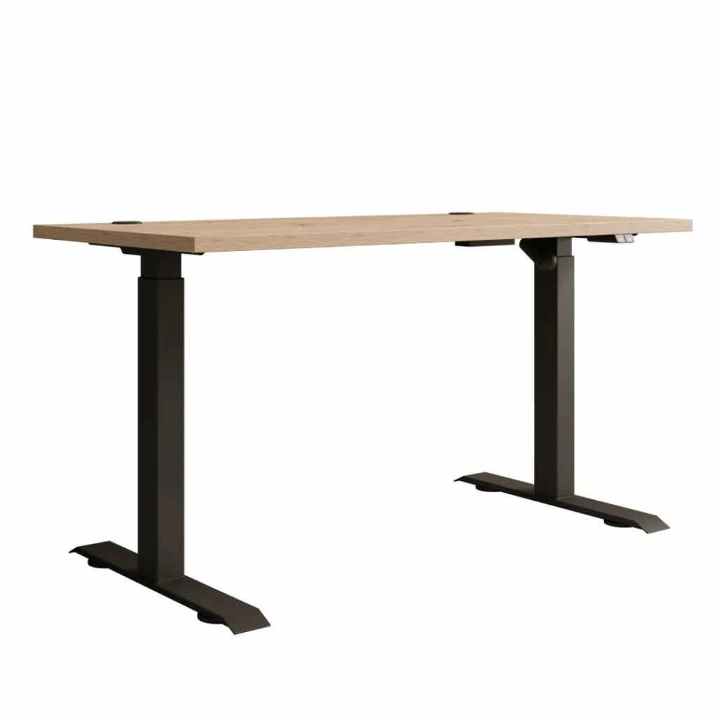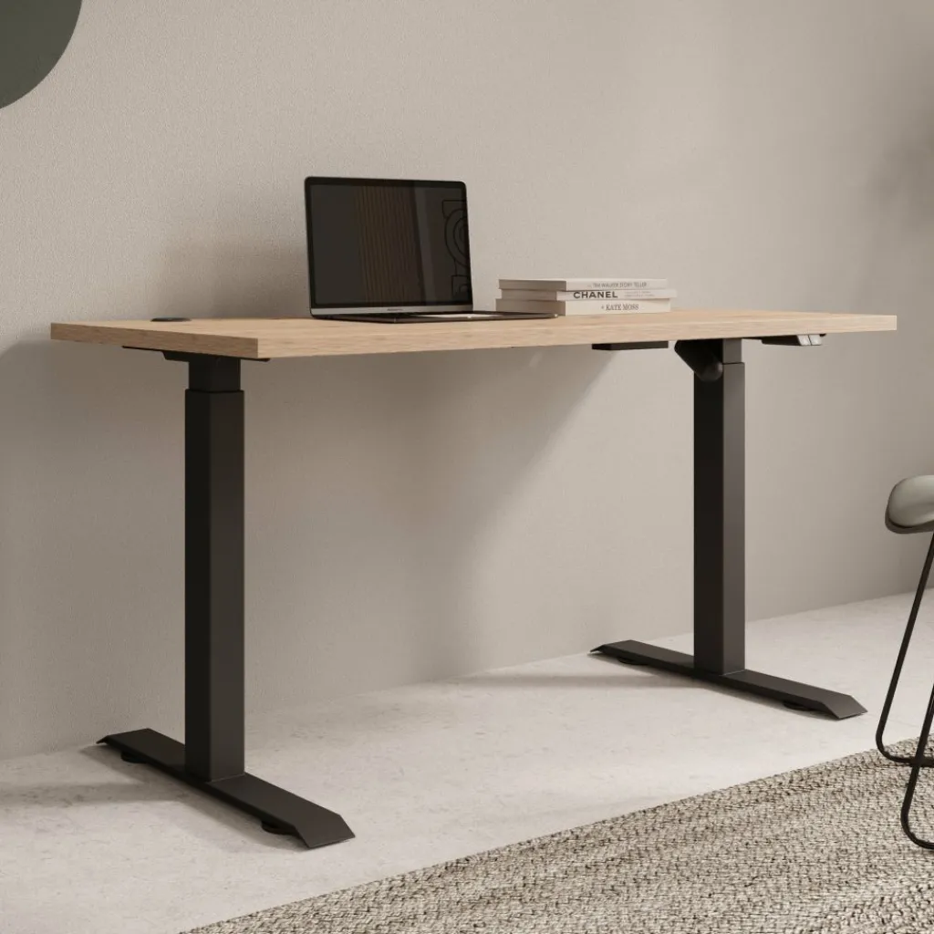 Het werkblad meet 138×67 cm en biedt voldoende ruimte voor je laptop, scherm en accessoires. De hoogte is verstelbaar van 70 tot 118 cm, zodat je altijd een ergonomische werkhouding hebt. Twee kabeldoorvoeren in het blad zorgen voor een opgeruimd bureau.