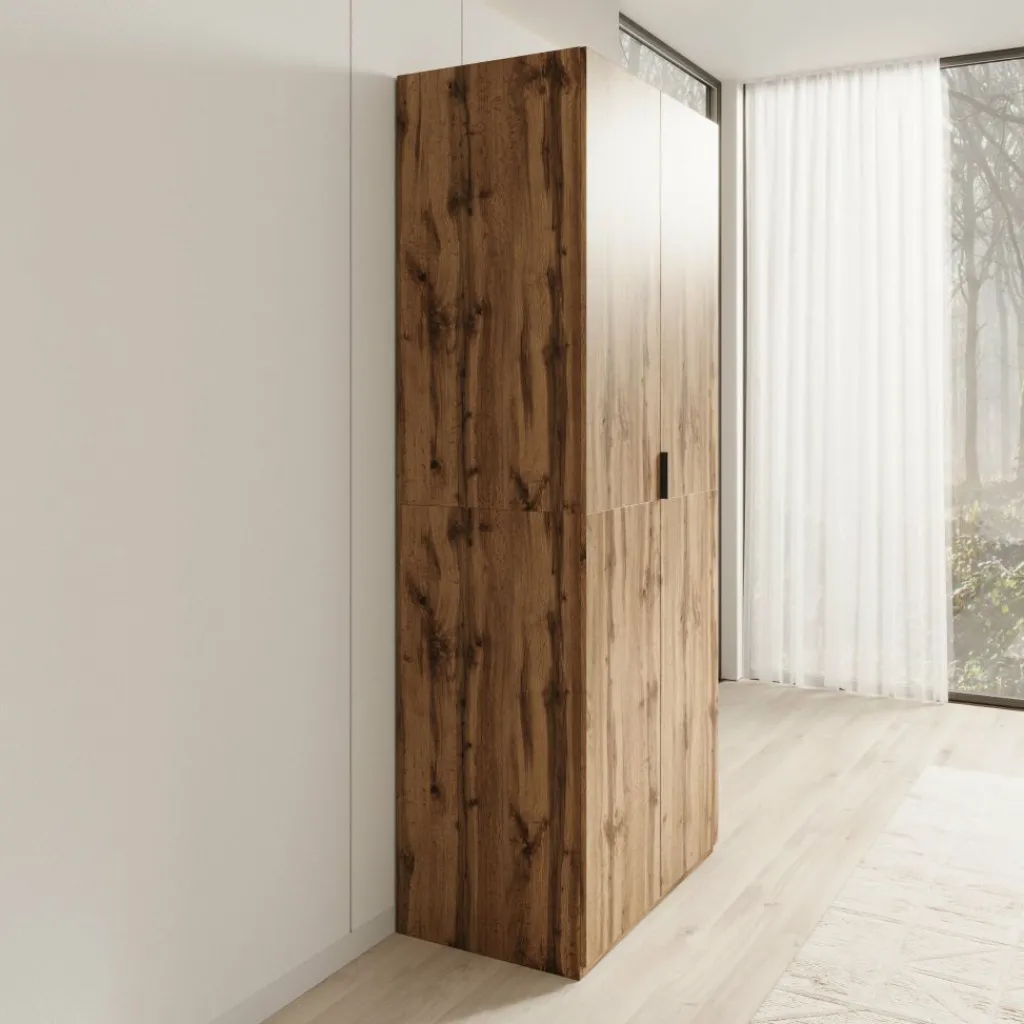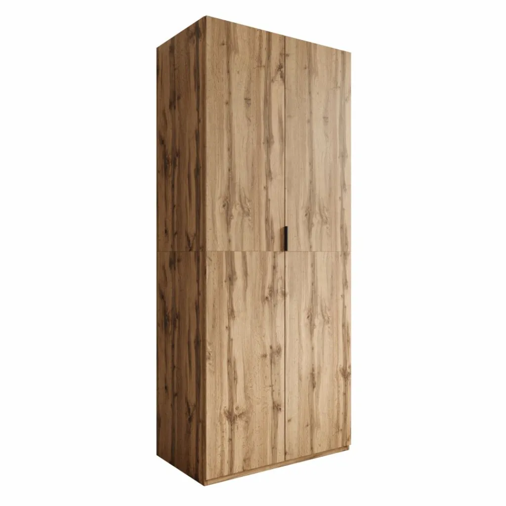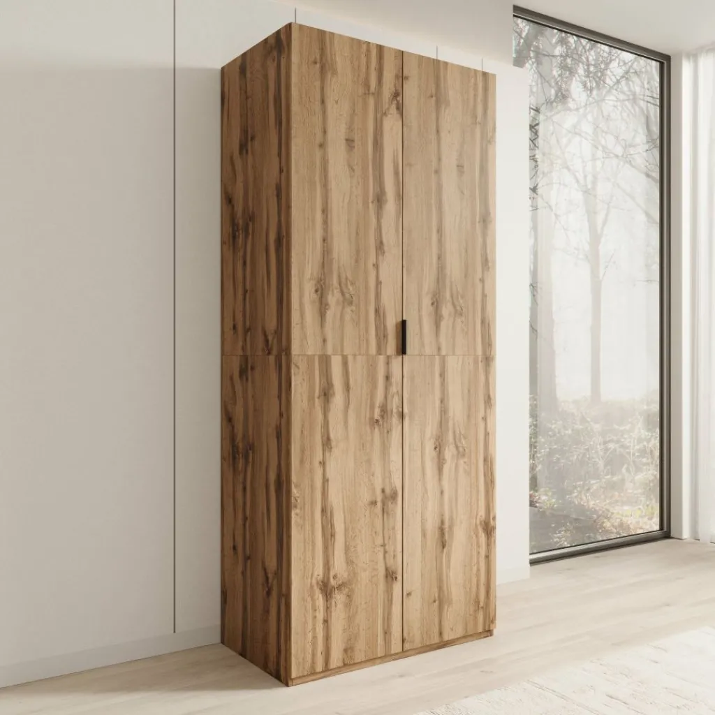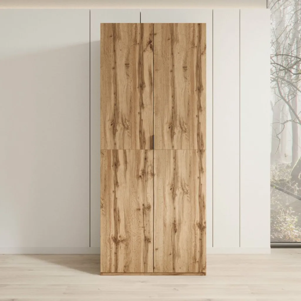 Montclair kledingkast met twee deuren in eikenpatroon is een hoge, smalle kast voor het opbergen van kleding in de slaapkamer of hal. Met een breedte van 90 cm, een diepte van 53 cm en een hoogte van 215 cm biedt deze kast veel verticale opbergruimte zonder veel vloeroppervlak in te nemen.
