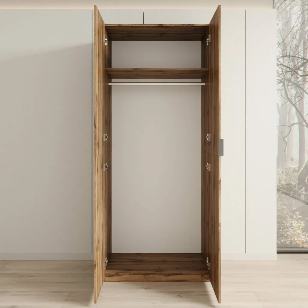 De kast is uitgevoerd met twee draaideuren. Aan de binnenzijde is ruimte om kleding op te hangen, met daarboven een plank voor het opbergen van bijvoorbeeld dozen, tassen of seizoenskleding. De indeling is overzichtelijk en praktisch voor dagelijks gebruik.