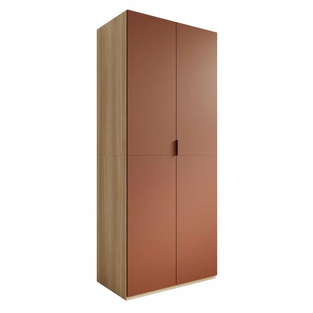 Montclair kledingkast met twee deuren in terracotta met eikenpatroon is een hoge kast voor het opbergen van kleding in de slaapkamer of hal. Met een breedte van 90 cm, een diepte van 53 cm en een hoogte van 215 cm biedt deze kast veel opbergruimte in een slank formaat.