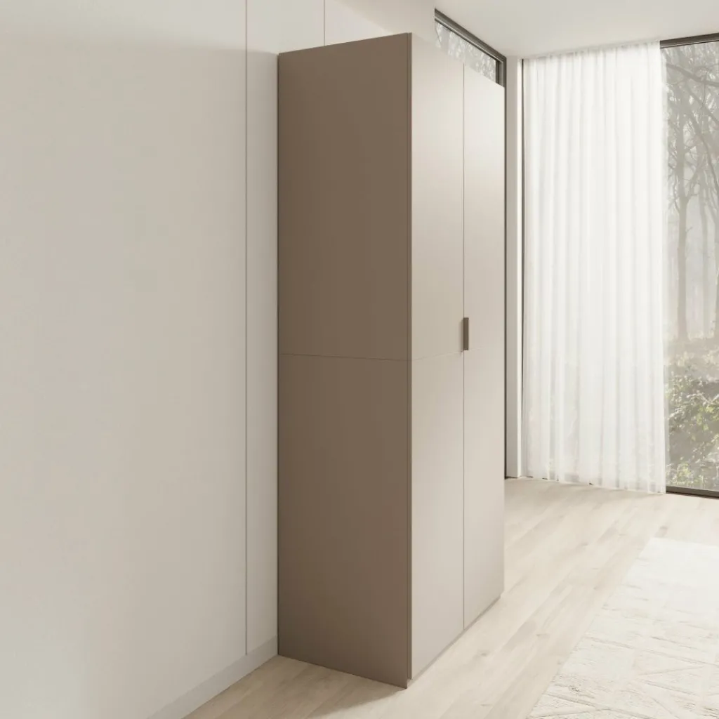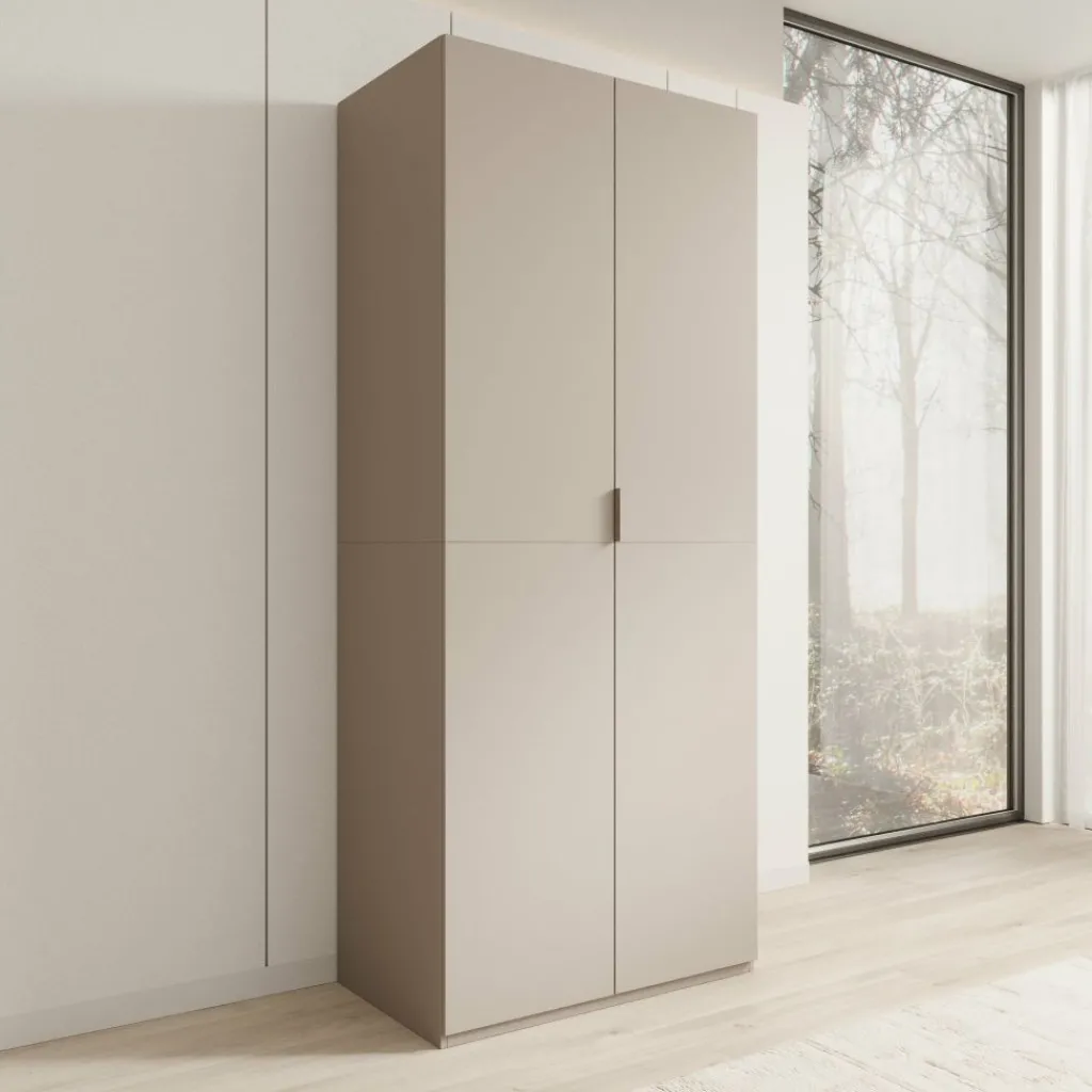 Montclair kledingkast met twee deuren in beige is een hoge, smalle kast die geschikt is voor het opbergen van kleding in de slaapkamer of hal. Met een breedte van 90 cm, een diepte van 53 cm en een hoogte van 215 cm biedt deze kast veel verticale opbergruimte zonder veel vloeroppervlak in te nemen.