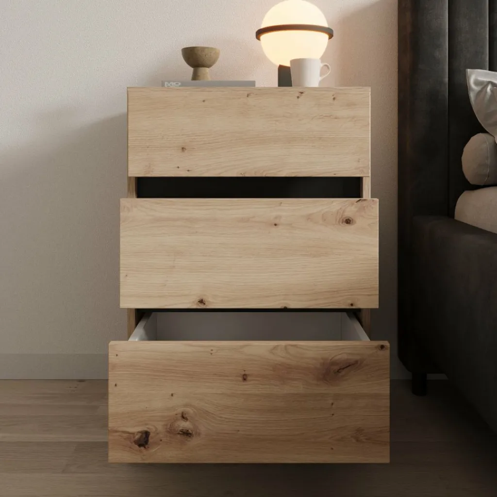 De kast beschikt over drie lades met een greeploos front. De bovenste lade open je aan de onderzijde, terwijl de middelste en onderste lade via de bovenzijde openen. Zo blijven de fronten strak en berg je moeiteloos kleinere spullen op zoals kabels, accessoires en persoonlijke items.