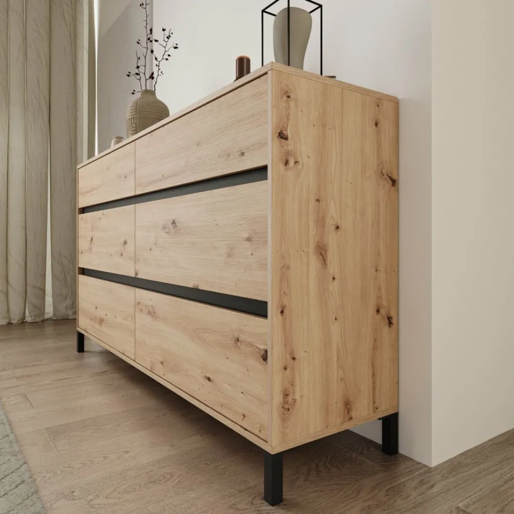 Het eikenpatroon geeft het meubel een duidelijke houtstructuur die zich makkelijk laat combineren met andere materialen in de ruimte. Het bovenblad biedt plaats voor accessoires of praktische items, terwijl de brede lade-indeling zorgt voor een overzichtelijke indeling in slaapkamer, hal of woonkamer.