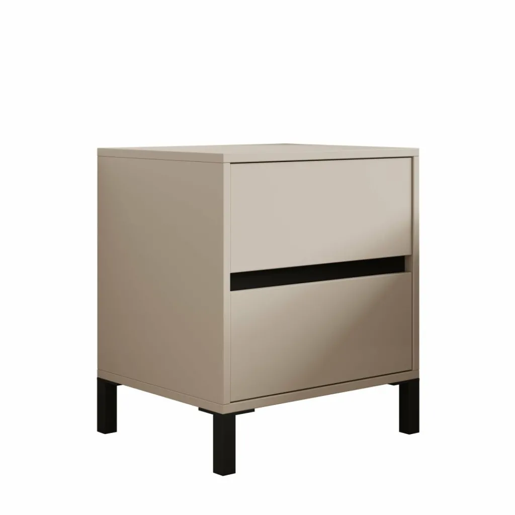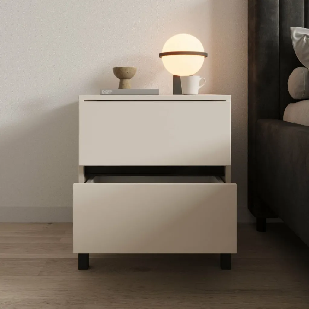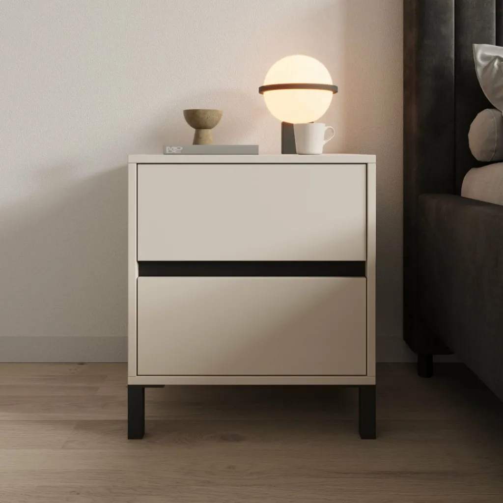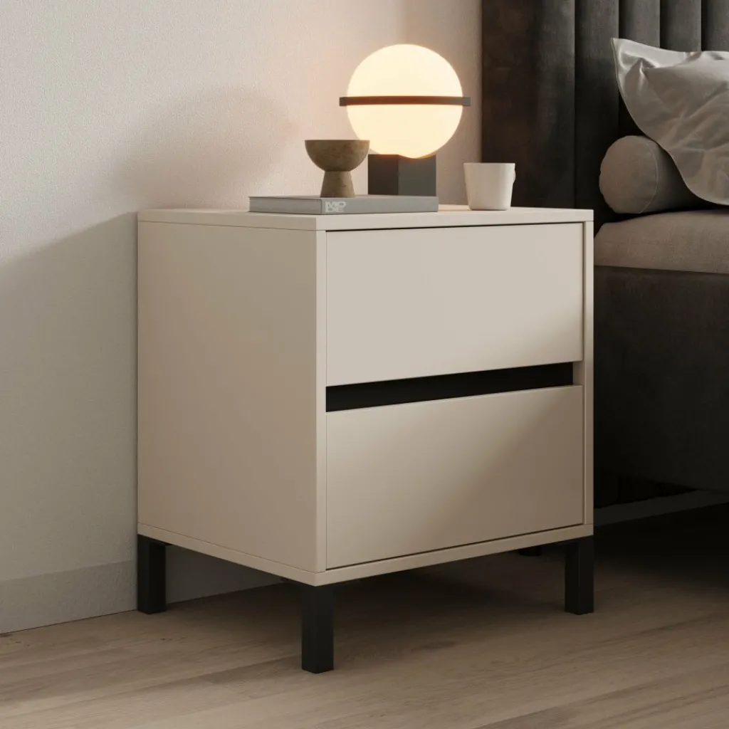 Het bovenblad is geschikt voor een nachtlamp, wekker of boek en blijft goed bereikbaar door de praktische hoogte naast het bed. Door de combinatie van de beige afwerking en de zwarte poten laat het meubel zich makkelijk combineren met zowel lichte als donkere bedden en vloeren.