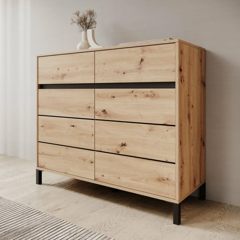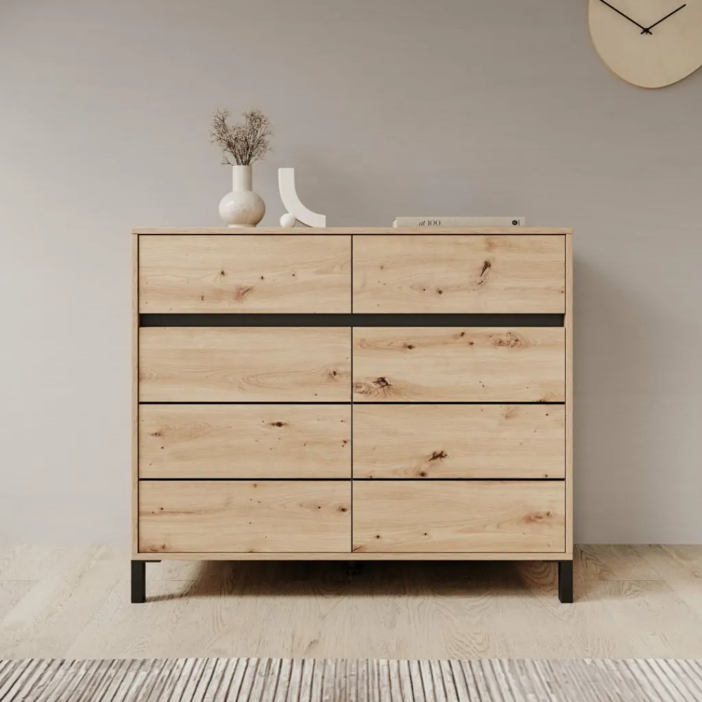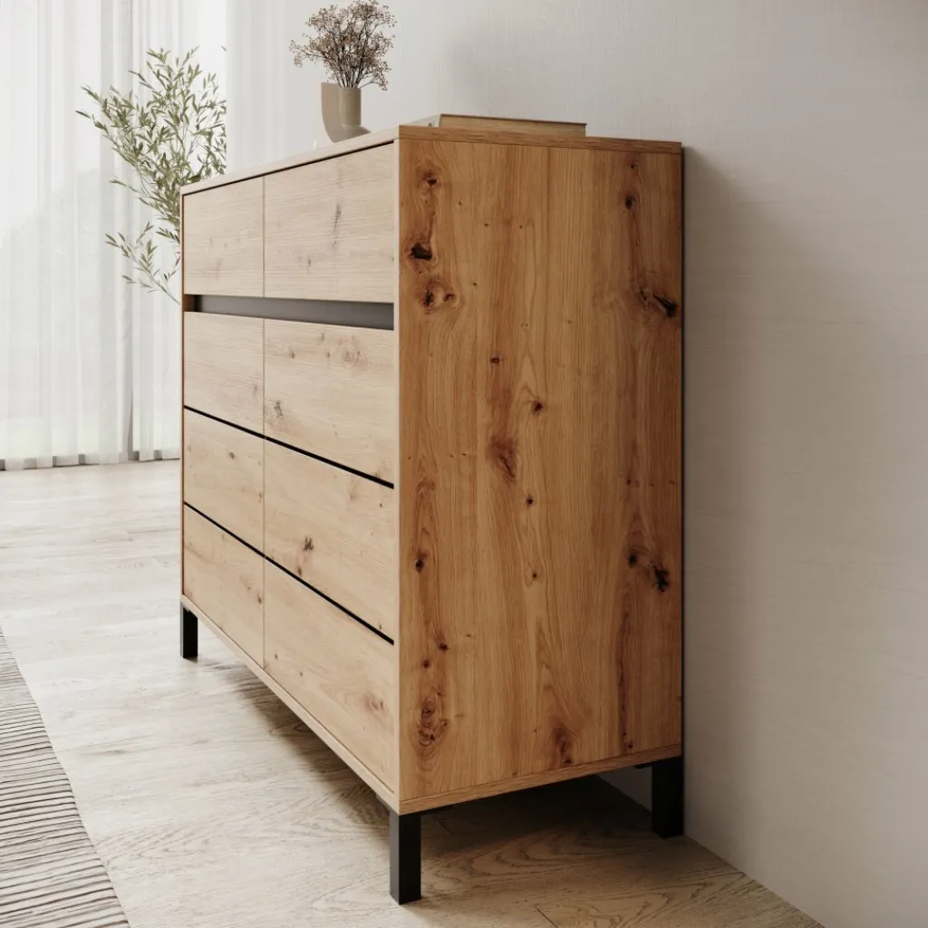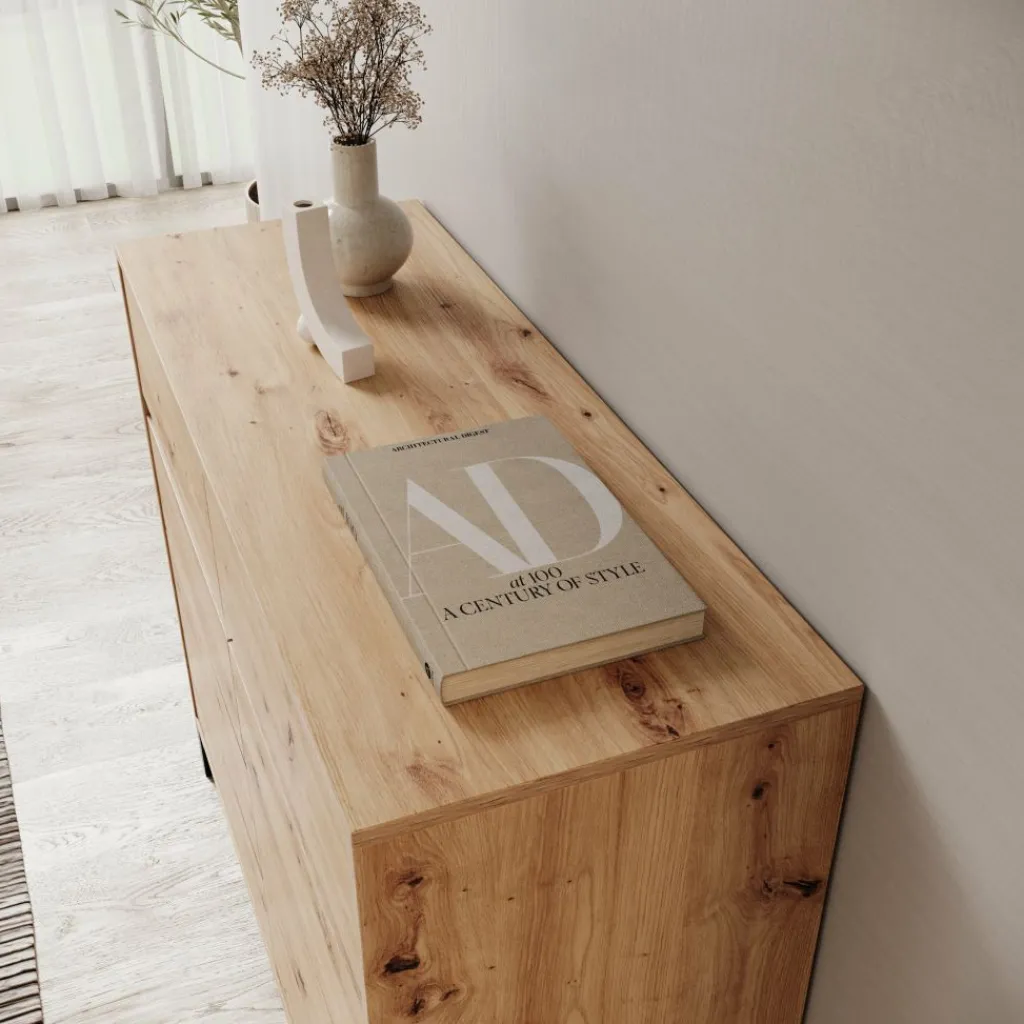 Het bovenblad biedt ruimte voor decoratie of praktische spullen en is goed bereikbaar door de prettige hoogte. Door het eikenpatroon in combinatie met de zwarte poten laat het dressoir zich makkelijk combineren met uiteenlopende interieurs.