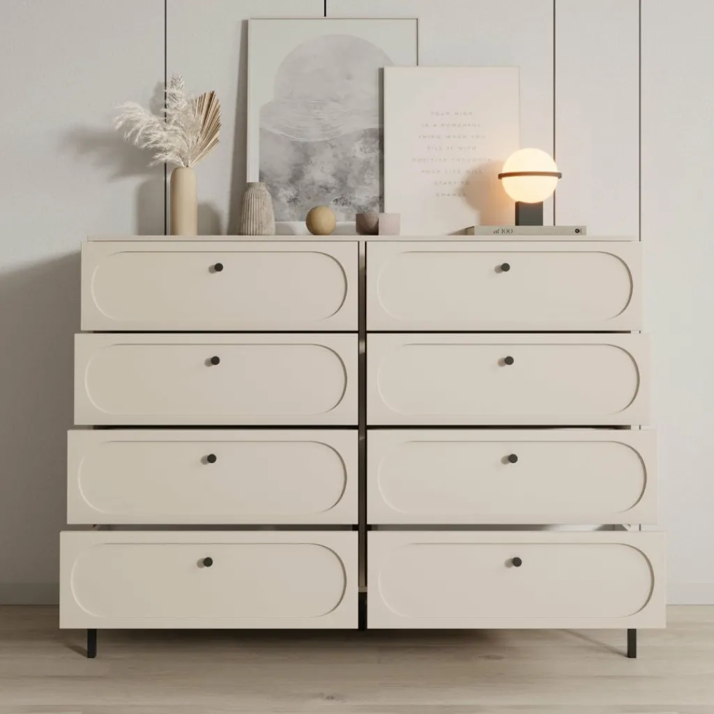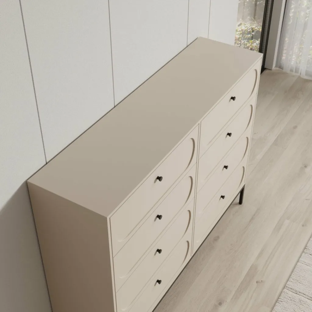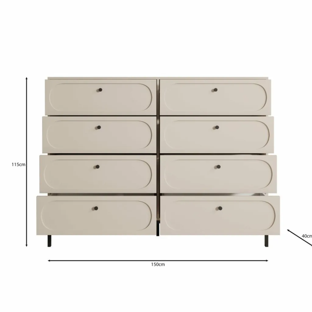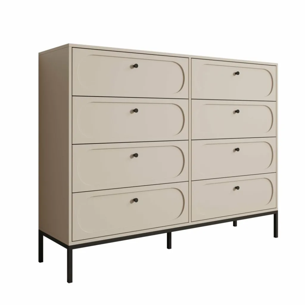 De Montserrat-ladekast met 8 lades biedt veel opbergruimte in een strak en evenwichtig ontwerp. Het model is uitgevoerd in een zachte beige tint en staat op een slank zwart metalen onderstel, waardoor de kast licht oogt en eenvoudig te combineren is met verschillende woonstijlen. De organische afgeronde fronten geven de kast een rustige, moderne uitstraling.