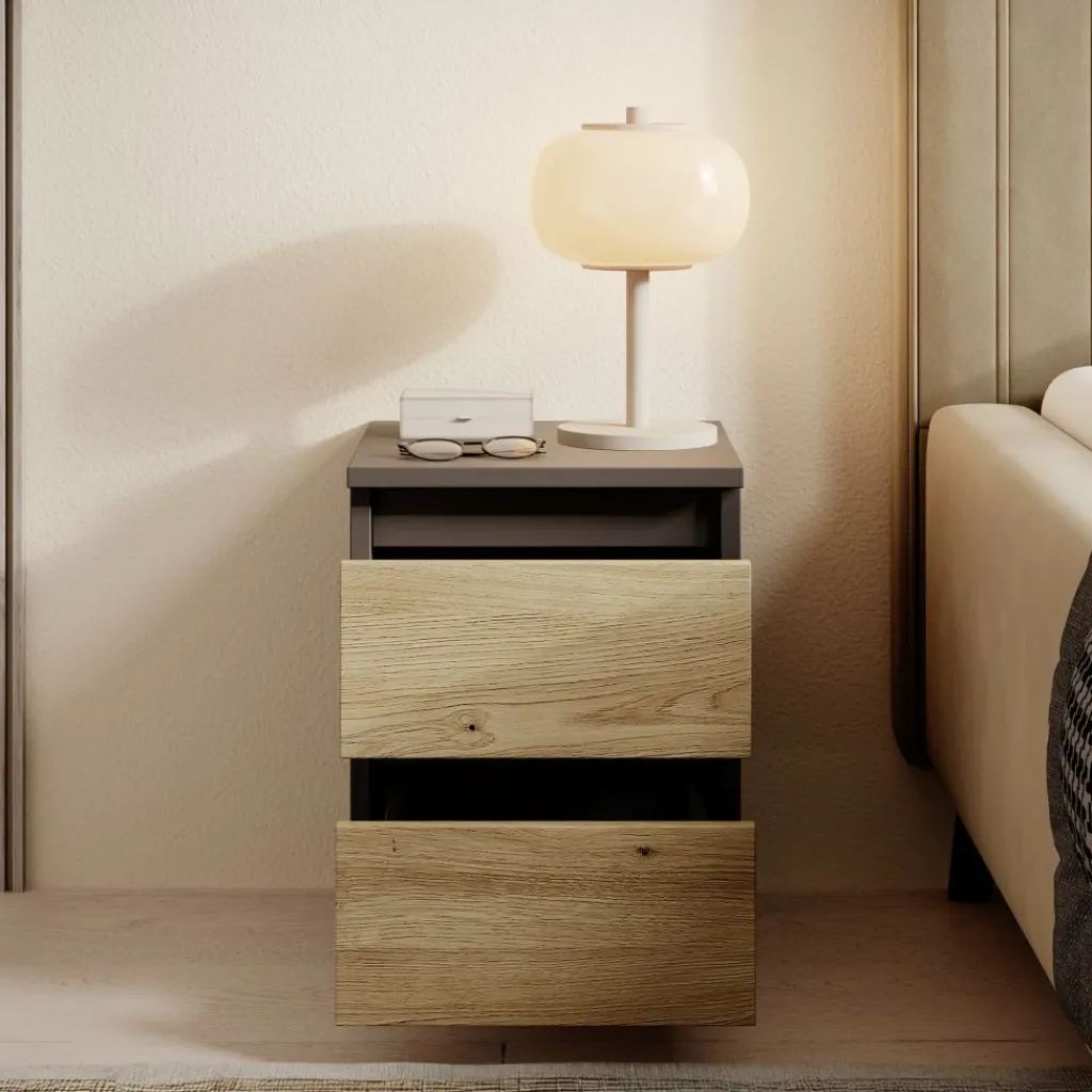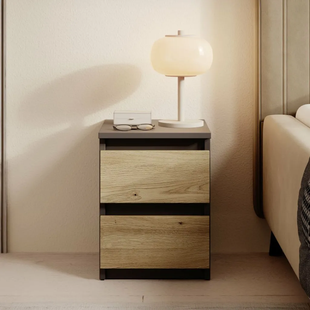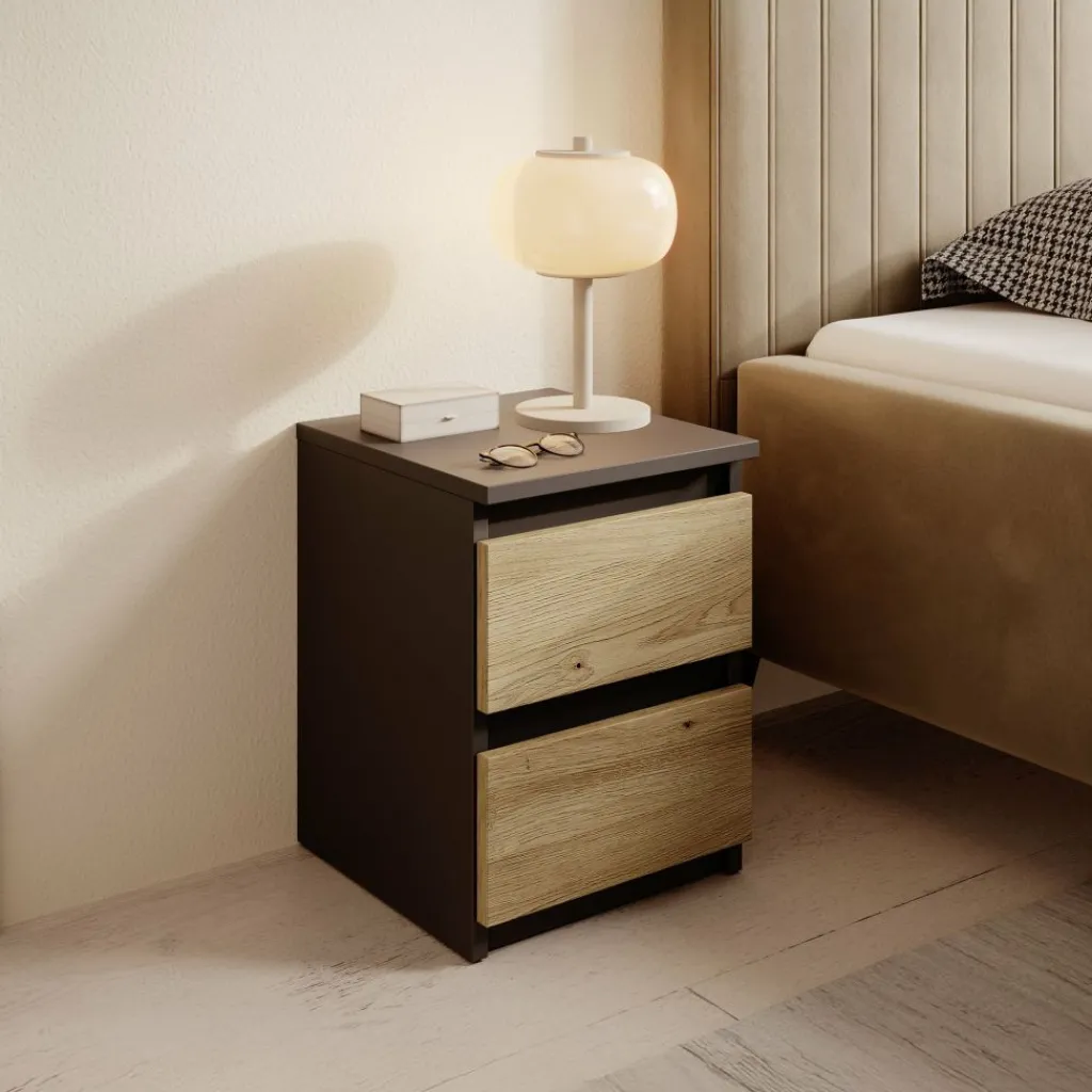 Het Masuka nachtkastje in antraciet is ontworpen als een compact en praktisch opbergmeubel voor naast het bed. Dankzij het formaat van 30 x 32 x 40 cm past het moeiteloos in kleinere ruimtes of naast een laag bedframe, terwijl de combinatie van een antraciet behuizing met houtkleurige fronten zorgt voor een warme, moderne uitstraling.