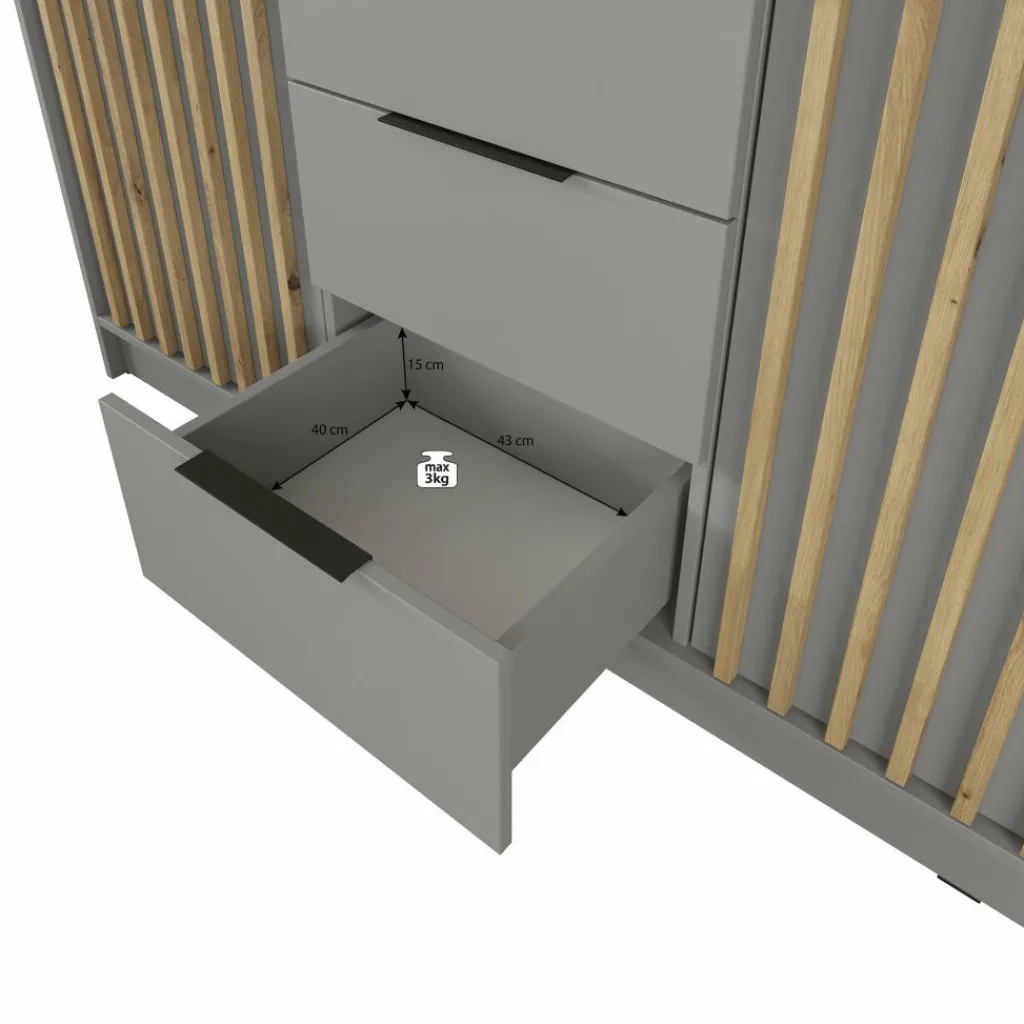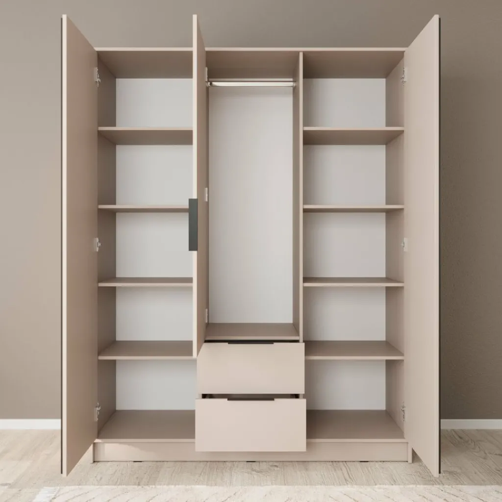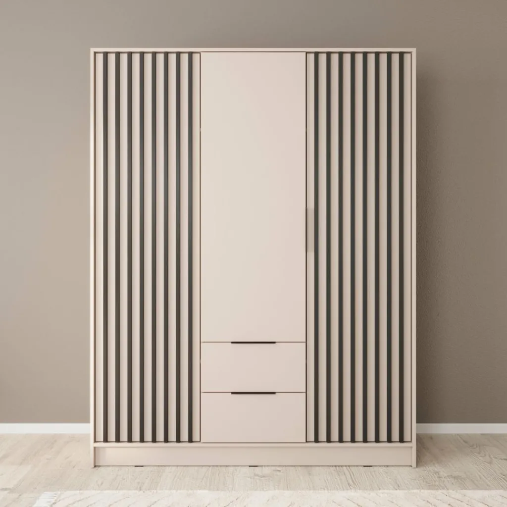 Kledingkast Nairobi is een garderobekast met ruime opbergmogelijkheden. Dit model is voorzien van drie klapdeuren. Het binnenwerk bestaat uit tien legplanken. In het midden van de kast is er een mogelijkheid om kleding op te hangen op de daarvoor bestemde kledingstang. Daaronder bevinden zich twee handige opberglades. Dit model is afgewerkt in beige kleur met zwarte latjes.