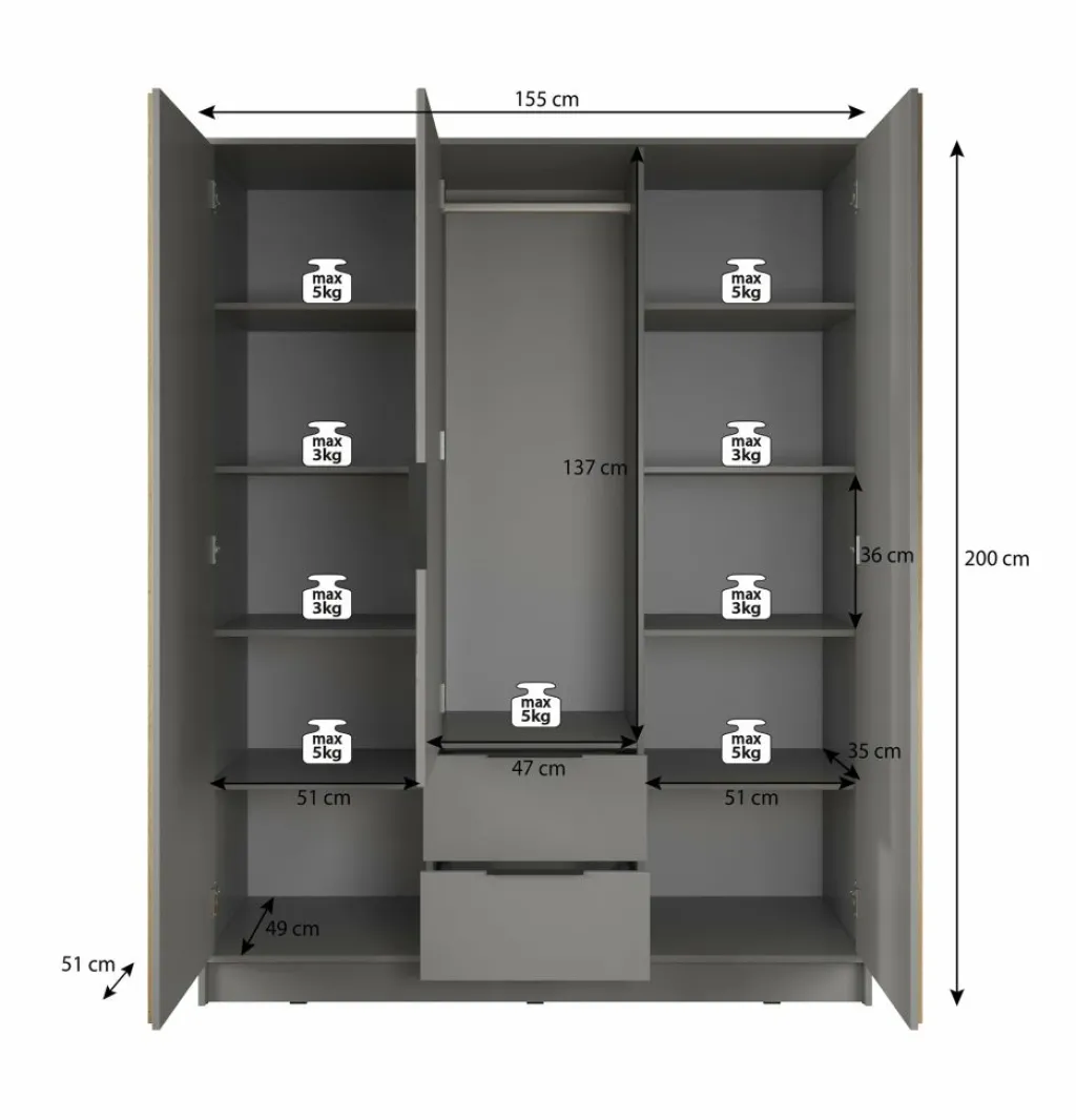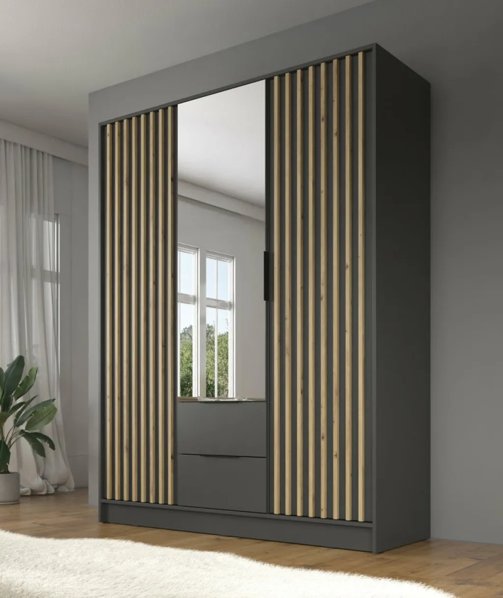 Kledingkast Nairobi is een garderobekast met ruime opbergmogelijkheden. Dit model is voorzien van drie klapdeuren. De middelste deur beschikt over een spiegel. Het binnenwerk bestaat uit tien legplanken. In het midden van de kast is er een mogelijkheid om kleding op te hangen op de daarvoor bestemde kledingstang. Daaronder bevinden zich twee handige opberglades. Dit model is afgewerkt in antraciet kleur met eiken kleurige details.