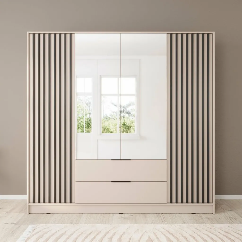 Kledingkast Nairobi is een garderobekast met ruime opbergmogelijkheden. Dit model is voorzien van vier klapdeuren. De middelste twee deuren beschikken over een spiegel. Het binnenwerk bestaat uit tien legplanken. In het midden van de kast is er een mogelijkheid om kleding op te hangen op de daarvoor bestemde kledingstang. Daaronder bevinden zich twee handige opberglades. Dit model is afgewerkt in beige kleur met zwarte latjes.