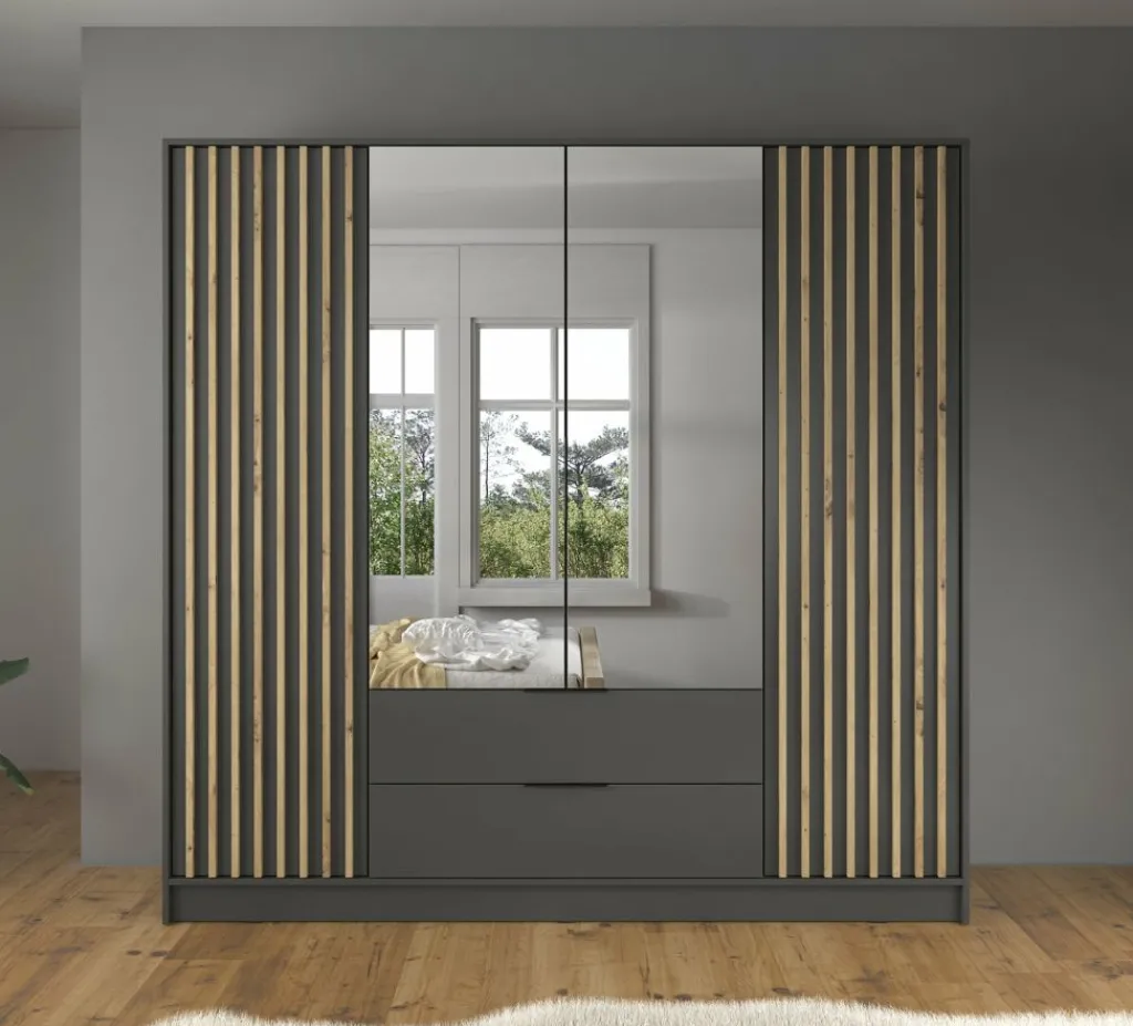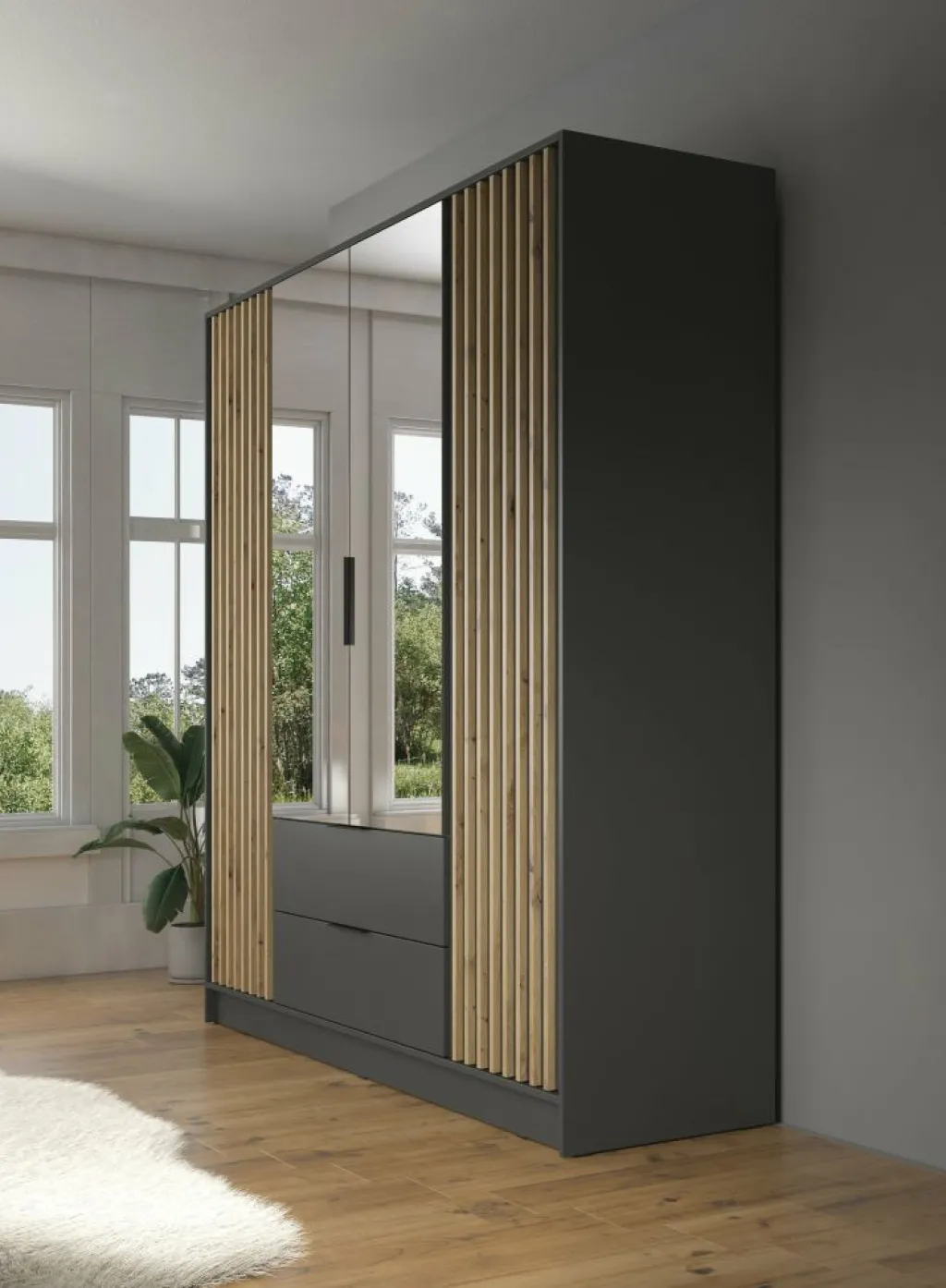 Kledingkast Nairobi is een garderobekast met ruime opbergmogelijkheden. Dit model is voorzien van vier klapdeuren. De middelste twee deuren beschikken over een spiegel. Het binnenwerk bestaat uit tien legplanken. In het midden van de kast is er een mogelijkheid om kleding op te hangen op de daarvoor bestemde kledingstang. Daaronder bevinden zich twee handige opberglades. Dit model is afgewerkt in antraciet kleur met eiken details.