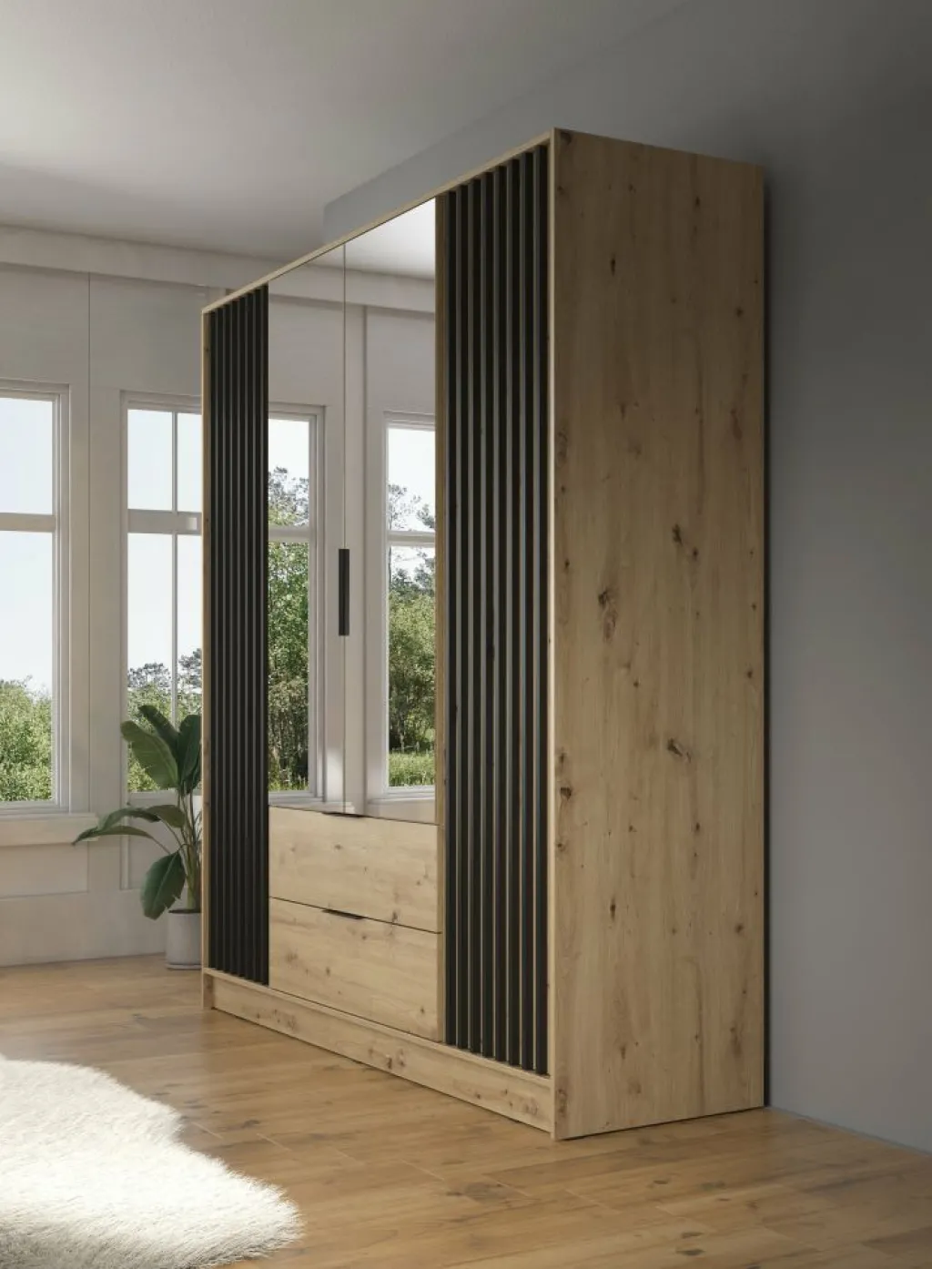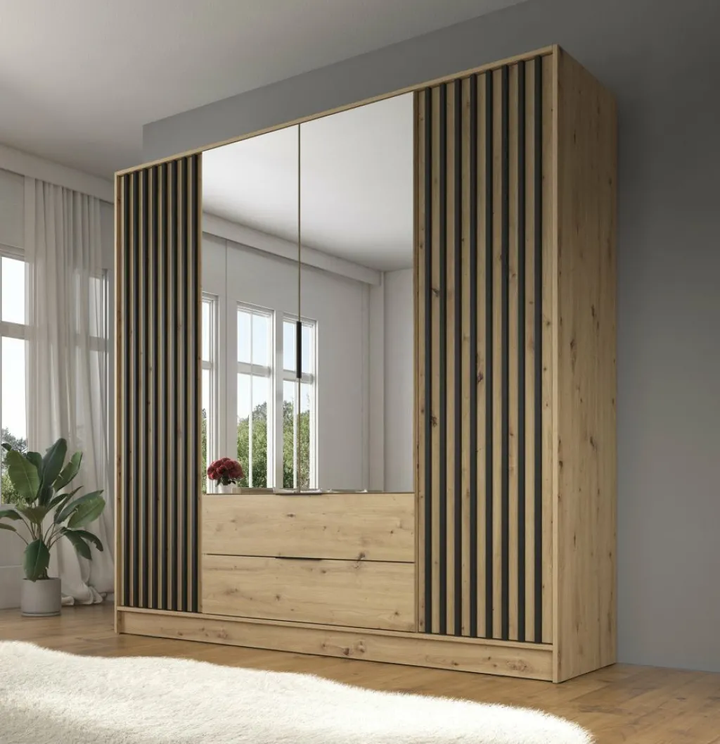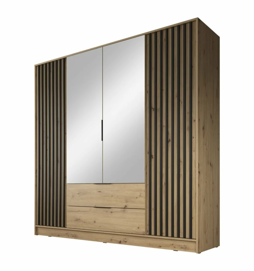 Kledingkast Nairobi is een garderobekast met ruime opbergmogelijkheden. Dit model is voorzien van vier klapdeuren. De middelste twee deuren beschikken over een spiegel. Het binnenwerk bestaat uit tien legplanken. In het midden van de kast is er een mogelijkheid om kleding op te hangen op de daarvoor bestemde kledingstang. Daaronder bevinden zich twee handige opberglades. Dit model is afgewerkt in eiken kleur met mat zwarte details.