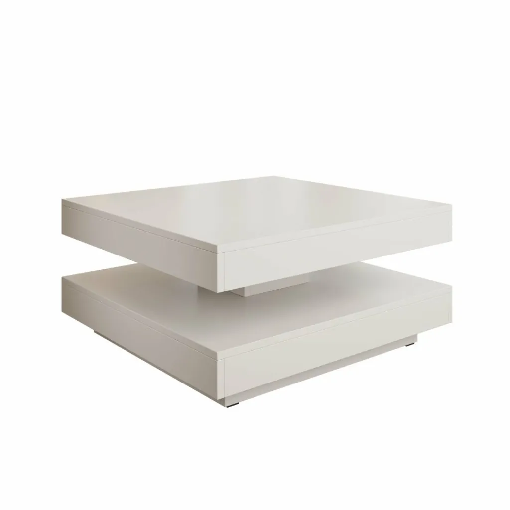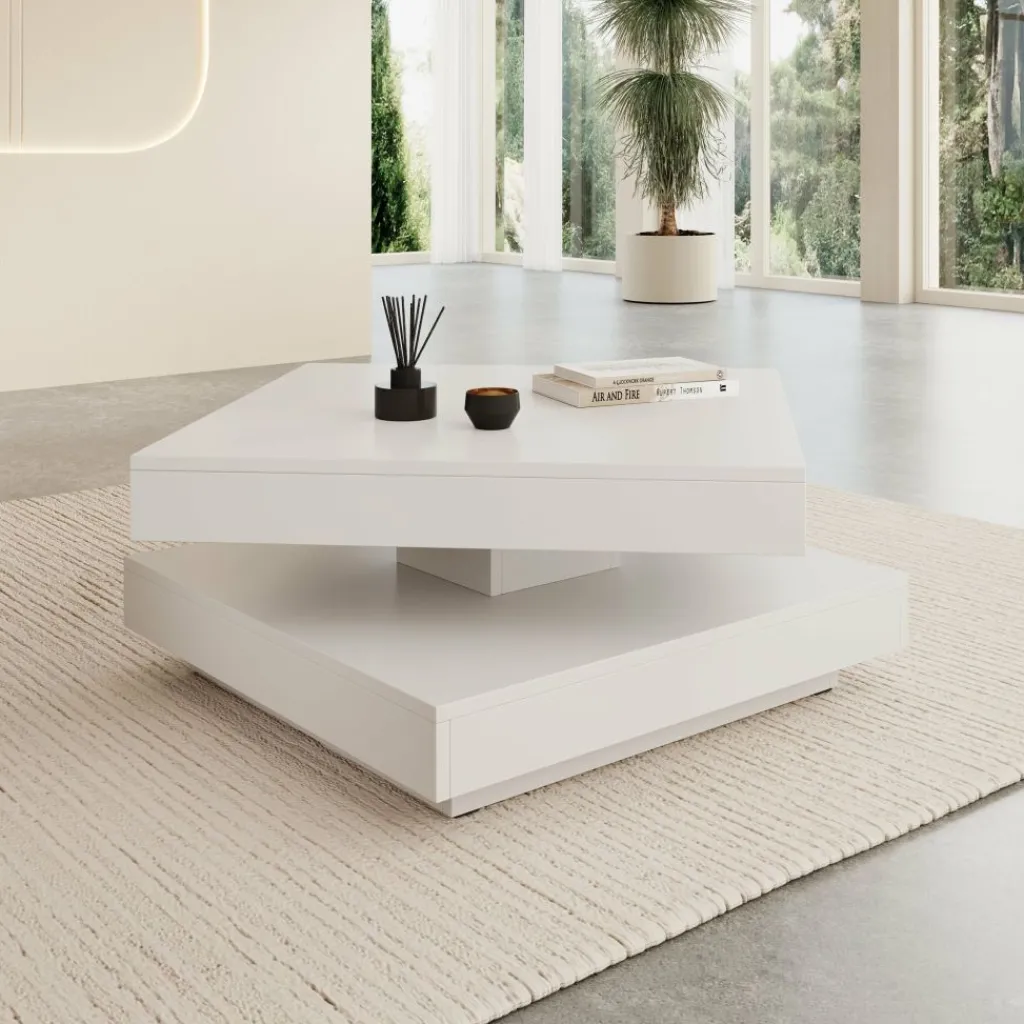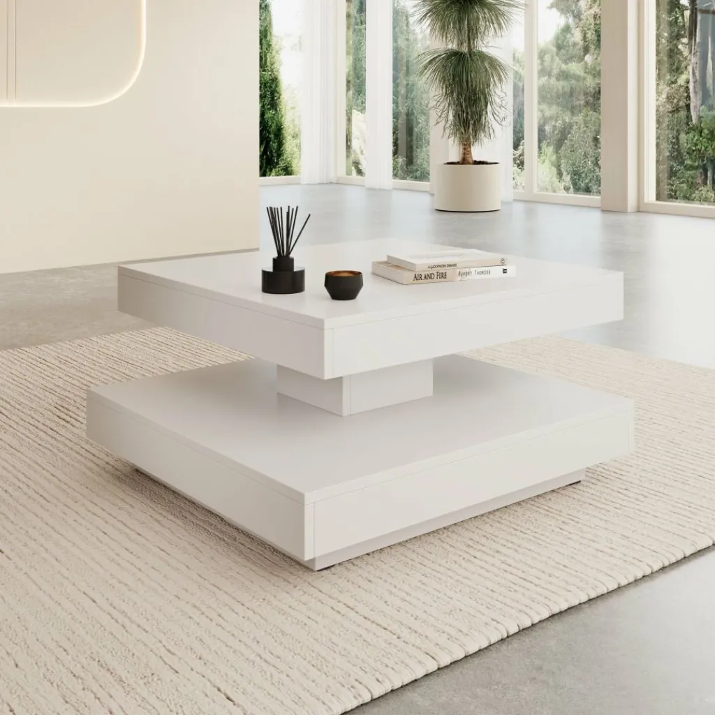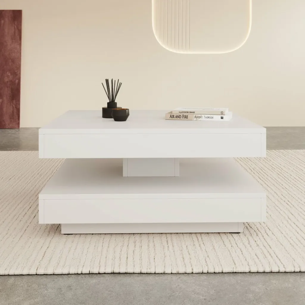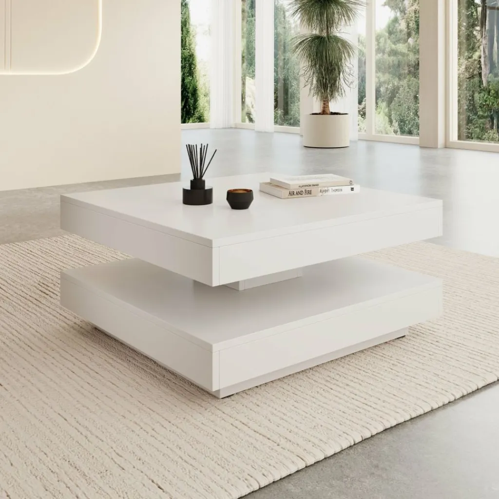 De tafel beschikt over twee functionele bladen. Het onderste blad vormt een stabiele basis en biedt extra ruimte voor het plaatsen van decoratie of andere items. Het bovenste blad is verstelbaar en kan dankzij een speciaal mechanisme 360 graden draaien. Hierdoor kun je het blad eenvoudig verplaatsen en aanpassen aan de indeling van de zithoek. Het draaibare blad zorgt niet alleen voor extra gebruiksgemak, maar geeft de tafel ook een speels en opvallend element.