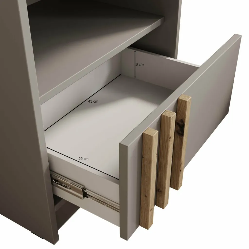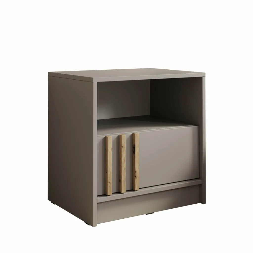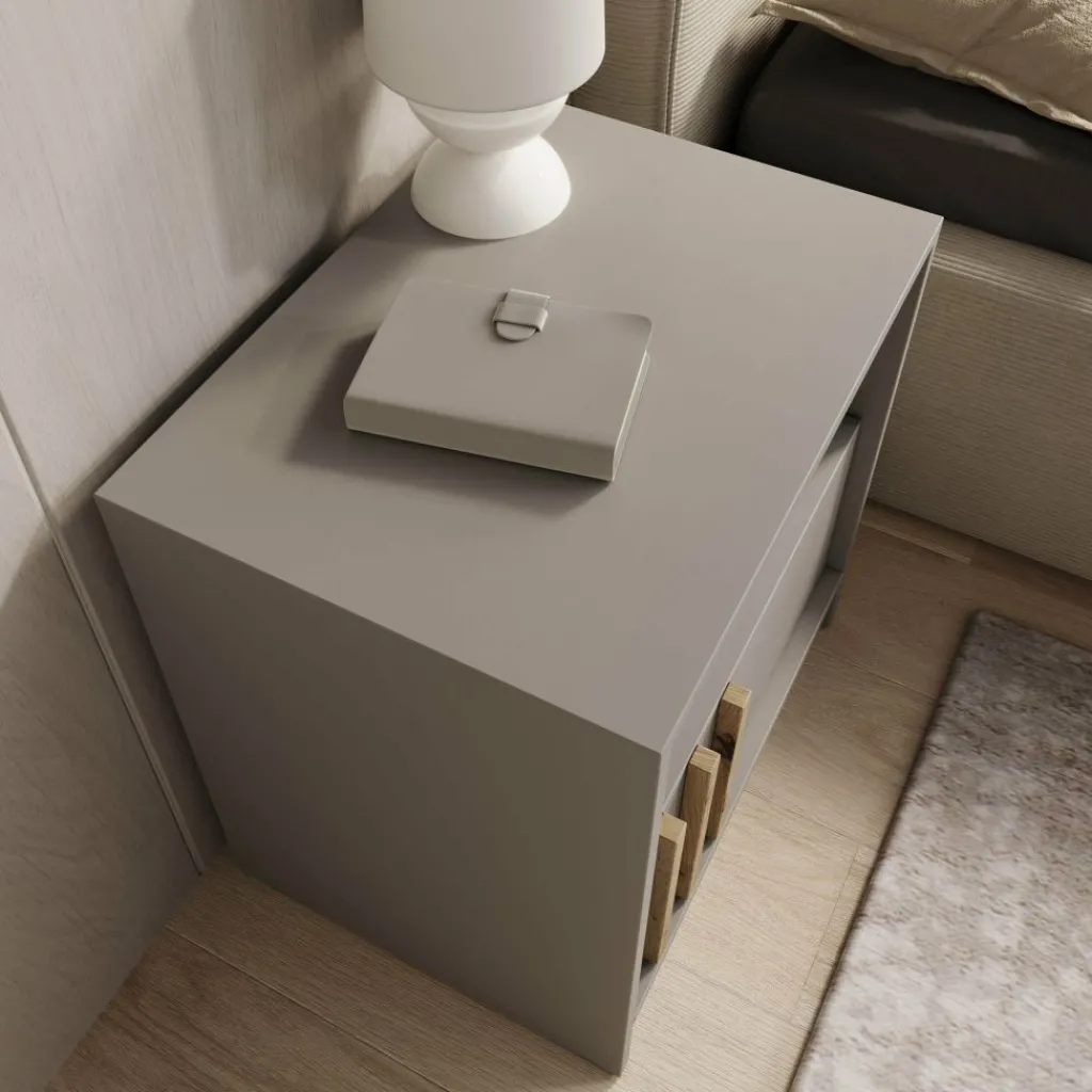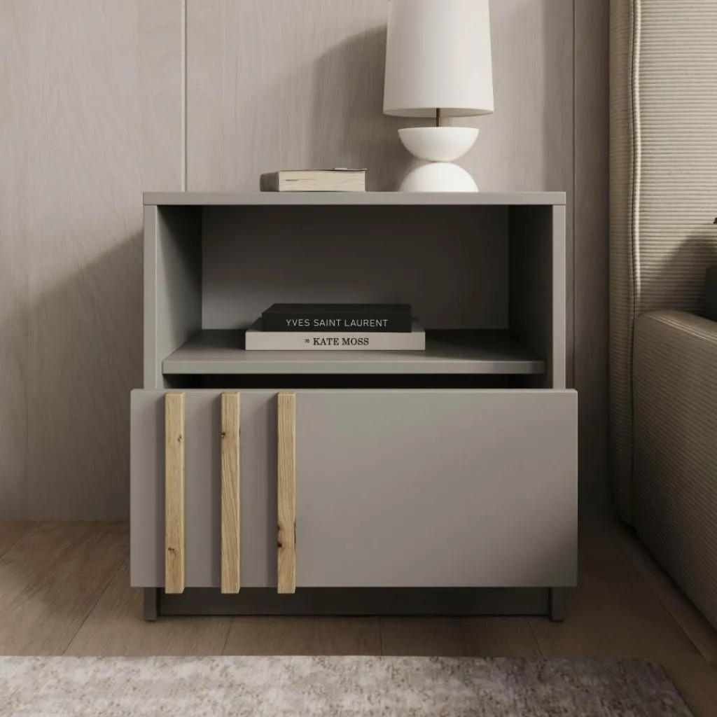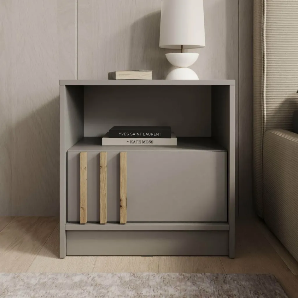 Het Nauru nachtkastje in grijs is een moderne en stijlvolle toevoeging aan de slaapkamer. De strakke grijze afwerking geeft het kastje een rustige en eigentijdse uitstraling, terwijl de subtiele eiken accenten op de deur zorgen voor een warm contrast. Het open vak is ideaal om boeken of accessoires binnen handbereik te houden, en achter de deur kun je kleinere spullen netjes opbergen. Dankzij het compacte formaat past dit nachtkastje moeiteloos naast elk bed en combineert het praktische opbergruimte met een strak en modern design.