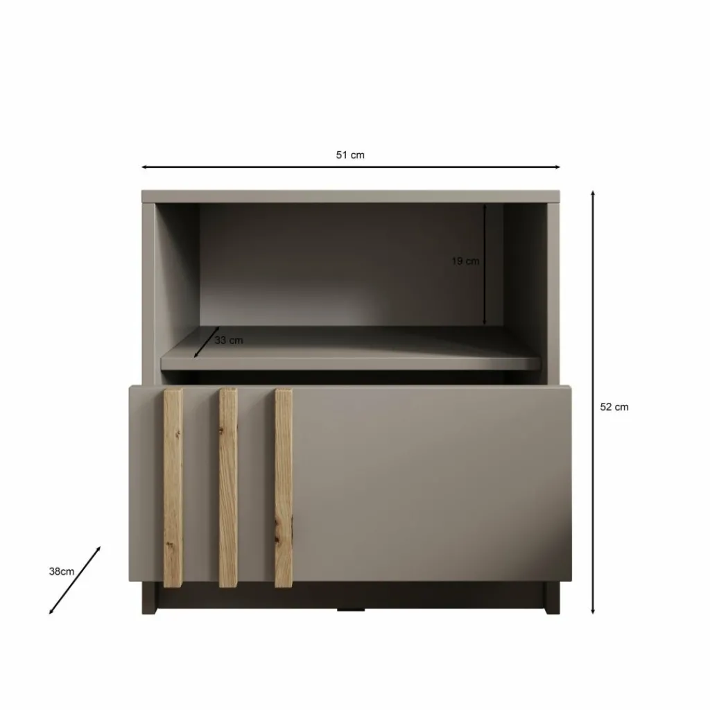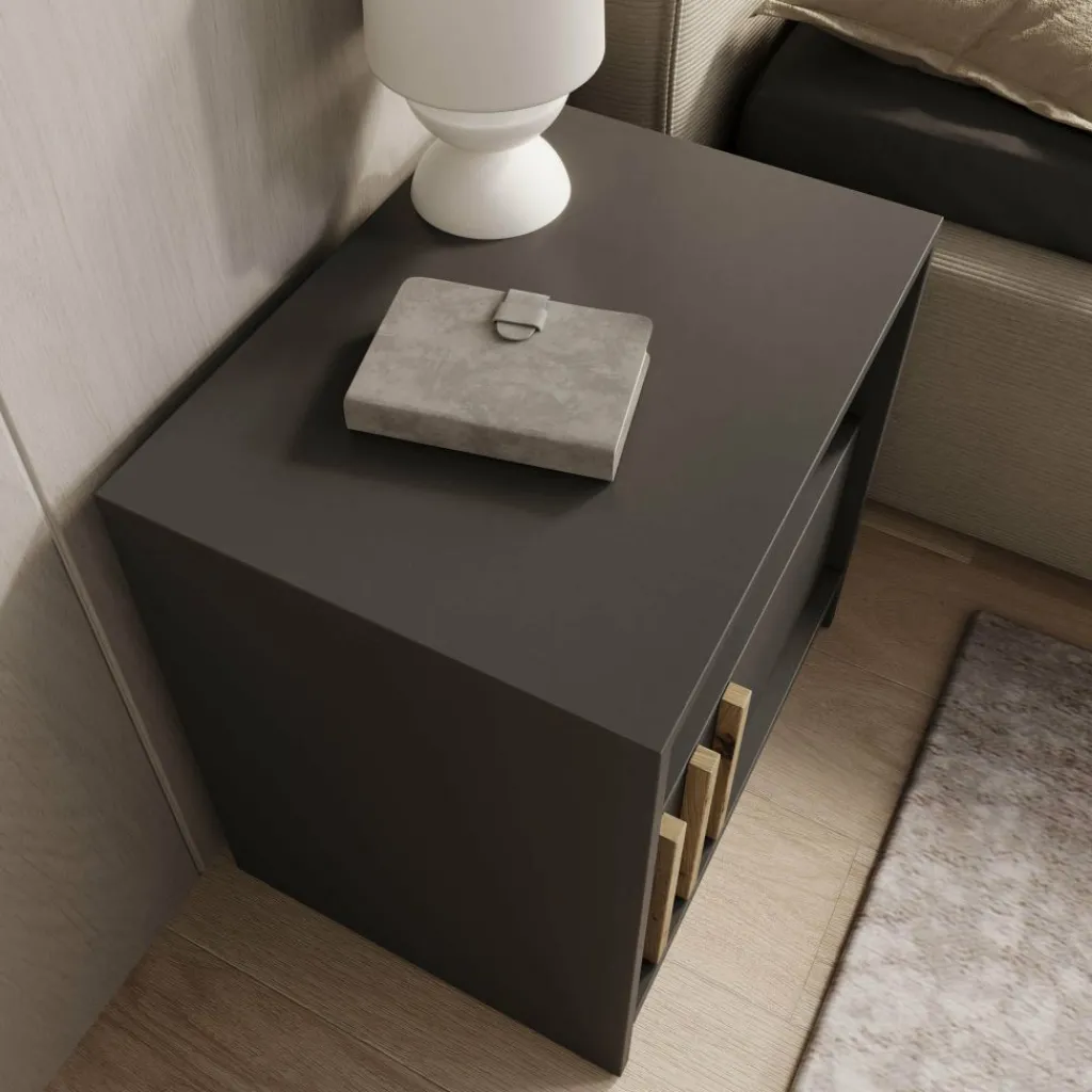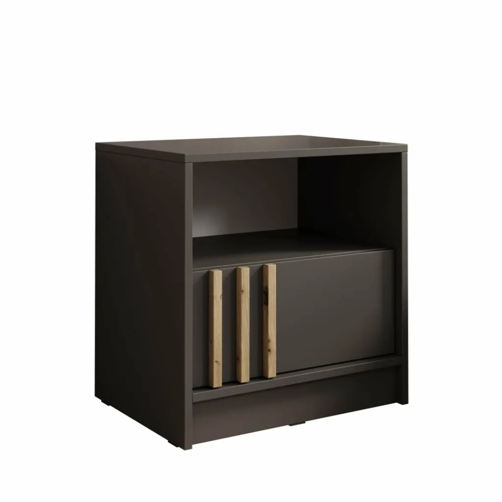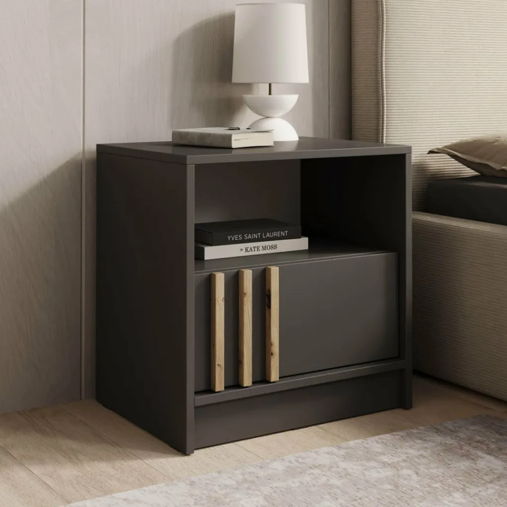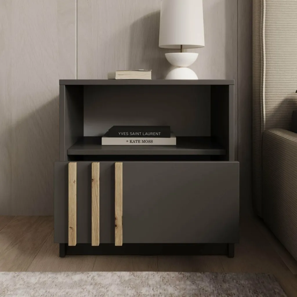 Het Nauru nachtkastje in antraciet combineert praktisch gebruiksgemak met een stijlvolle, moderne uitstraling. De donkere kleur geeft het meubel een strakke en elegante look, terwijl de verticale handgrepen in houtkleur zorgen voor een warm en speels contrast. Het open vak biedt ruimte voor boeken, accessoires of een nachtlampje, en achter de deur kun je eenvoudig al je kleinere spullen opbergen. Dankzij het compacte formaat is dit kastje ideaal naast ieder bed en past het moeiteloos in diverse slaapkamerstijlen, van modern tot industrieel.
