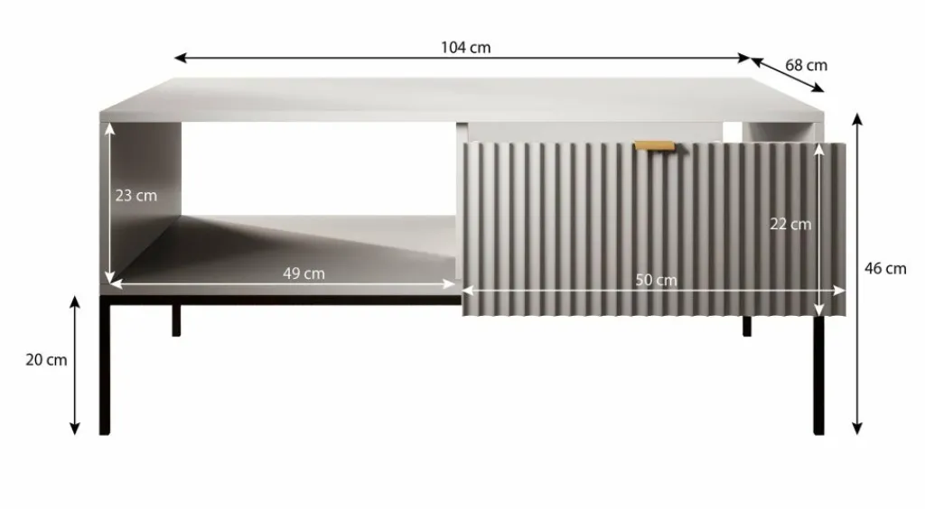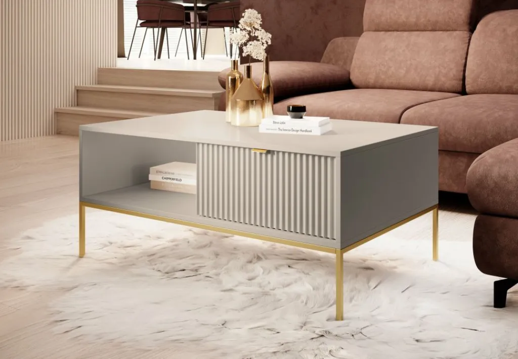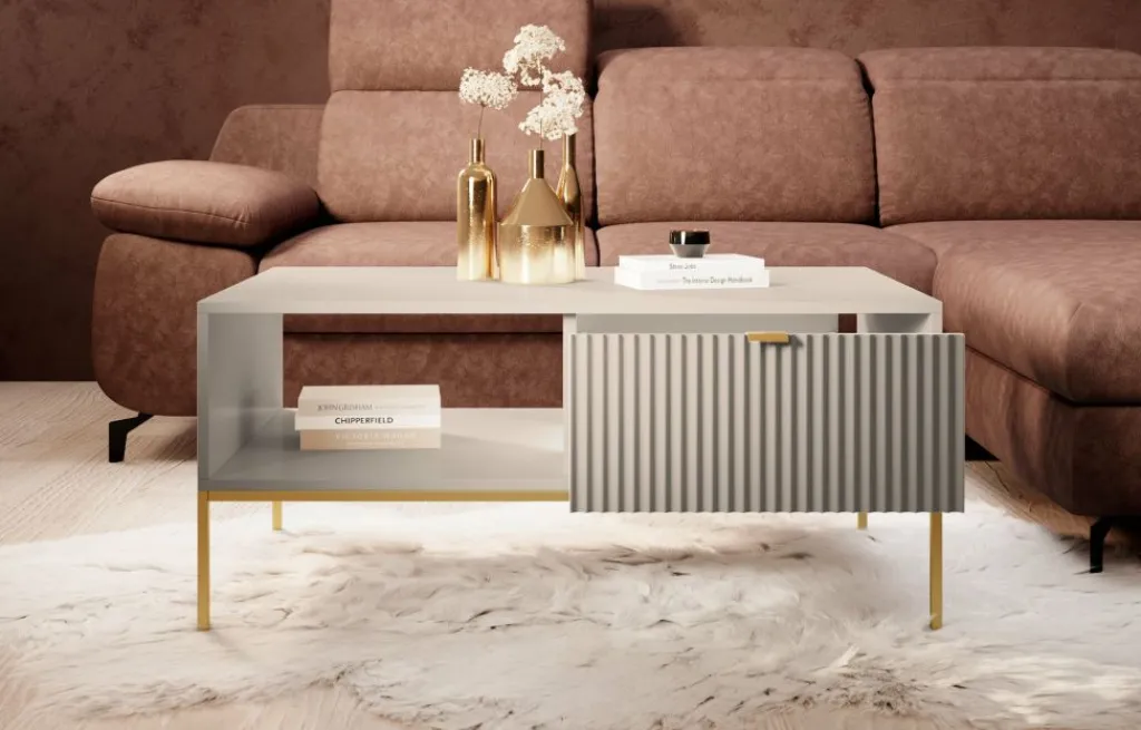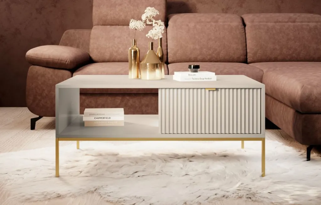 Salontafel Navil is een salontafel met een hotel-chique uitstraling. De tafel is uitgevoerd in de kleur beige met goudkleurige, metalen poten.