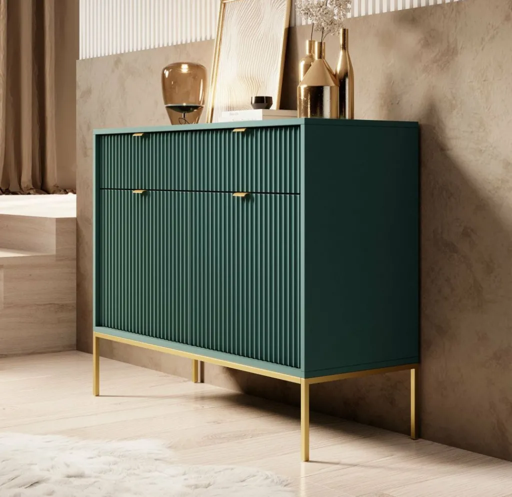 Dressoir Navil is een moderne designkast, uitgevoerd in een groene kleur. De kast beschikt over twee openslaande deuren met daarachter 4 opbergvakken. De deuren openen door middel van goudkleurige handgrepen. Daarboven bevinden zich twee handige opberglades. De kast staat op goudkleurige hoge pootjes. Door het strakke en eenvoudige design is dit meubel vooral passend binnen een industriële en hotelchique woonstijl.