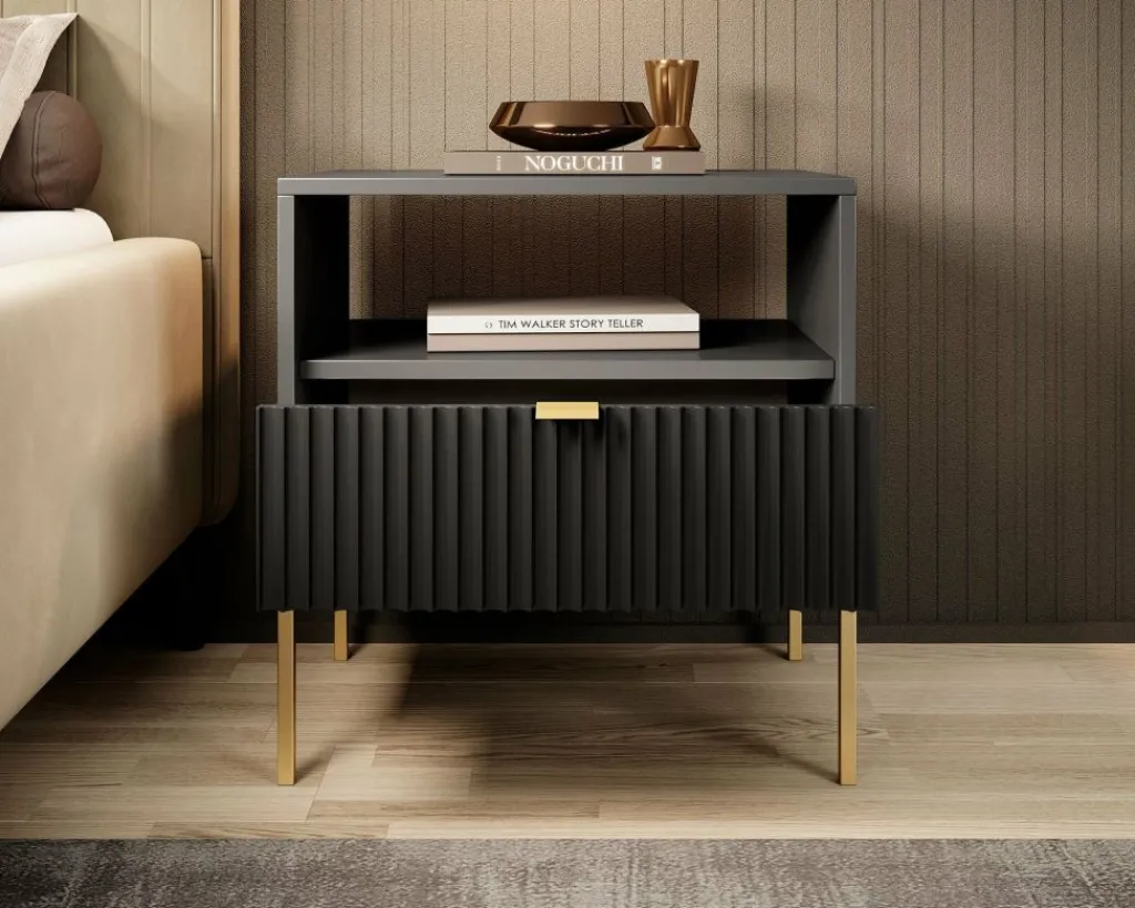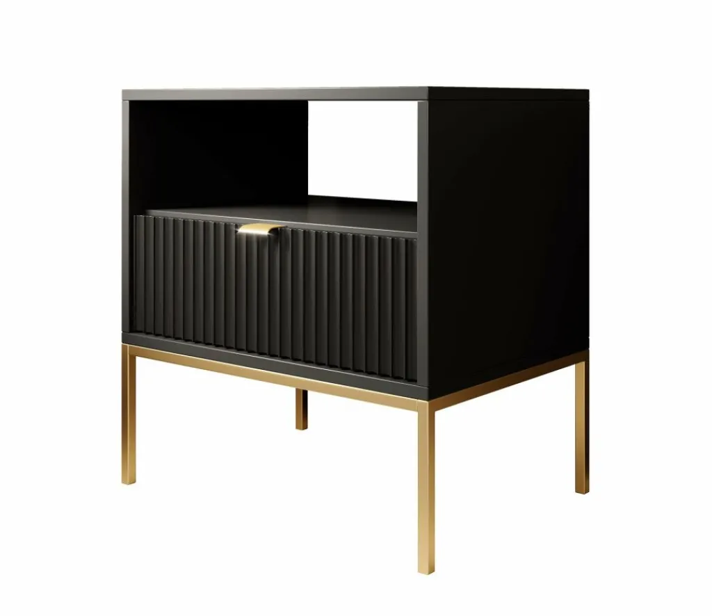 Nachtkastje Navil is een praktische opbergkast met voldoende opbergruimte. Onderin bevindt zich een handige opberglade, deze is te openen met een goudkleurige handgreep. Voor extra opbergruimte is er een open schap aanwezig bovenin het nachtkastje. Vanwege zijn design is het nachtkastje passend in elke soort slaapkamer.