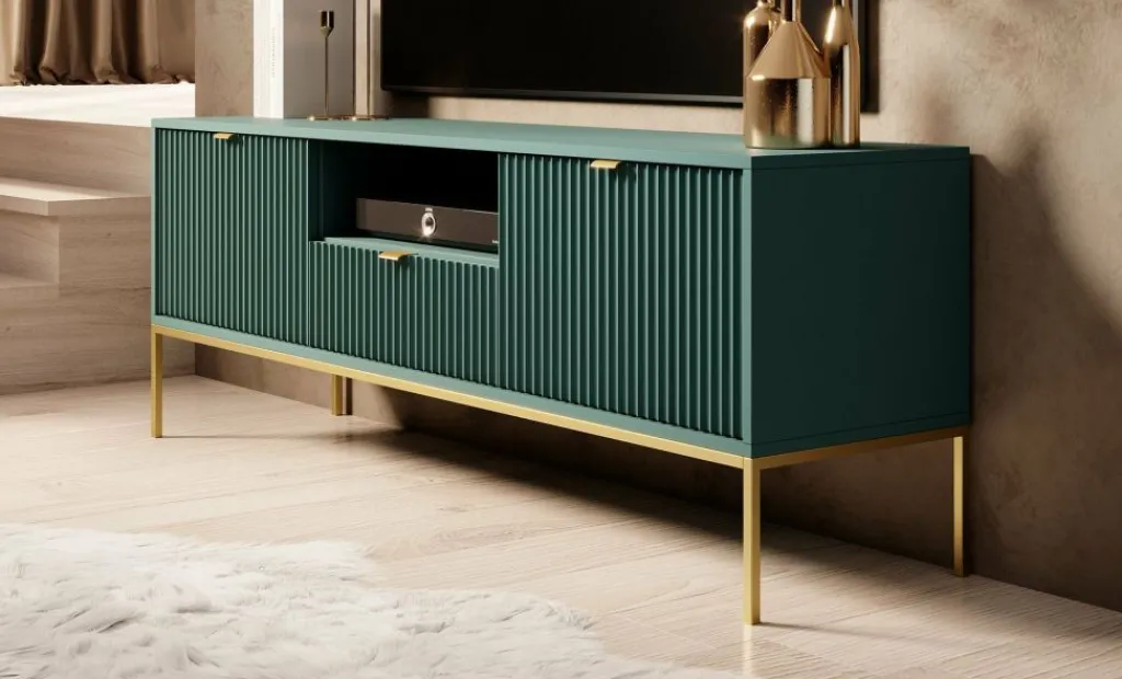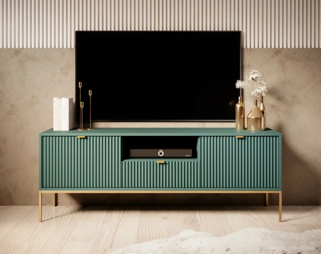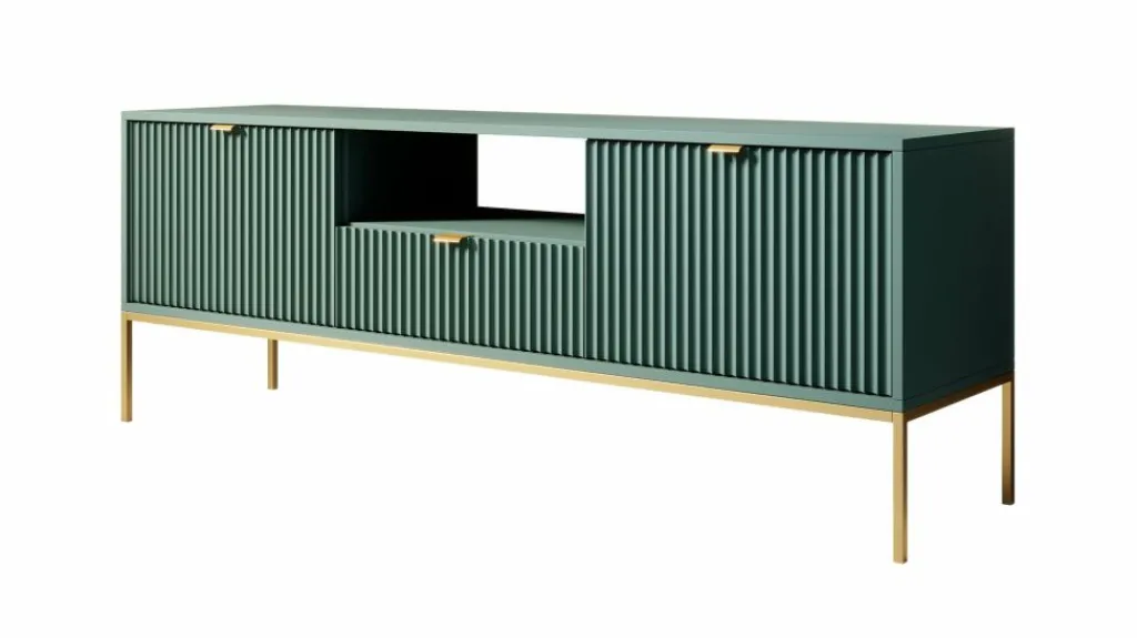 TV-meubel Navil is een design meubel met voldoende opbergmogelijkheden. Deze kast heeft een breedte van 154 centimeter en is gemaakt van spaanplaat met een melamine coating in groene kleur. Dankzij het kleurgebruik en design is dit meubel geschikt voor zowel industriële als hotelchique interieurs. De kast beschikt over twee klepdeuren welke te openen zijn via goudkleurige handgrepen. In het middel bevindt zich een open schap met daaronder een lade. Ook deze is te openen door een goudkleurige handgreep. Aan de achterzijde bevindt zich een gat om eventuele bedrading weg te werken.