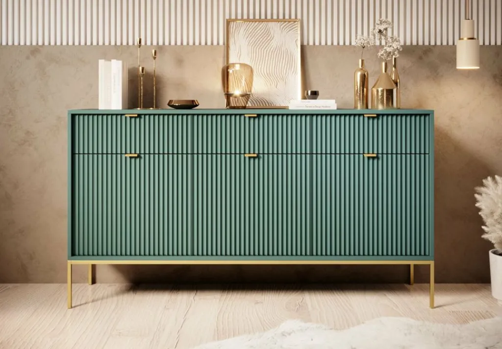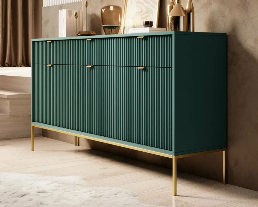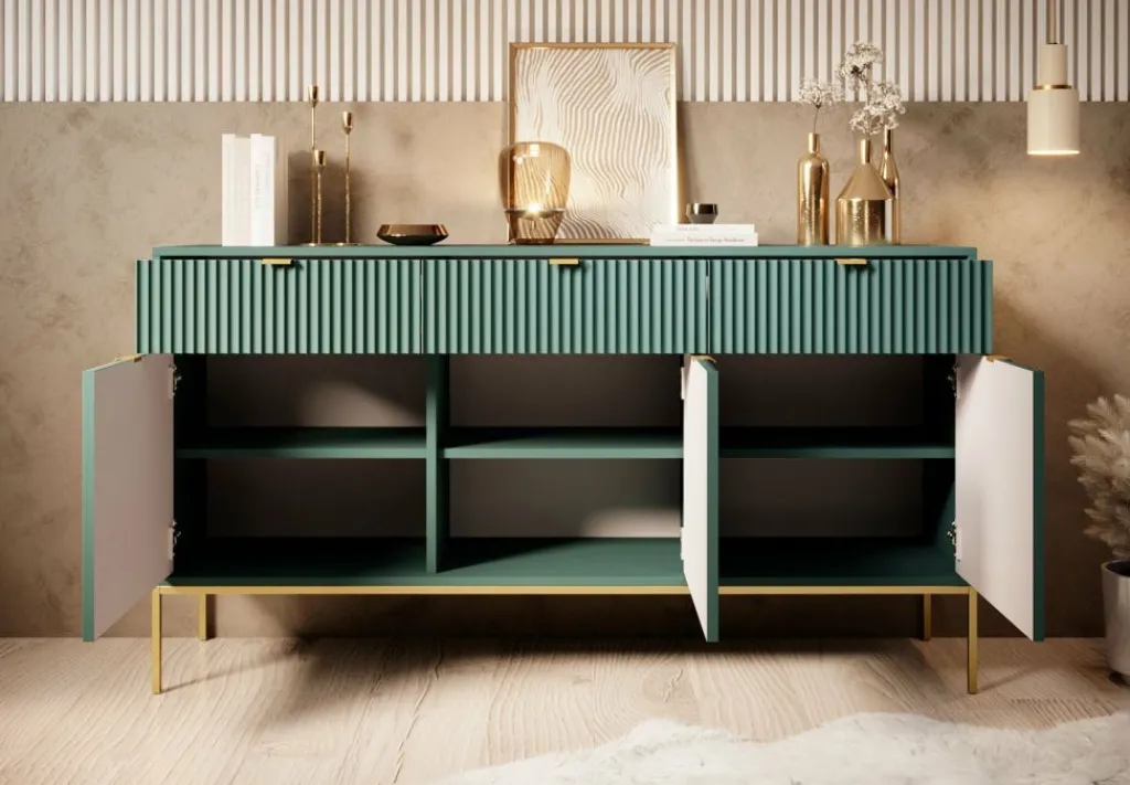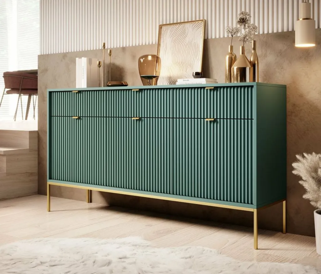 Dressoir Navil is een moderne designkast, uitgevoerd in een groene kleur. De kast beschikt over drie openslaande deuren met daarachter 6 opbergvakken. De deuren openen door middel van goudkleurige handgrepen. Daarboven bevinden zich drie handige opberglades. De kast staat op goudkleurige hoge pootjes. Door het strakke en eenvoudige design is dit meubel vooral passend binnen een industriële en hotelchique woonstijl.