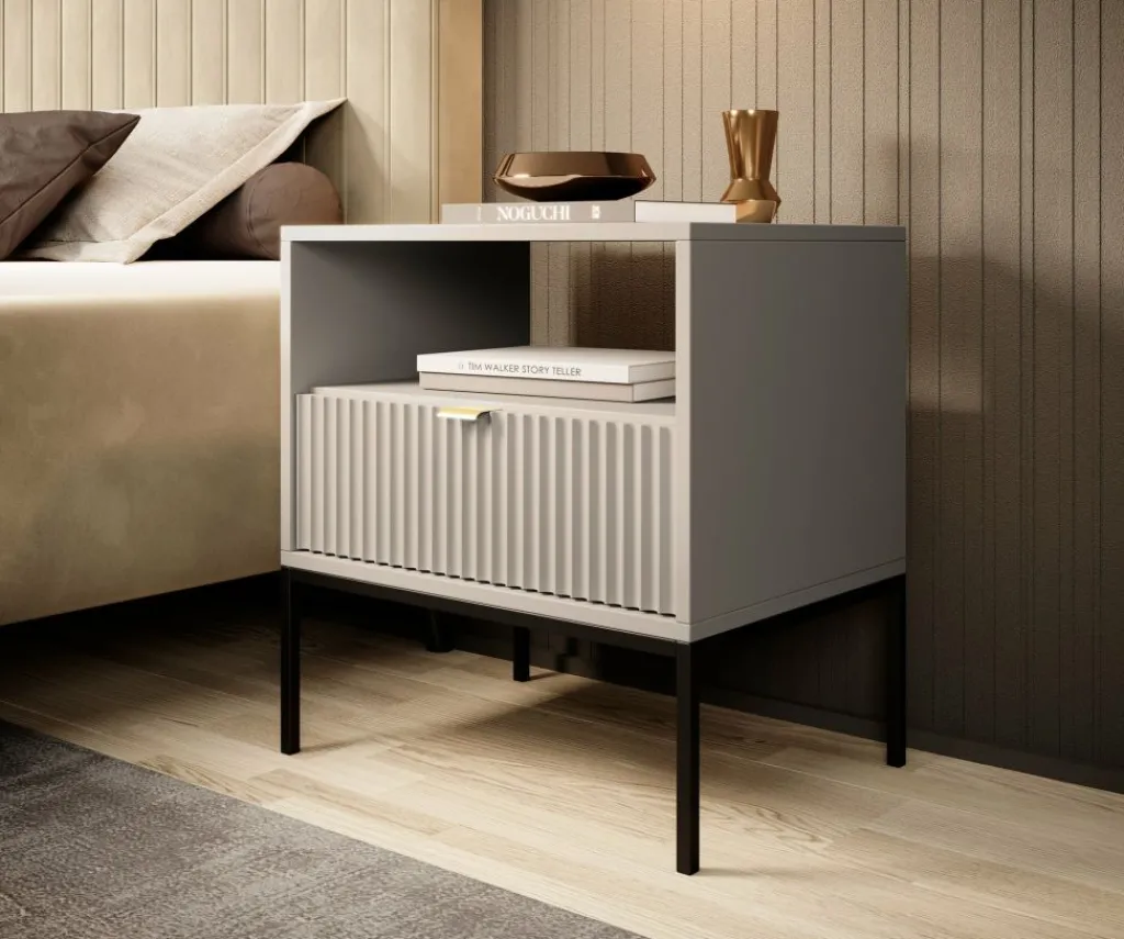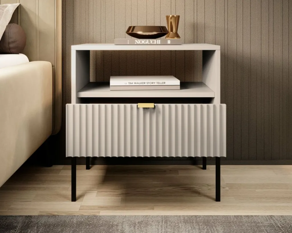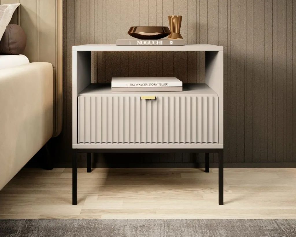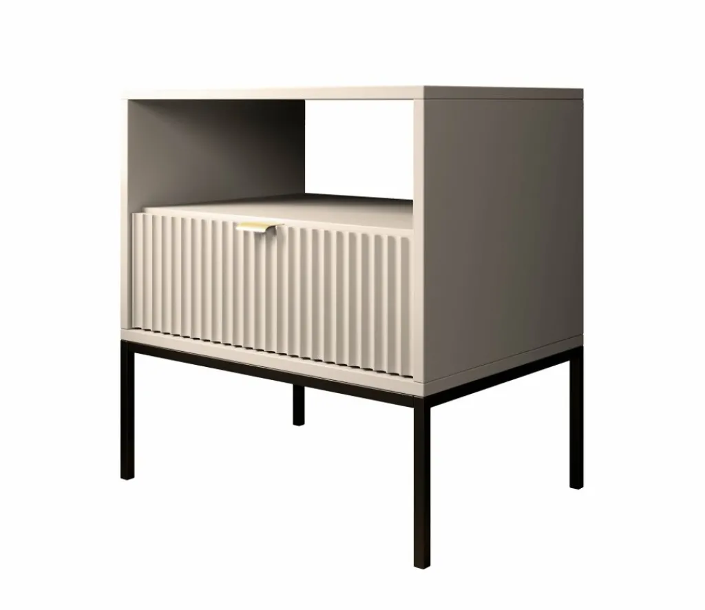 Nachtkastje Navil is een praktische opbergkast met voldoende opbergruimte. Onderin bevindt zich een handige opberglade, deze is te openen met een goudkleurige handgreep. Voor extra opbergruimte is er een open vak aanwezig bovenin het nachtkastje. Het meubel staat op zwarte poten. Deze poten zijn gemaakt van metaal.