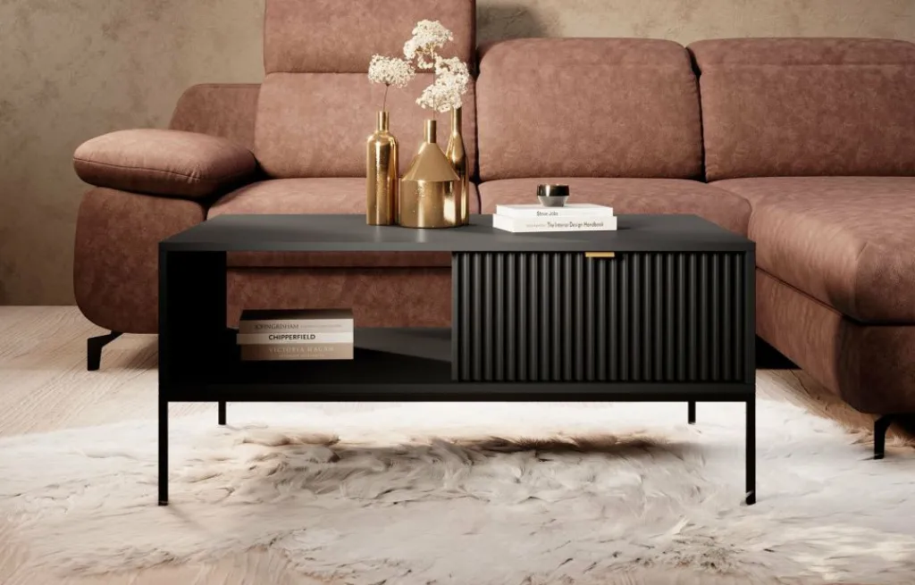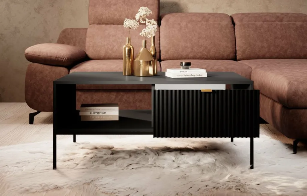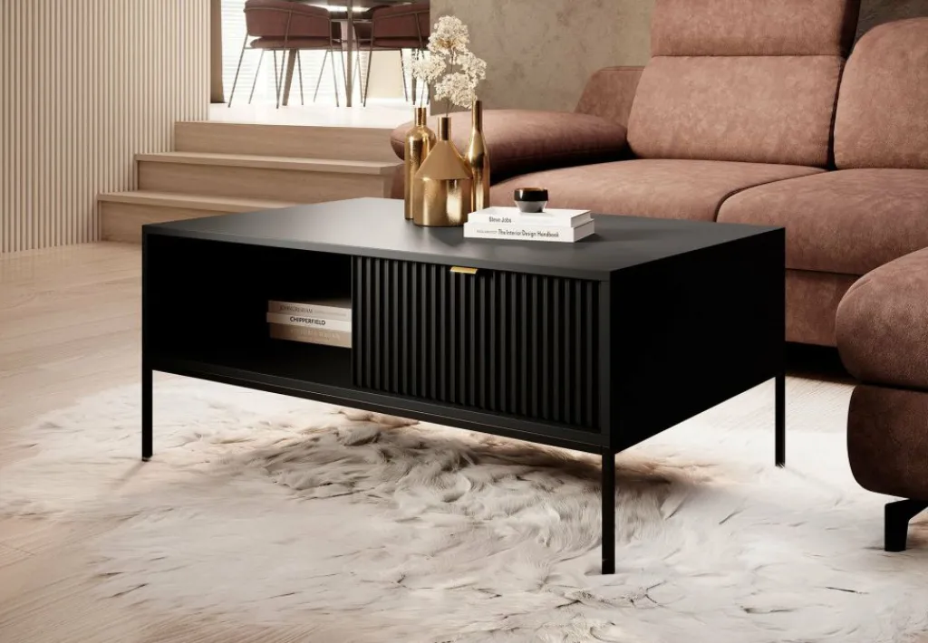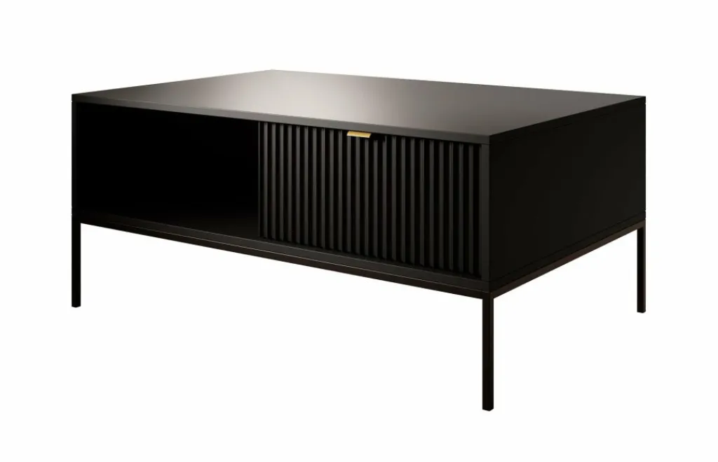 Salontafel Navil is een salontafel met een hotel-chique uitstraling. De tafel staat op vier zwarte poten en is uitgevoerd in de kleur mat zwart. Onder het blad bevinden zich 2 handige opberglades en open schap. De lades zijn te openen met een goudkleurige handgreep.