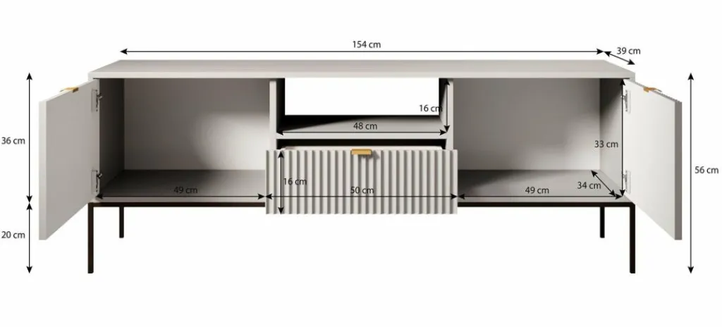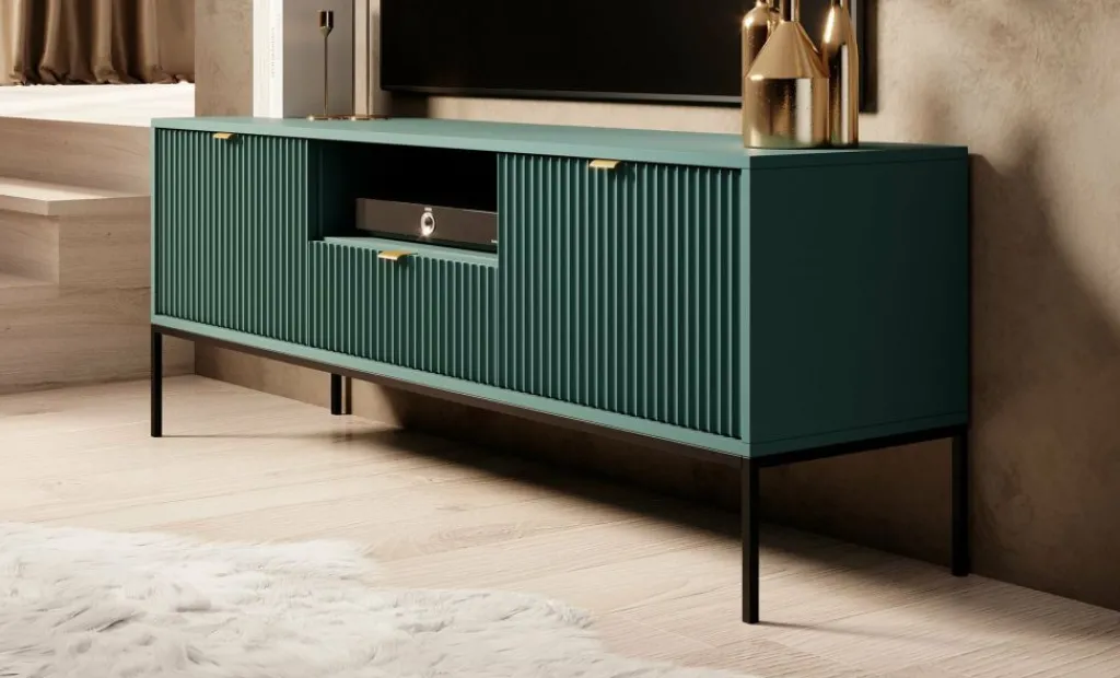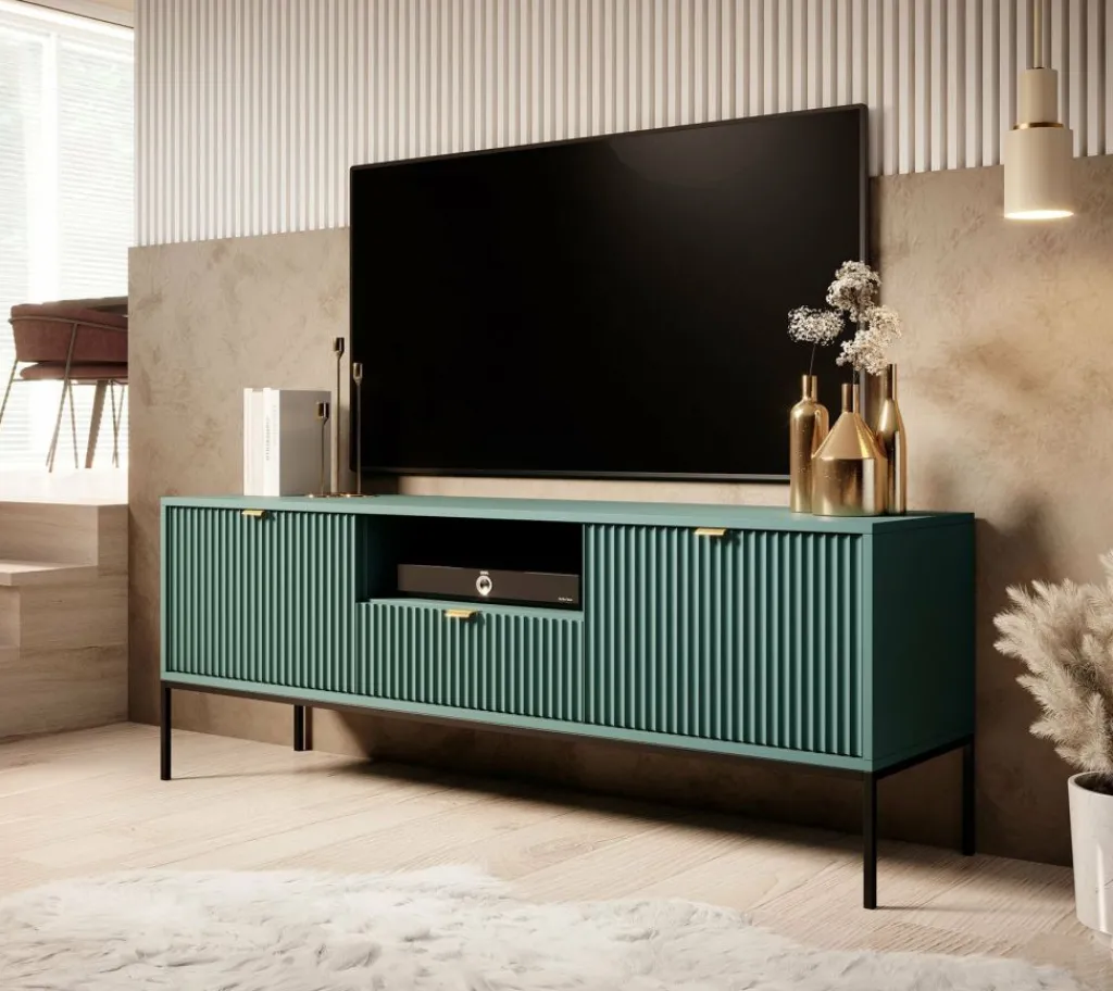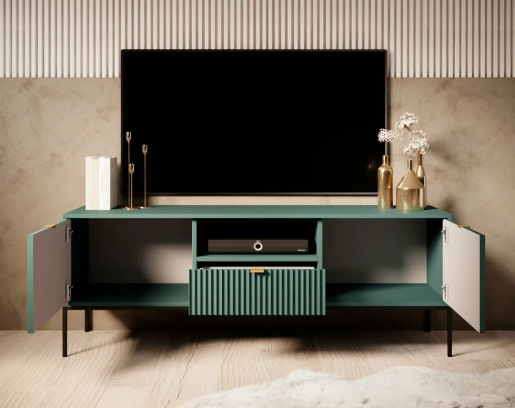 TV-meubel Navil is een design meubel met voldoende opbergmogelijkheden. Deze kast heeft een breedte van 154 centimeter en is gemaakt van spaanplaat met een melamine coating in groene kleur. Dankzij het kleurgebruik en design is dit meubel geschikt voor zowel industriële als hotelchique interieurs. De kast beschikt over twee kleppen welke te openen zijn via goudkleurige handgrepen. In het middel bevindt zich een open vak met daaronder een lade. Ook deze is te openen door een goudkleurige handgreep. Aan de achterzijde bevindt zich een gat om eventuele bedrading weg te werken.