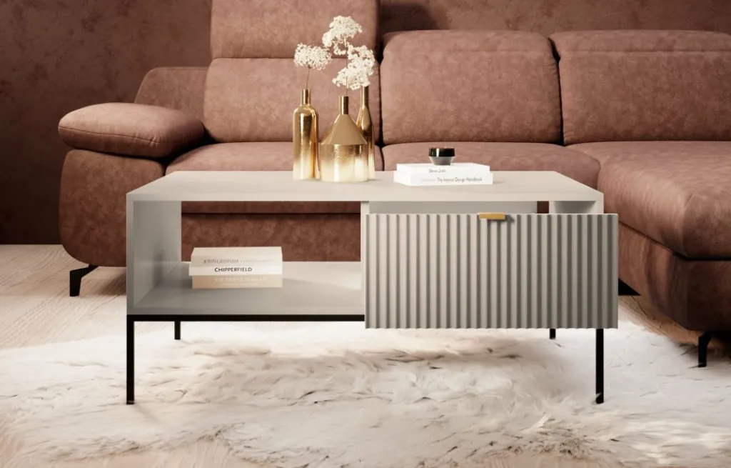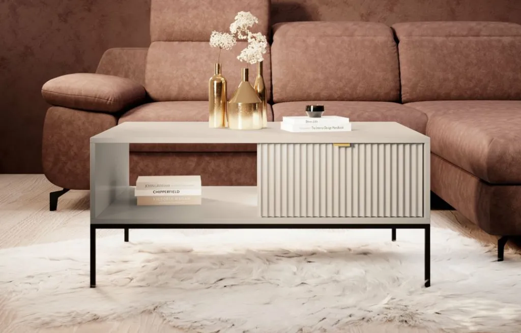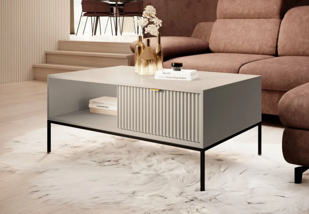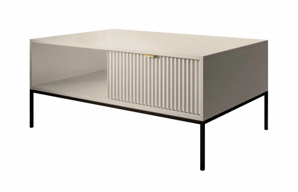 Salontafel Navil is een salontafel met een hotel-chique uitstraling. De tafel is uitgevoerd in de kleur beige met zwart metalen poten.