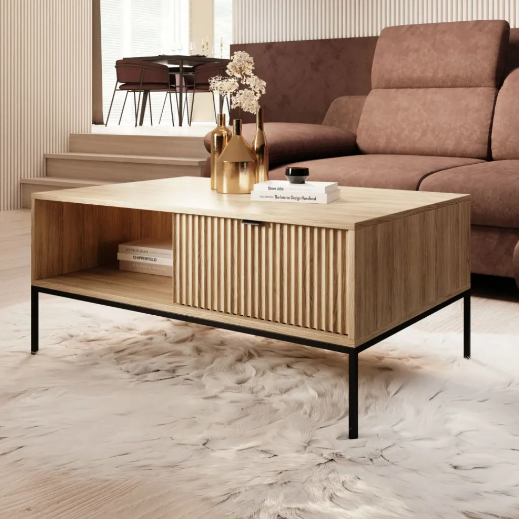 Het eikenpatroon in combinatie met het zwarte metalen onderstel en het metalen handvat zorgt voor een strak en functioneel geheel dat past binnen verschillende woonstijlen. De Navil salontafel is een praktische keuze voor wie een compacte salontafel zoekt met zowel zichtbare als afgesloten opbergruimte.