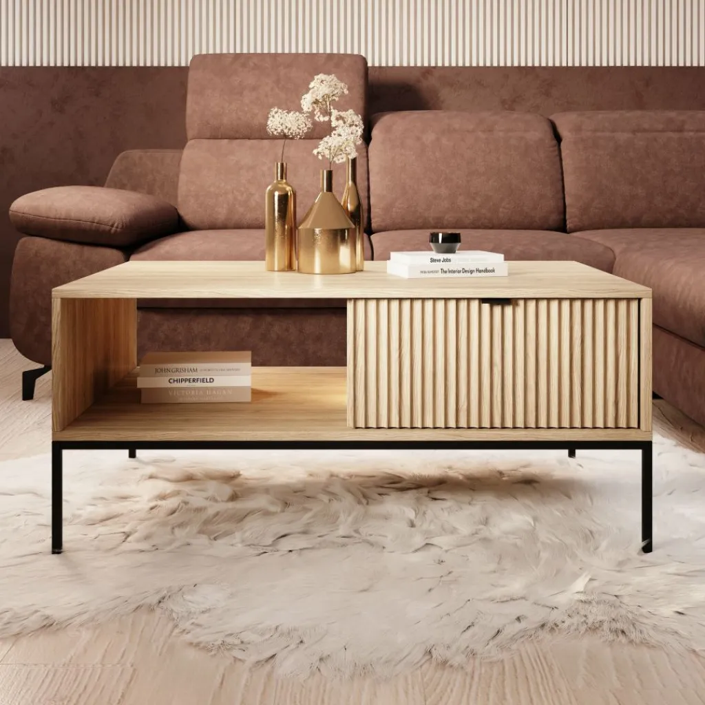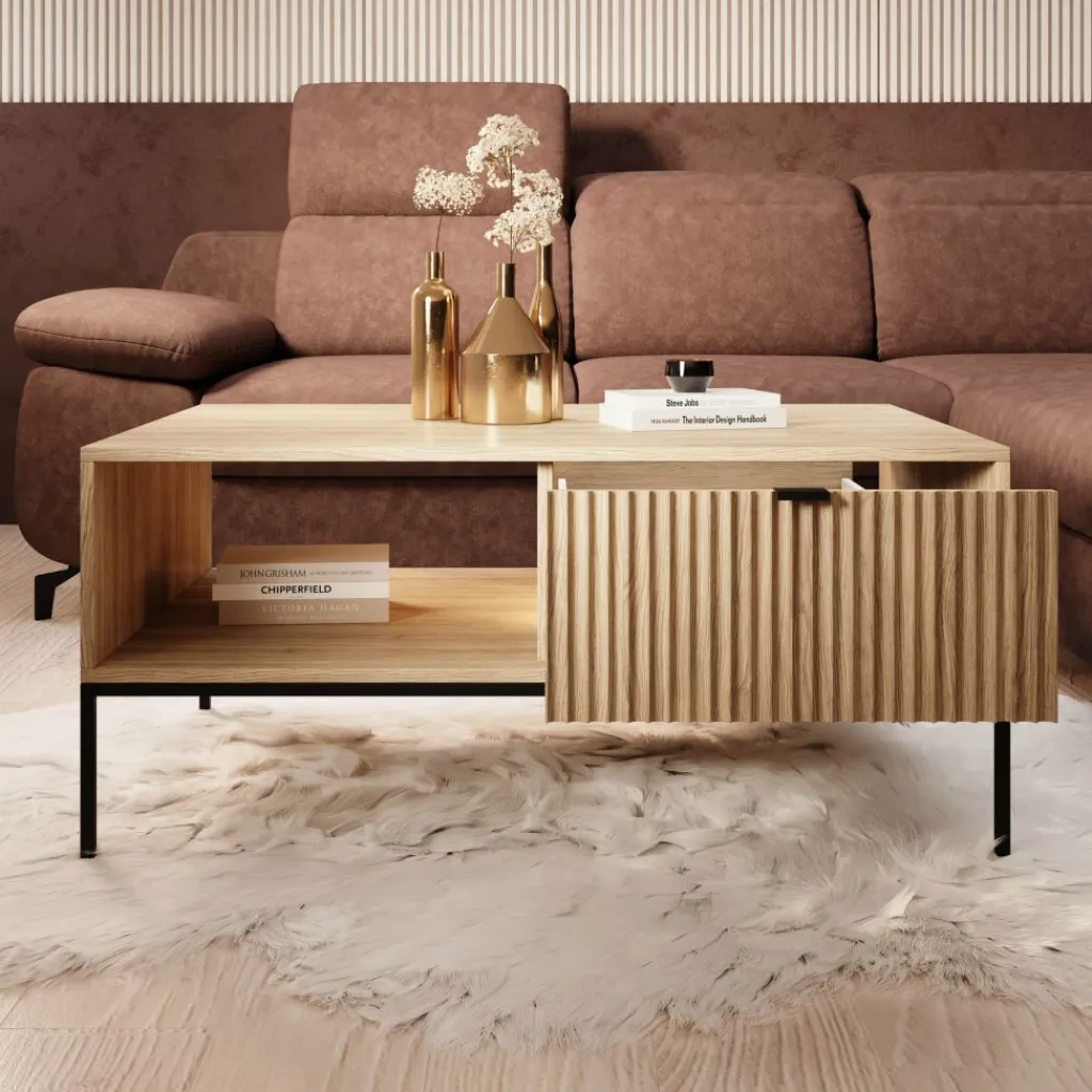 Het bovenblad heeft een maximale belastbaarheid van 7 kg en is geschikt voor decoratie, boeken of een dienblad. Aan de rechterzijde bevindt zich een lade met verticale ribbelstructuur, voorzien van een metalen handvat en met een maximale draagkracht van 2 kg. Aan de linkerzijde is een open opbergvak aanwezig, geschikt voor boeken, tijdschriften of accessoires, met een maximale belastbaarheid van 6 kg.