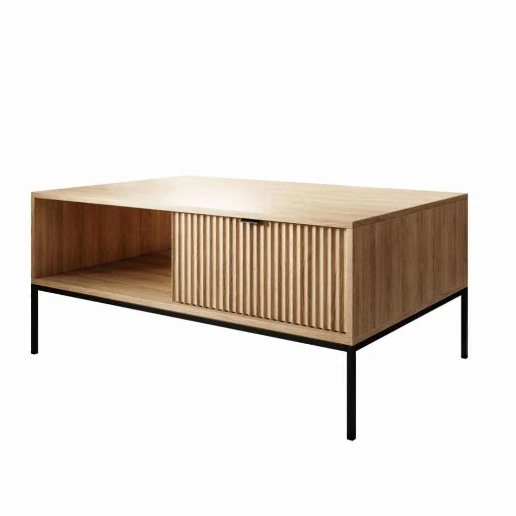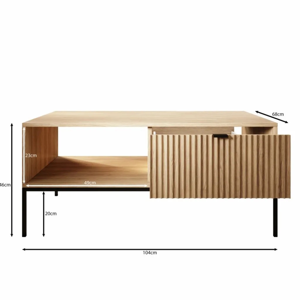 De Navil salontafel van Meubella is uitgevoerd in een eikenpatroon en heeft een afmeting van 104 × 68 × 46 cm. De tafel bestaat uit een rechthoekig blad met daaronder een open vak en een gesloten lade, geplaatst op een slank metalen frame. Door deze opbouw is er zowel ruimte voor dagelijks gebruik als voor het opbergen van spullen.