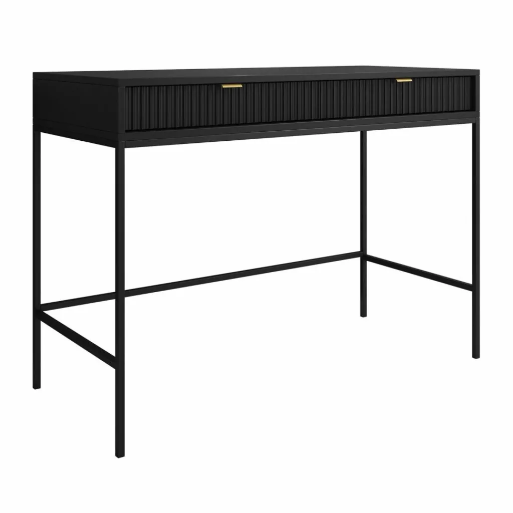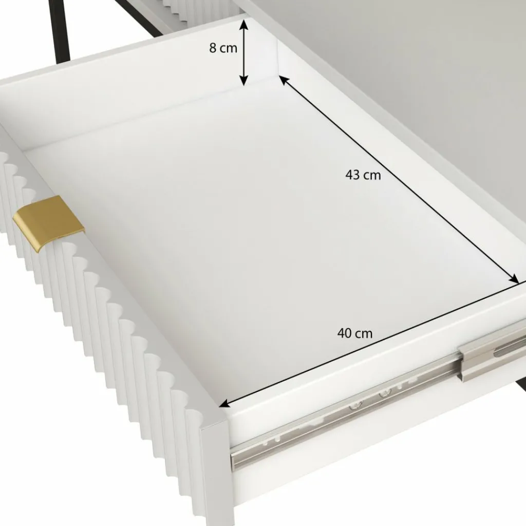 De Navil beschikt over twee ruime lades, afgewerkt met een verfijnd lattenpatroon op de voorzijde. De lades openen soepel met goudkleurige handgrepen, die een subtiele maar chique glans toevoegen aan het geheel.