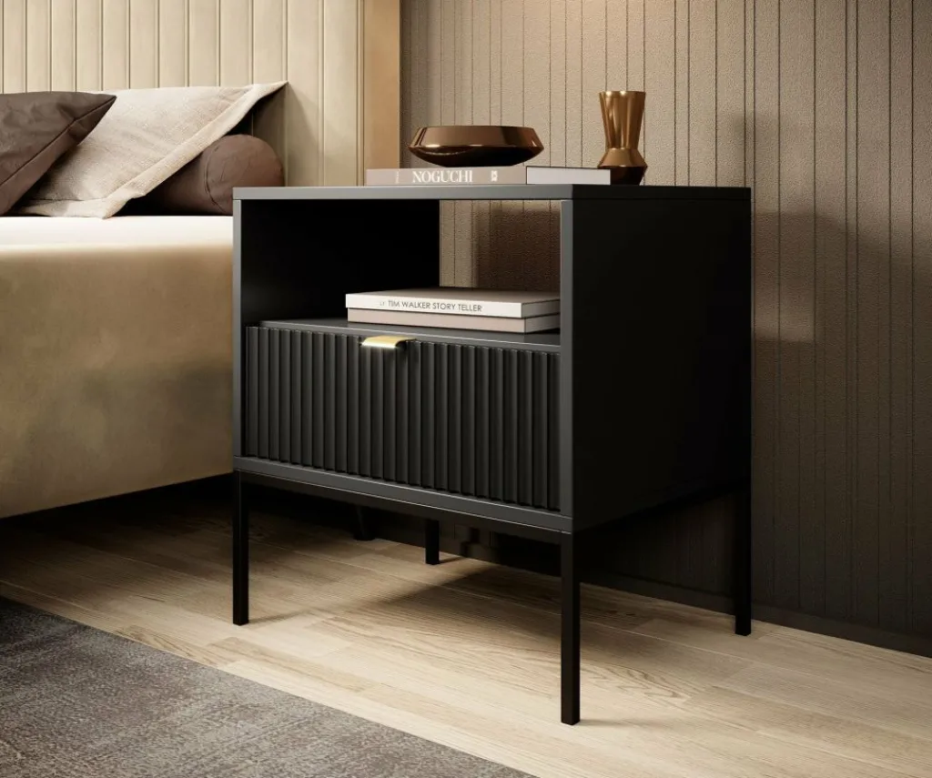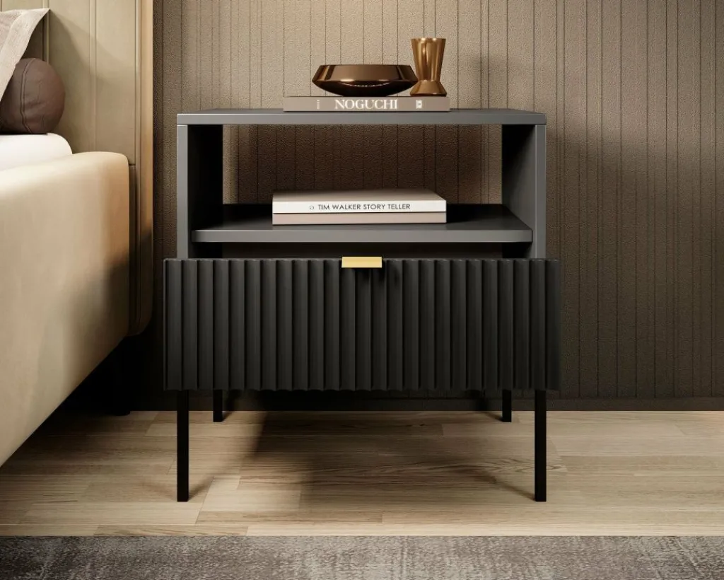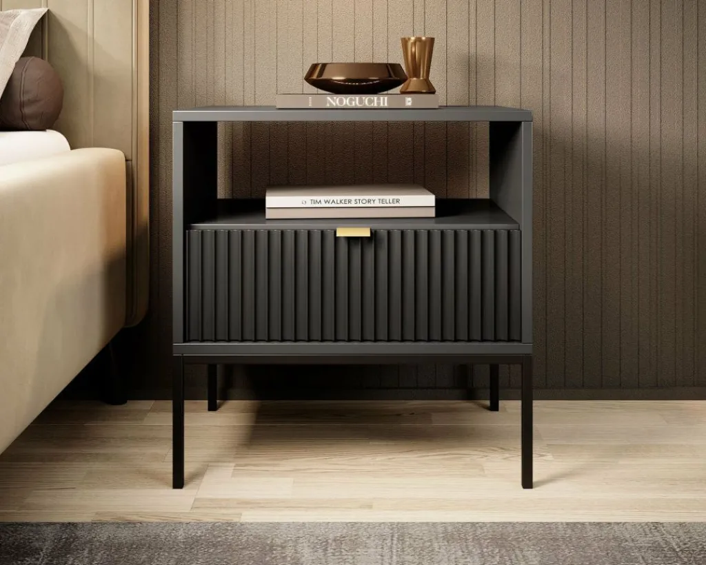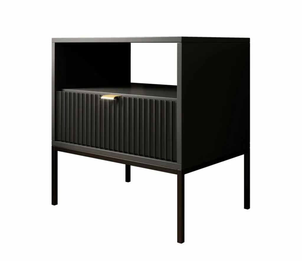 Nachtkastje Navil is een praktische opbergkast met voldoende opbergruimte. Onderin bevindt zich een handige opberglade, deze is te openen met een goudkleurige handgreep. Voor extra opbergruimte is er een open schap aanwezig bovenin het nachtkastje. Vanwege zijn design is het nachtkastje passend in elke soort slaapkamer.