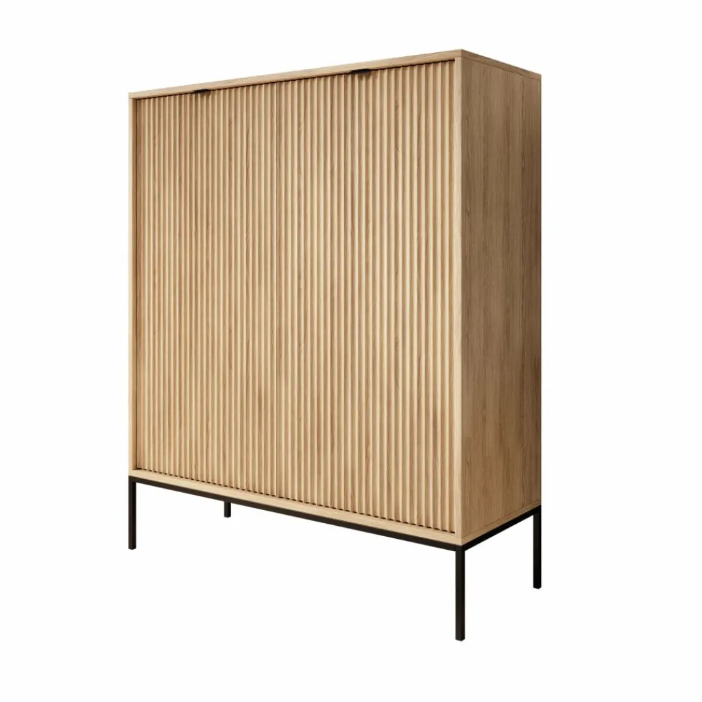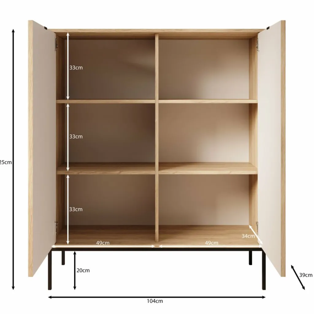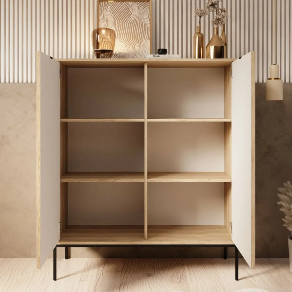 De combinatie van het eikenpatroon met het zwarte metalen onderstel zorgt voor een strak en functioneel geheel dat goed past binnen verschillende woonstijlen. De Navil dressoir is geschikt voor wie een hoge kast zoekt met een duidelijke indeling en praktisch afgestemde draagvermogens per opbergvak.