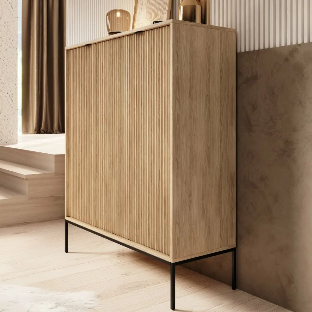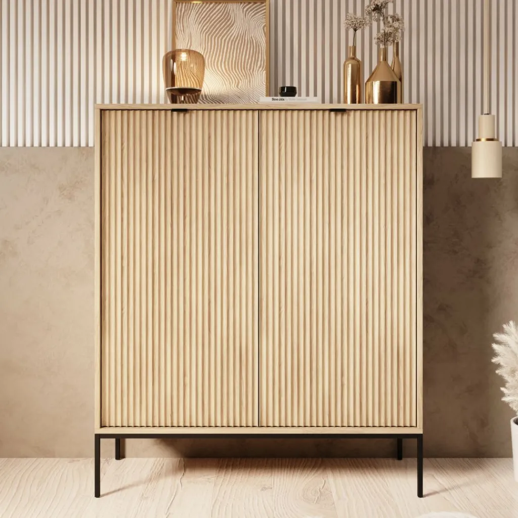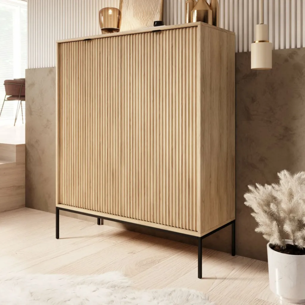 De combinatie van het eikenpatroon met het zwarte metalen onderstel zorgt voor een strak en functioneel geheel dat goed past binnen verschillende woonstijlen. De Navil dressoir is geschikt voor wie een hoge kast zoekt met een duidelijke indeling en praktisch afgestemde draagvermogens per opbergvak.