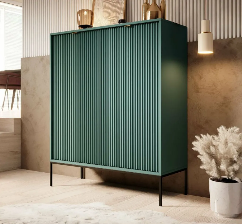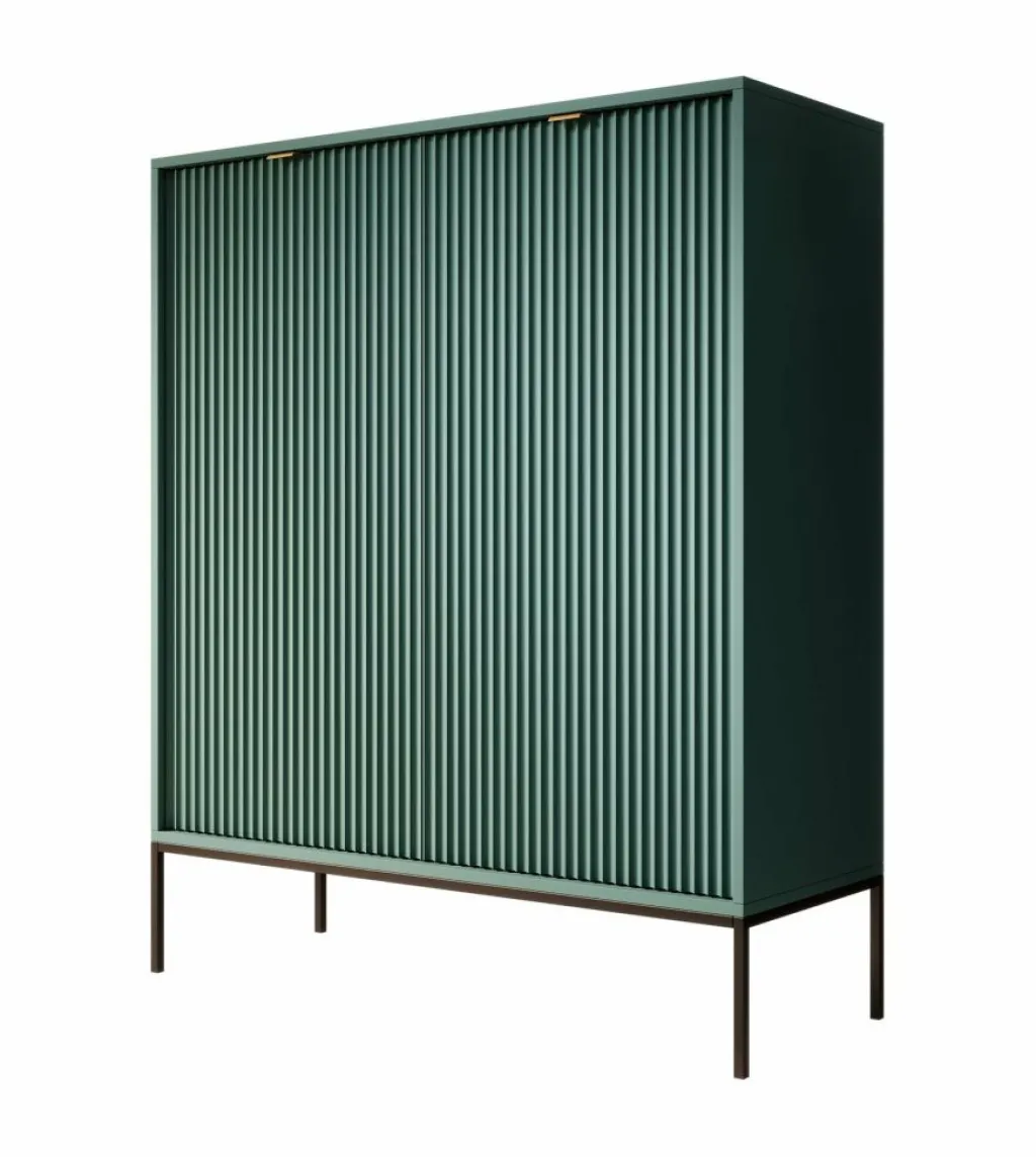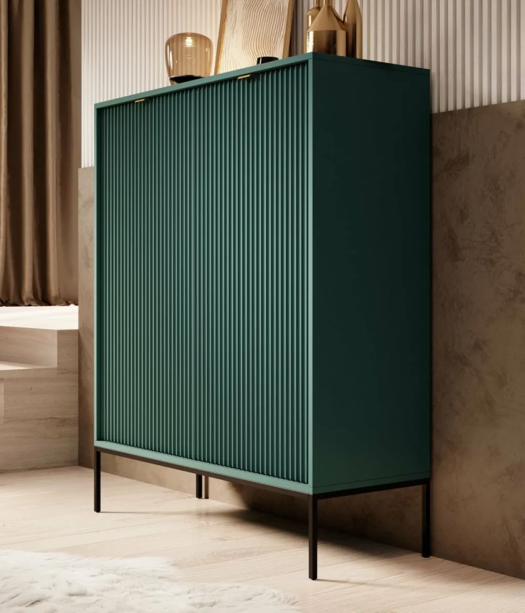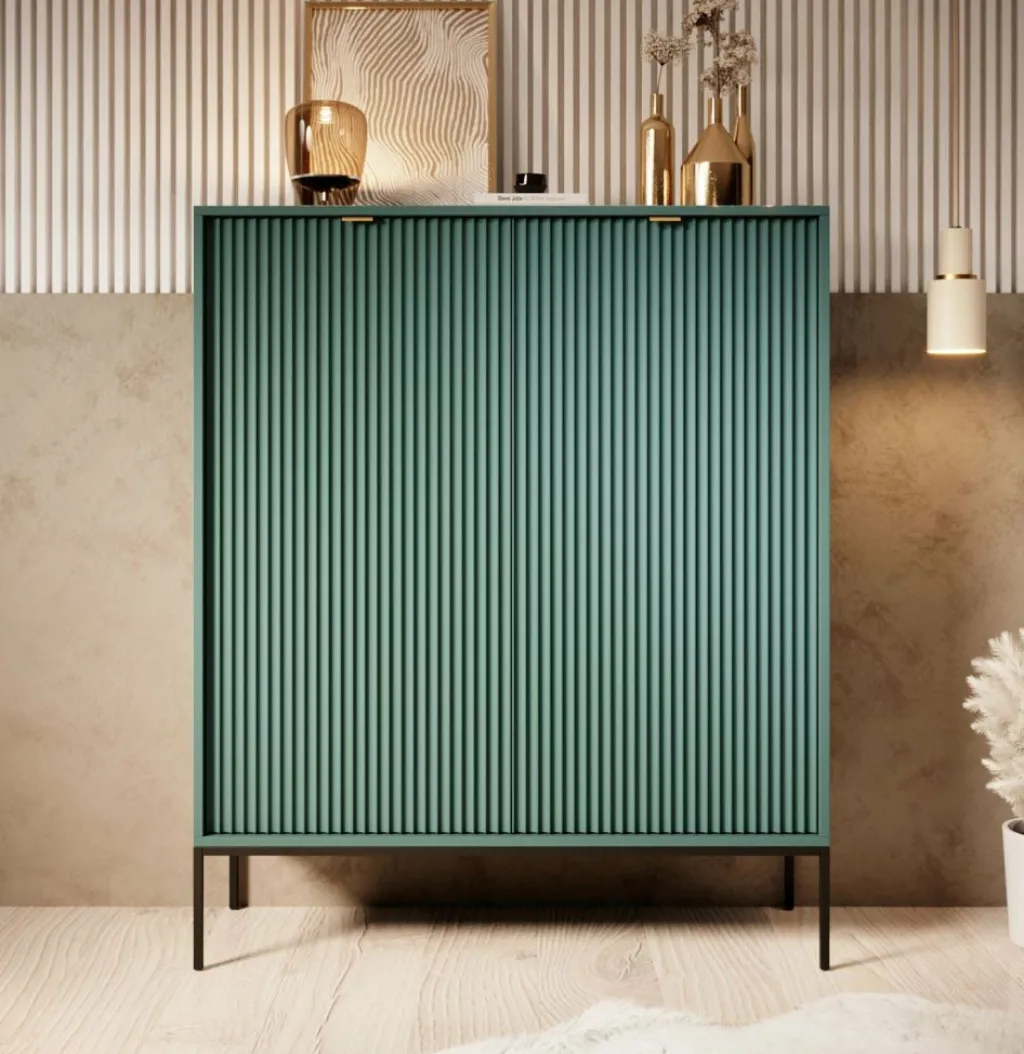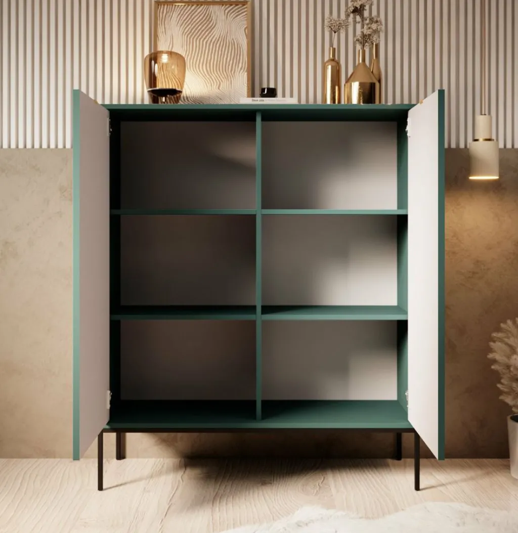 Dressoir Navil is een moderne designkast, uitgevoerd in een groene kleur. De kast beschikt over twee openslaande deuren met daarachter 6 opbergvakken. De deuren openen door middel van goudkleurige handgrepen. De kast staat op zwarte hoge pootjes. Door het strakke en eenvoudige design is dit meubel vooral passend binnen een industriële en hotelchique woonstijl.