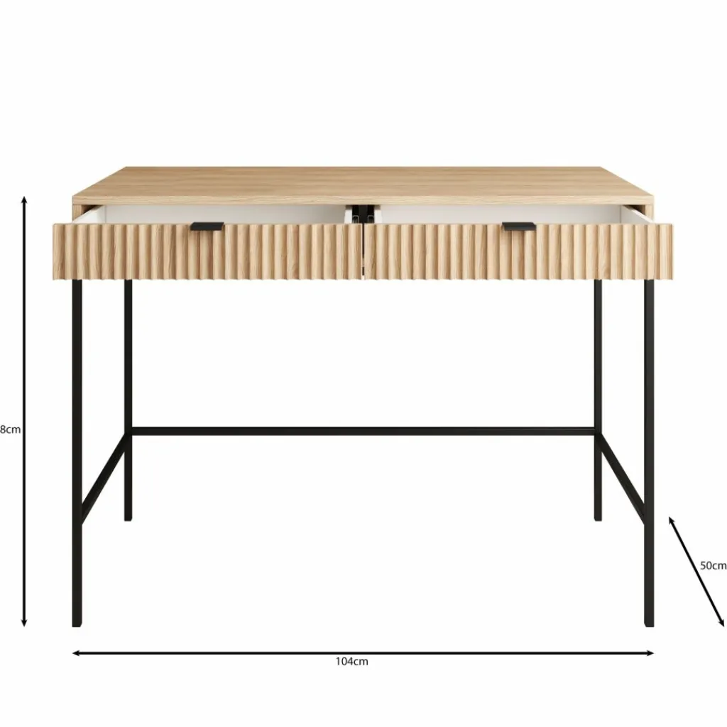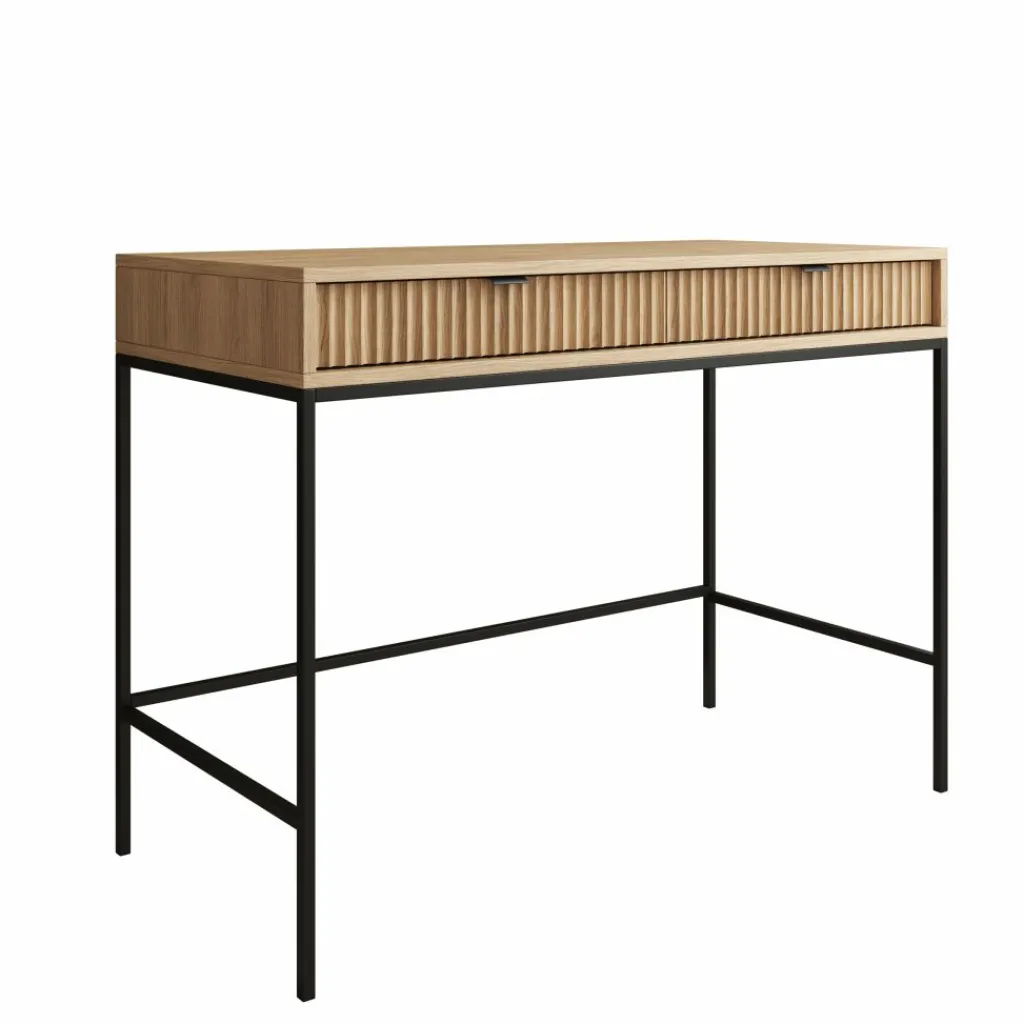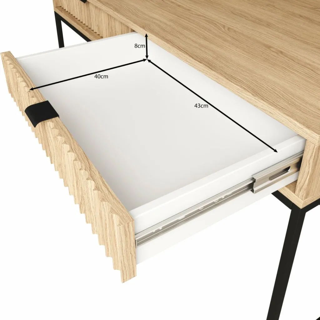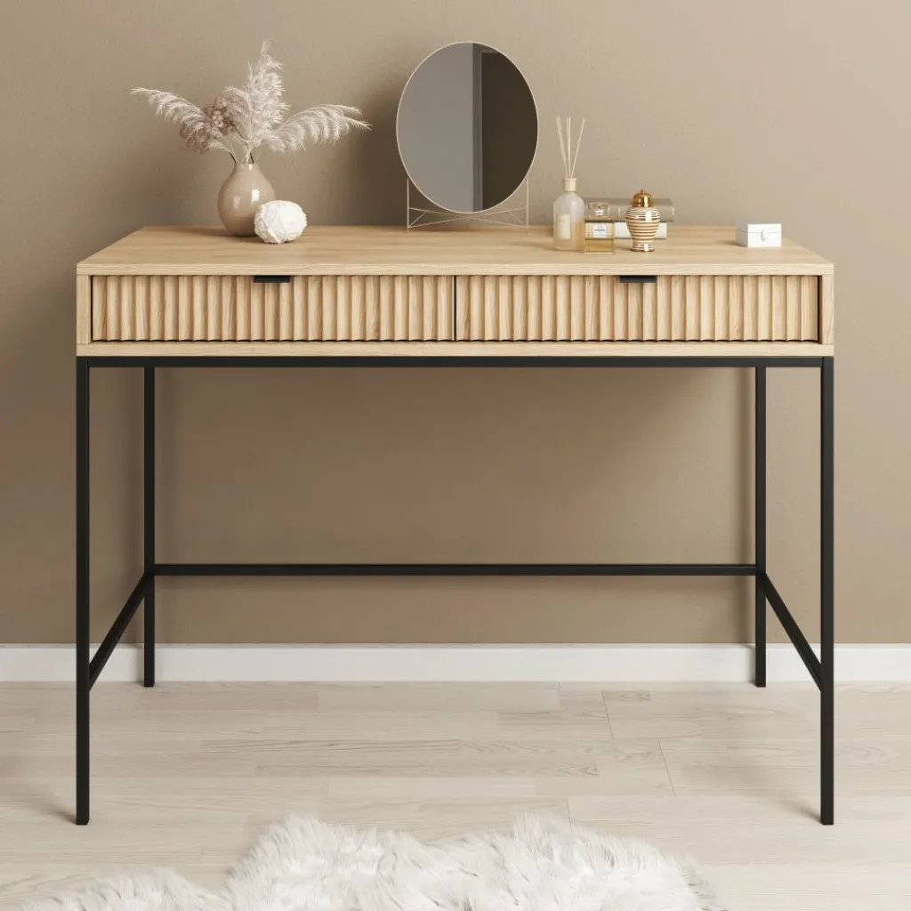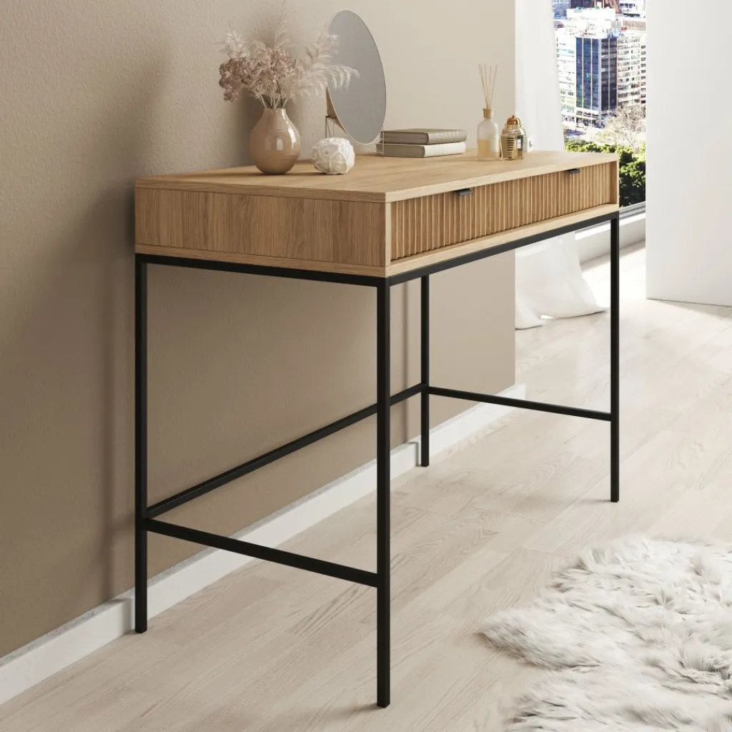 De combinatie van het eikenpatroon met het zwarte metalen onderstel en de metalen handgrepen zorgt voor een strak en functioneel geheel dat past binnen verschillende interieurstijlen. De Navil kaptafel is geschikt voor wie een compact meubel zoekt met praktische opbergruimte en een duidelijke, rechte vormgeving.