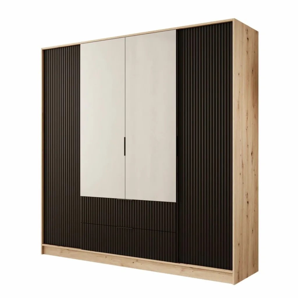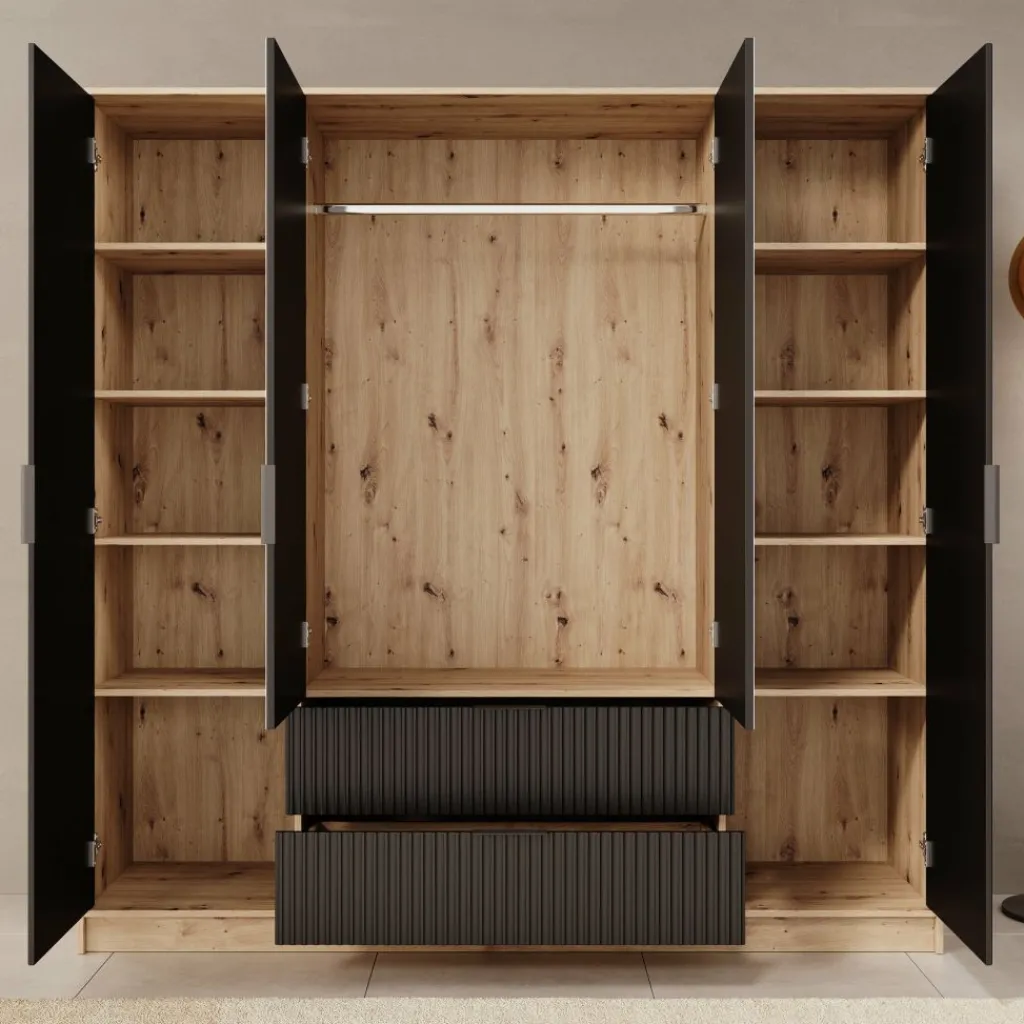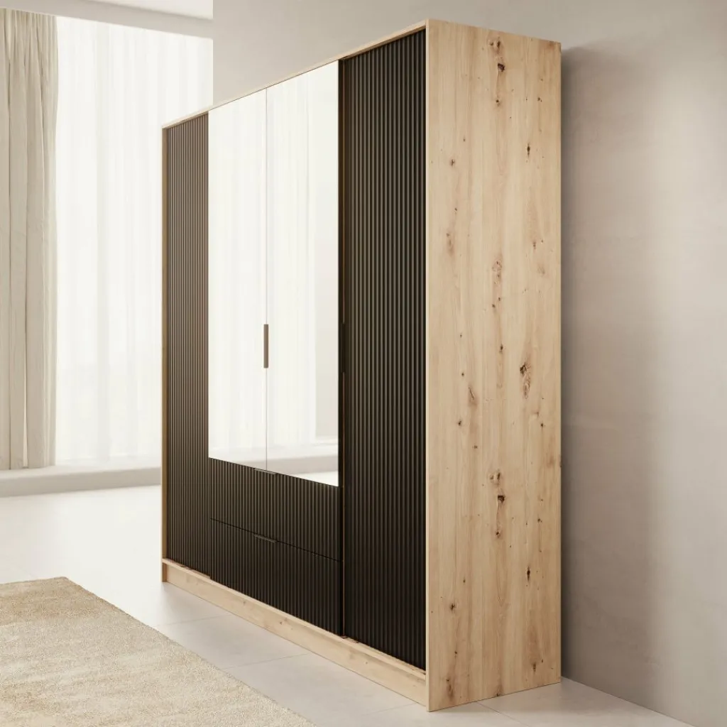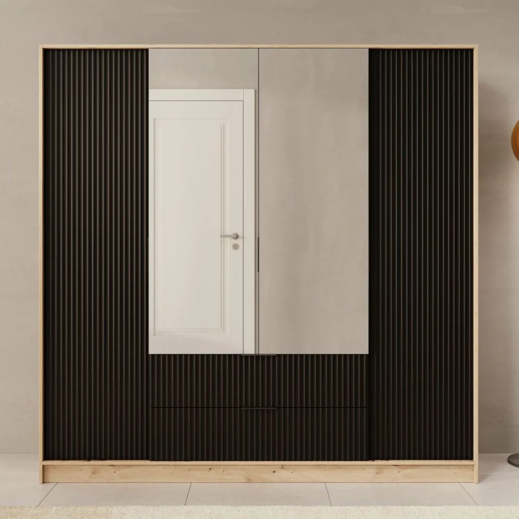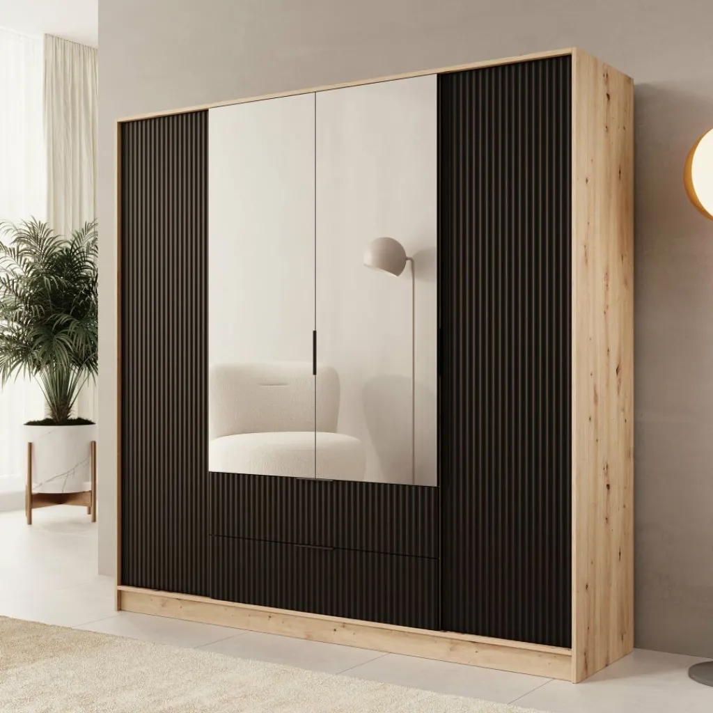 De Negroni kledingkast met vier deuren combineert een warme eikenlook met strakke zwarte fronten in een verfijnd lattenontwerp. De spiegeldeur in het midden voegt functionaliteit toe en laat de ruimte optisch groter ogen. De verticale lijnen geven de kast een moderne en rustige uitstraling, passend in zowel minimalistische als hedendaagse interieurs.