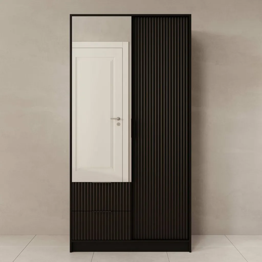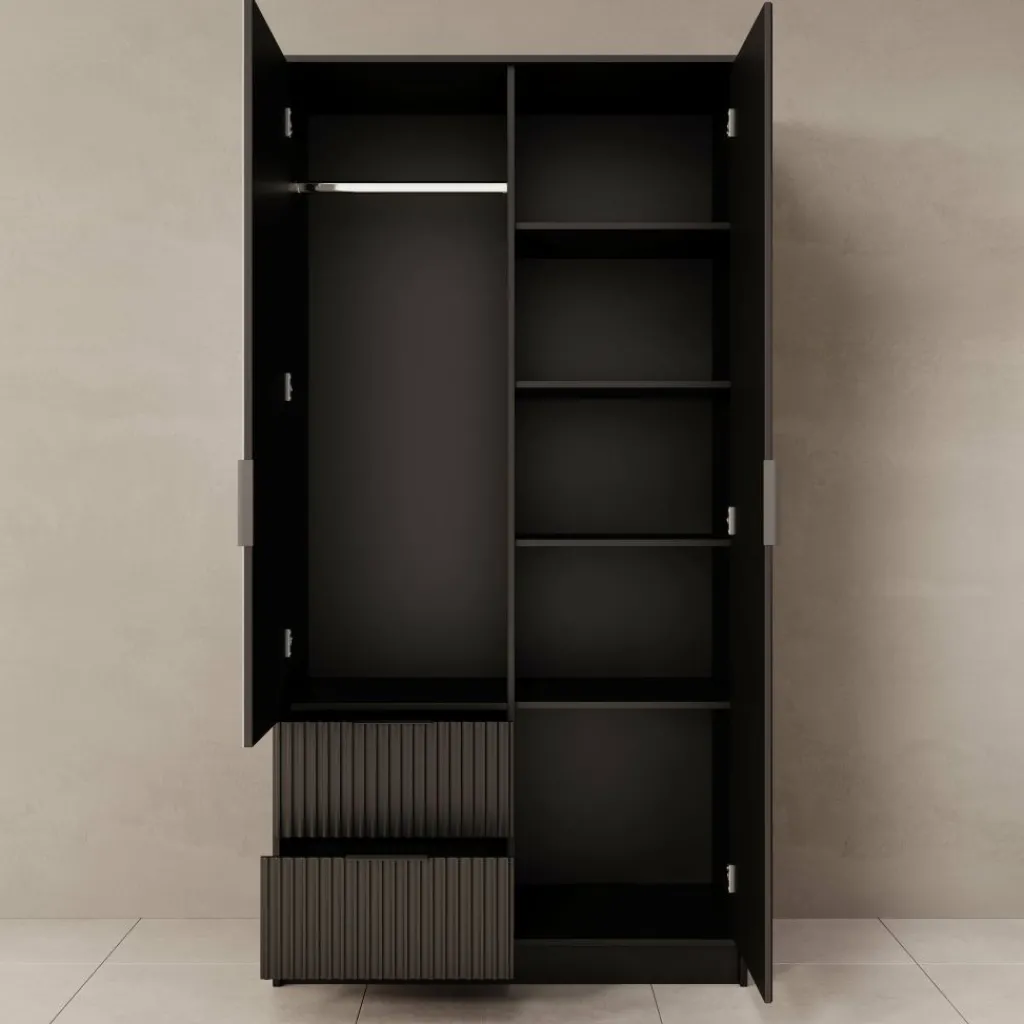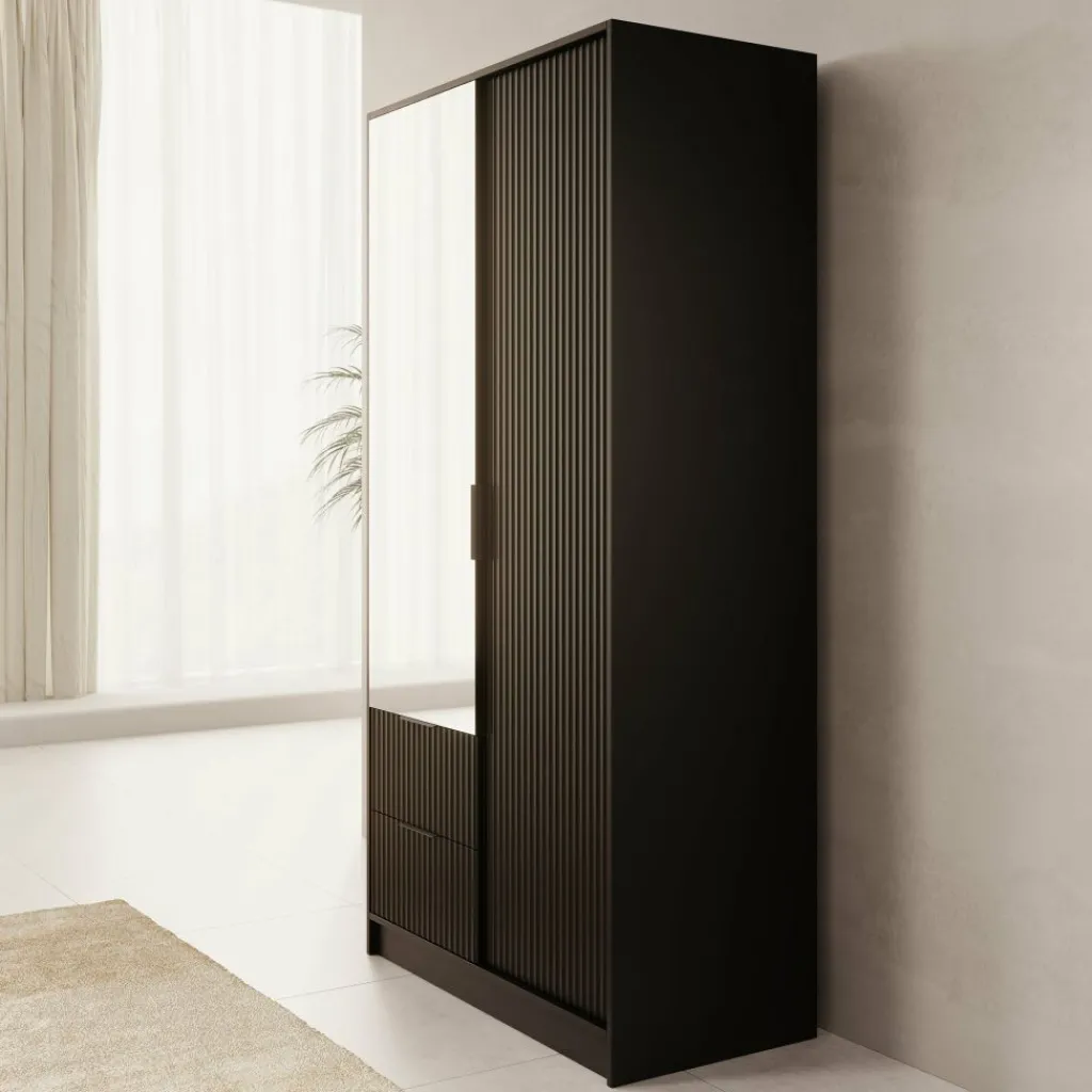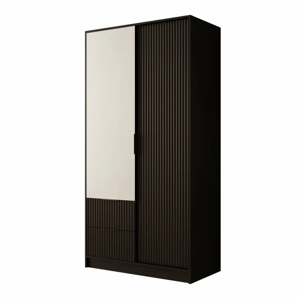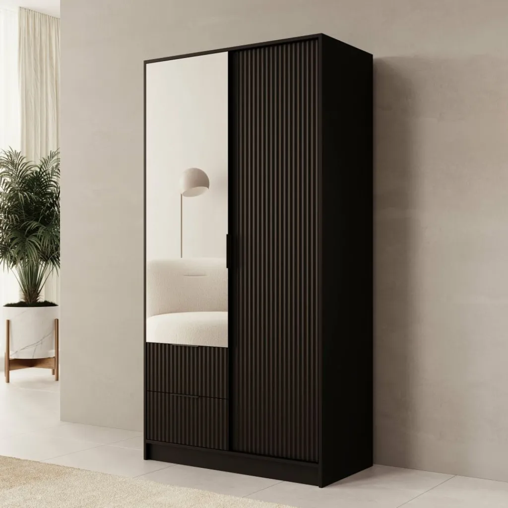 De Negroni kledingkast in zwart heeft een strak en modern ontwerp met verticale lijnen en een spiegeldeur die de ruimte optisch vergroot. Met een breedte van 102 cm en een hoogte van 200 cm biedt deze kast praktische opbergmogelijkheden voor de slaapkamer of hal.