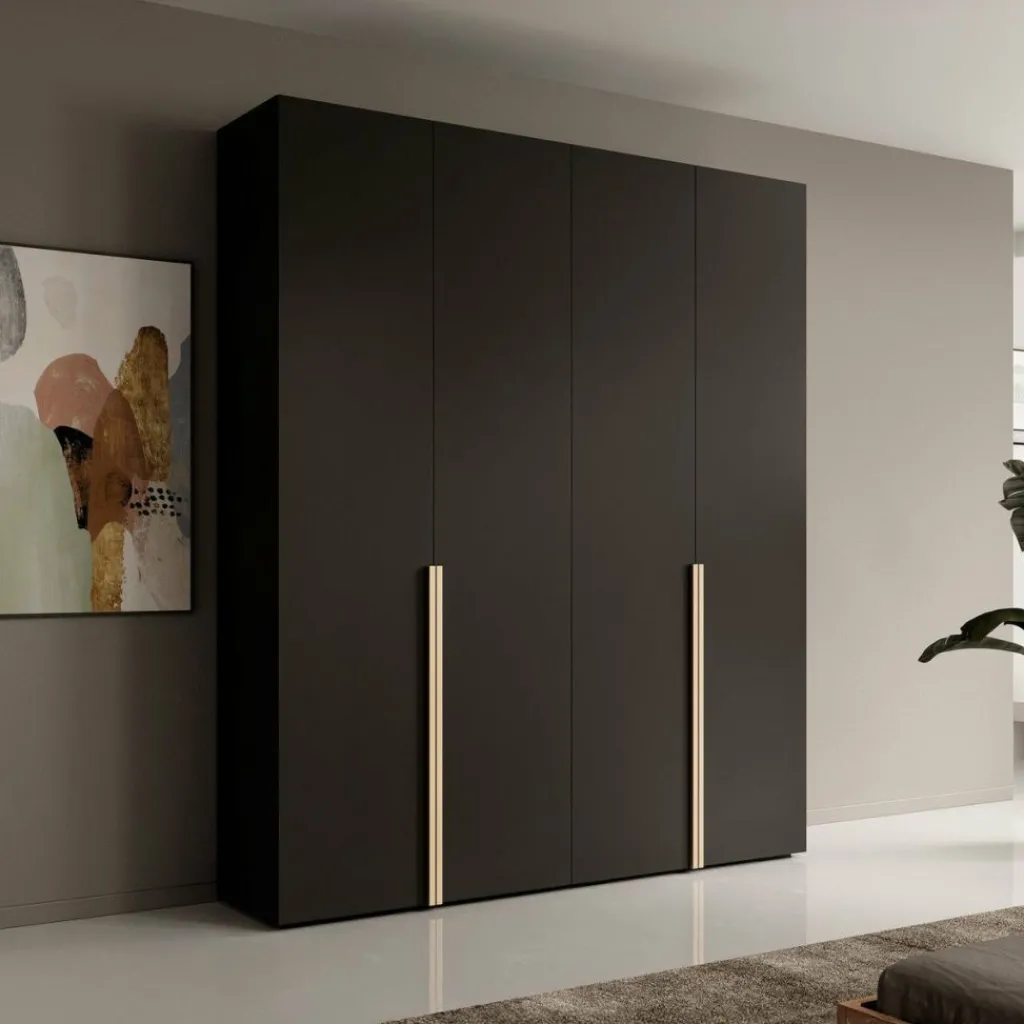 De Nexus kledingkast combineert strak design met praktische opbergruimte. Dankzij de matte zwarte afwerking krijgt de kast een moderne en stijlvolle uitstraling die perfect past in een eigentijdse slaapkamer. De hoge, slanke deuren met subtiele handgrepen zorgen voor een minimalistische look, terwijl de royale binnenruimte volop plek biedt voor kleding, schoenen en accessoires.
