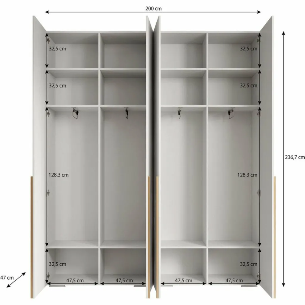 Met een breedte van 200 cm en een hoogte van 237 cm is Nexus ideaal voor wie graag alles netjes georganiseerd heeft. De kast is voorzien van legplanken en een handige kledingroede, zodat je eenvoudig een overzichtelijke indeling kunt maken. Een stijlvolle en functionele toevoeging aan elke slaapkamer.