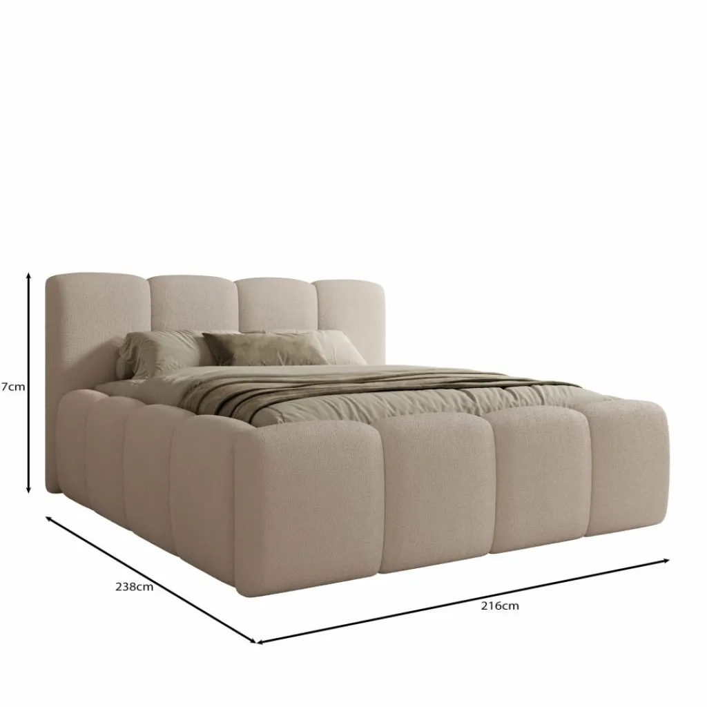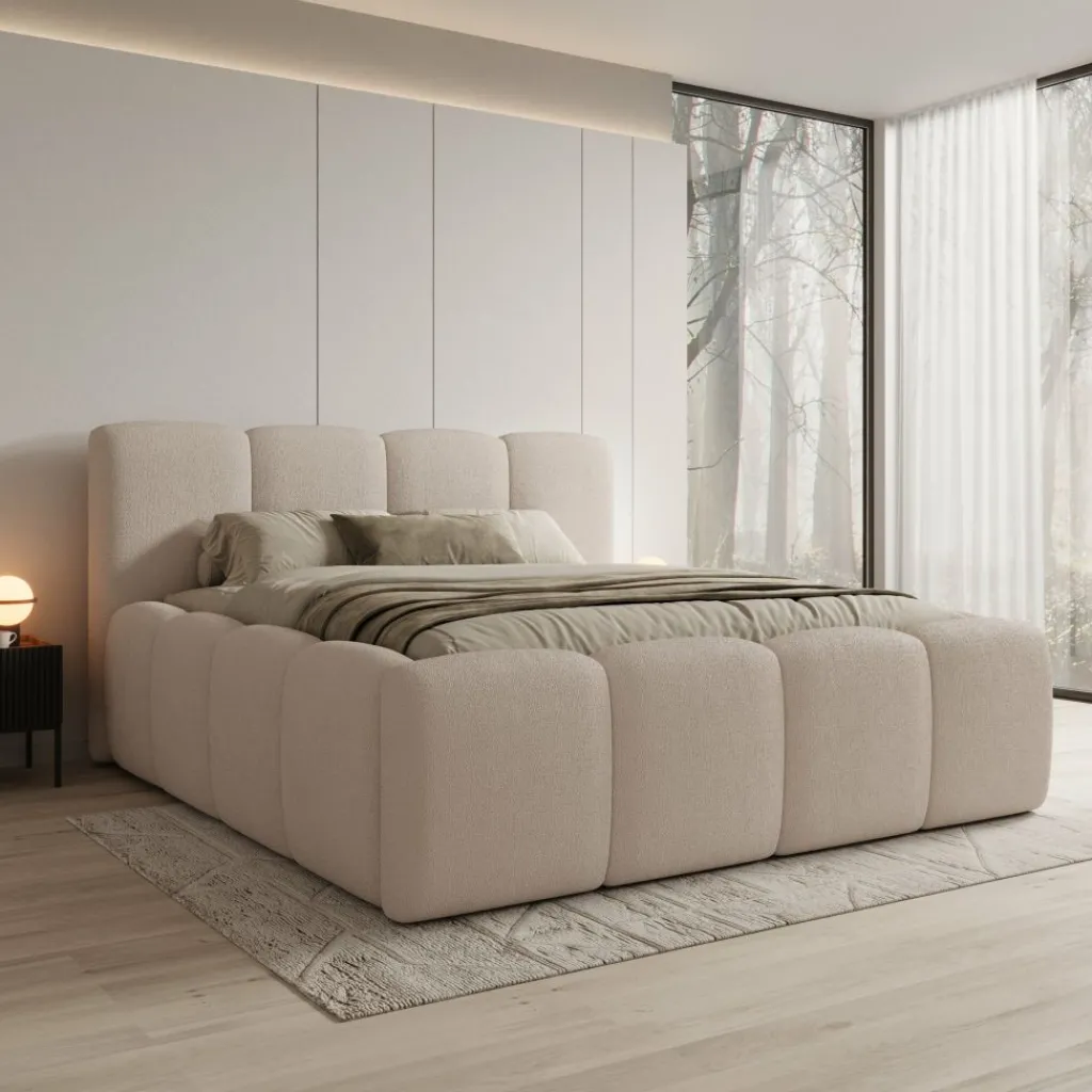 Het grotere formaat geeft het bed een stevige, royale basis. De omlijsting rondom het matras volgt dezelfde zachte blokvormen als het hoofdbord, waardoor het geheel naadloos in elkaar overloopt. De constructie is stabiel en geschikt voor dagelijks gebruik. Het lage onderstel is subtiel weggewerkt zodat de vorm centraal blijft staan.
