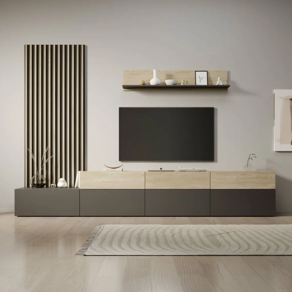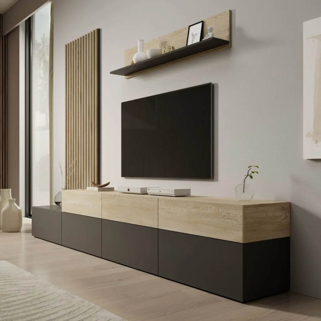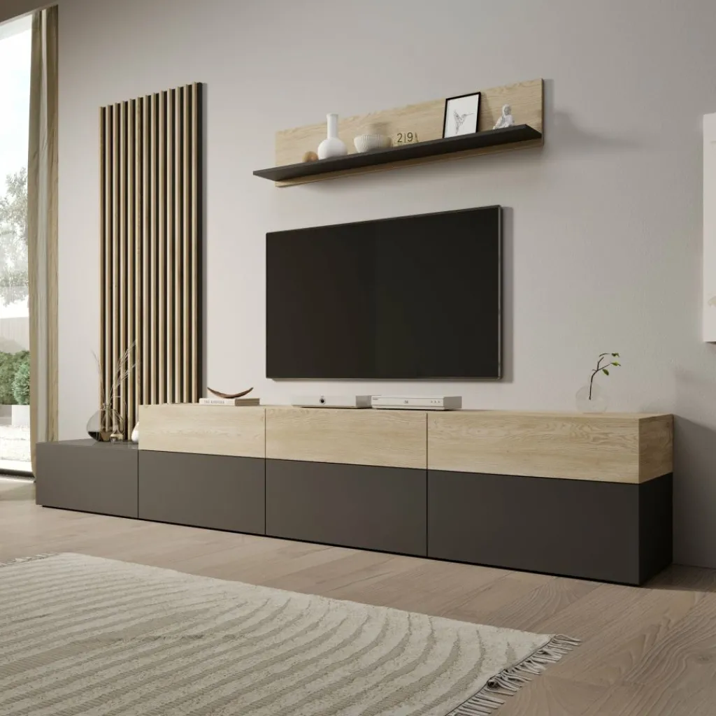 Door de combinatie van grijs en eikenpatroon past het Nobu wandmeubel goed binnen moderne interieurs. Het meubel is geschikt voor wie op zoek is naar een brede, complete wandoplossing waarbij opbergruimte, gebruiksgemak en tv-opstelling samenkomen in één vast geheel.