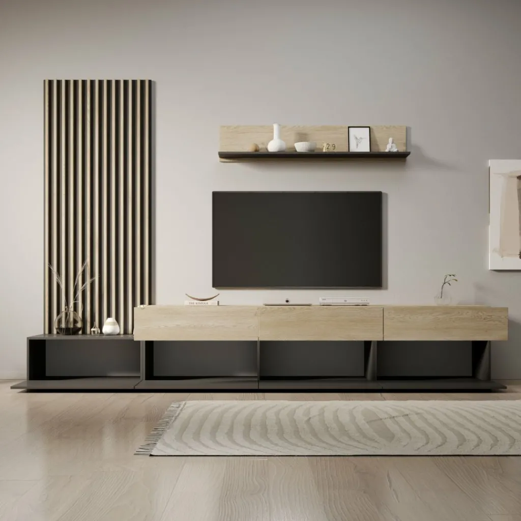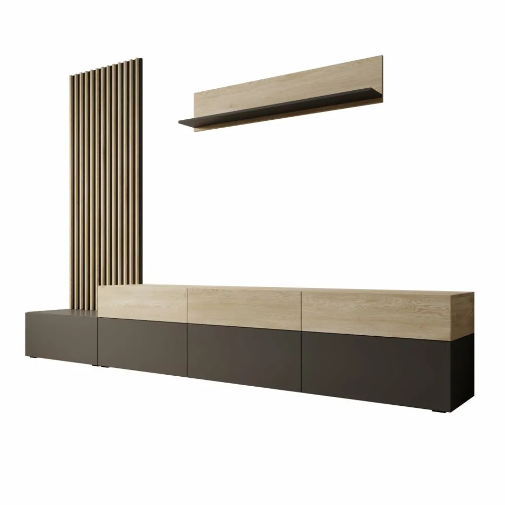 De wandplank is geschikt voor het plaatsen van decoratieve items en wordt boven de televisie gemonteerd. Het verticale paneel met lattenstructuur vormt een vast onderdeel van de opstelling en geeft de wand extra diepte en structuur.