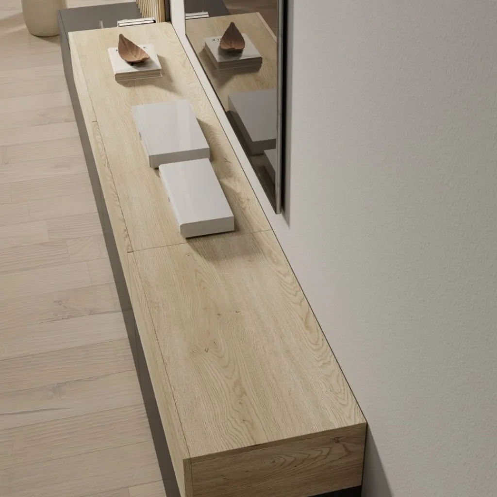 De lage kast biedt ruime, gesloten opbergruimte voor apparatuur en accessoires. De lades en kleppen zijn uitgevoerd met een push-to-open systeem, waardoor handgrepen niet nodig zijn en het meubel een strak en rustig front behoudt. Het bovenblad is afgewerkt in eikenpatroon en sluit visueel aan op de wandplank en het lattenpaneel.
