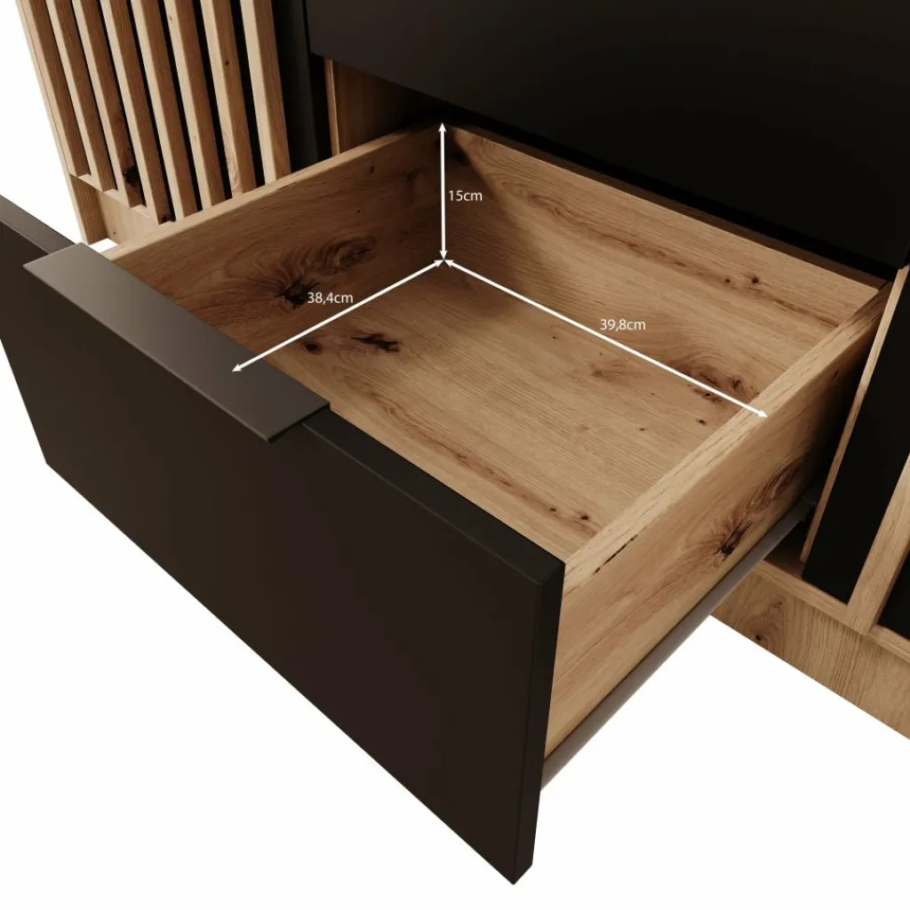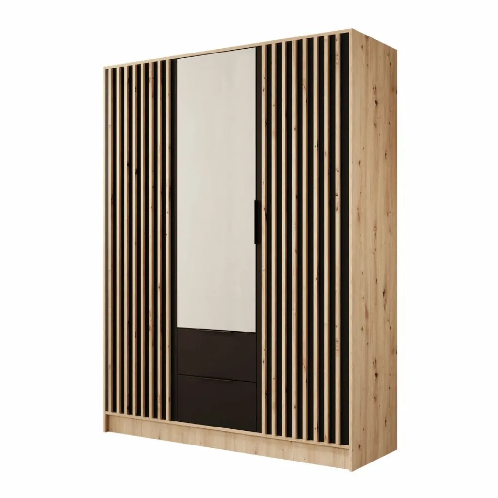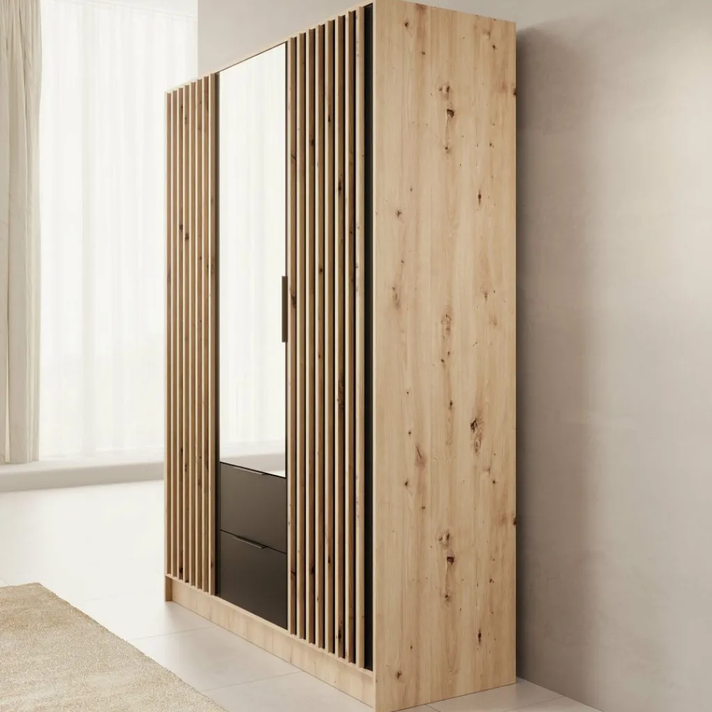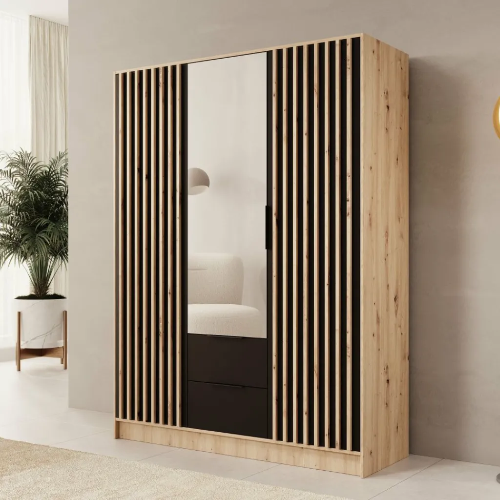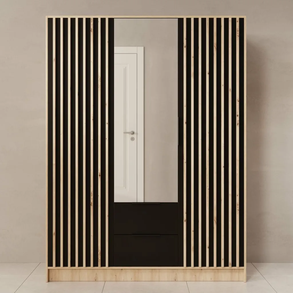 De Nocturna kledingkast valt op door de combinatie van een warme eikenlook, zwarte accenten en een strakke verticale latstructuur. De latten zijn onderdeel van het front zelf, waardoor het ontwerp rustig en strak oogt zonder losse elementen. De spiegeldeur in het midden maakt de kast extra praktisch tijdens het aankleden en laat de ruimte optisch groter lijken.