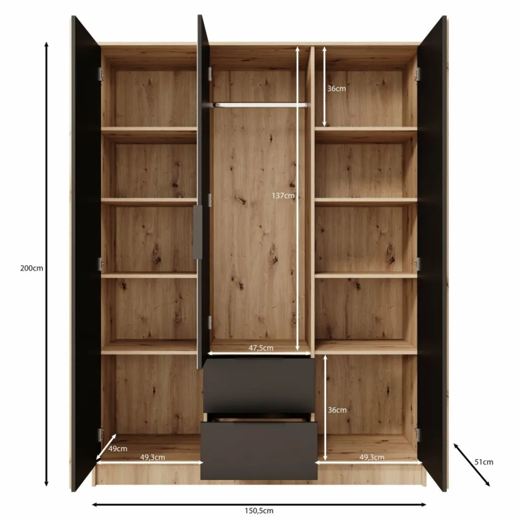 Achter de drie deuren bevindt zich een ruime indeling: meerdere legplanken voor stapels kleding of dozen én een hanggedeelte voor jassen en overhemden. Onderaan zitten twee lades die geschikt zijn voor kleinere items zoals sokken, accessoires of ondergoed.